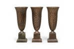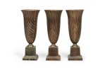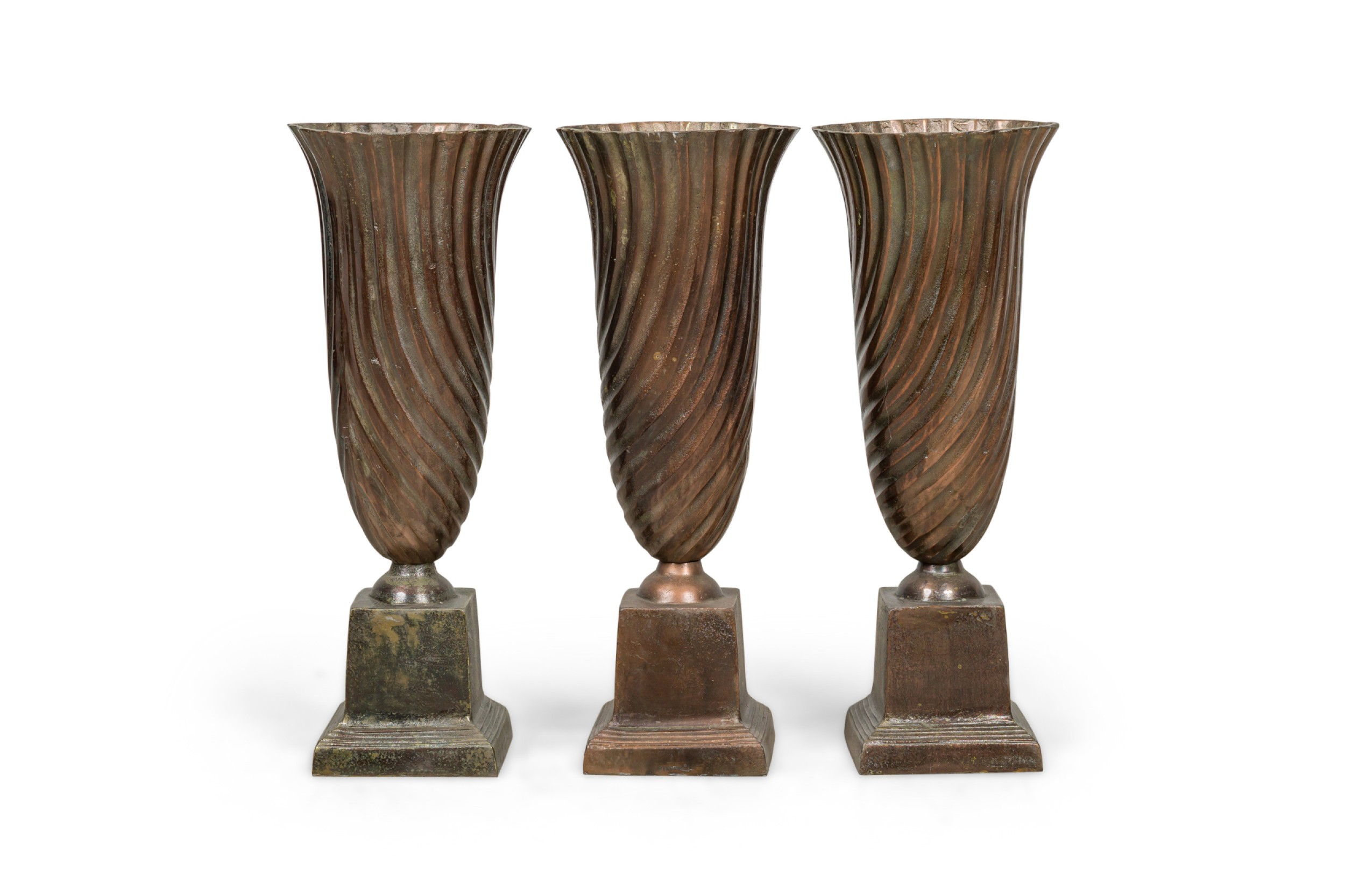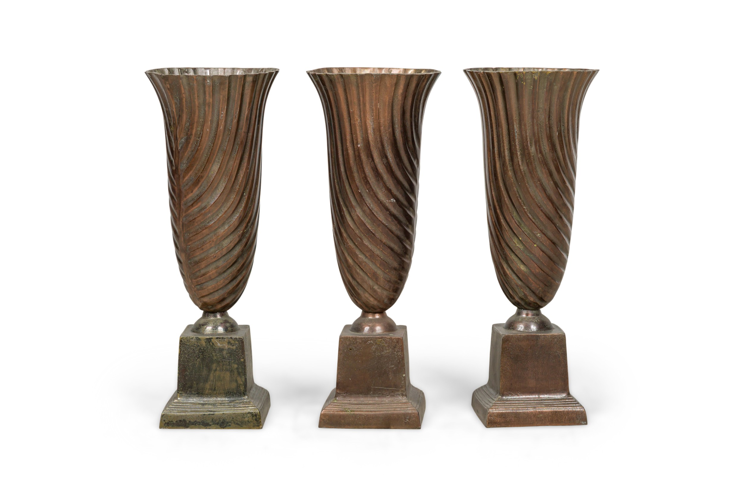 3 French Neo-classical Art Deco style tall brass vases with swirl / fluted design raised on a graduated square plinths. (PRICED EACH)
