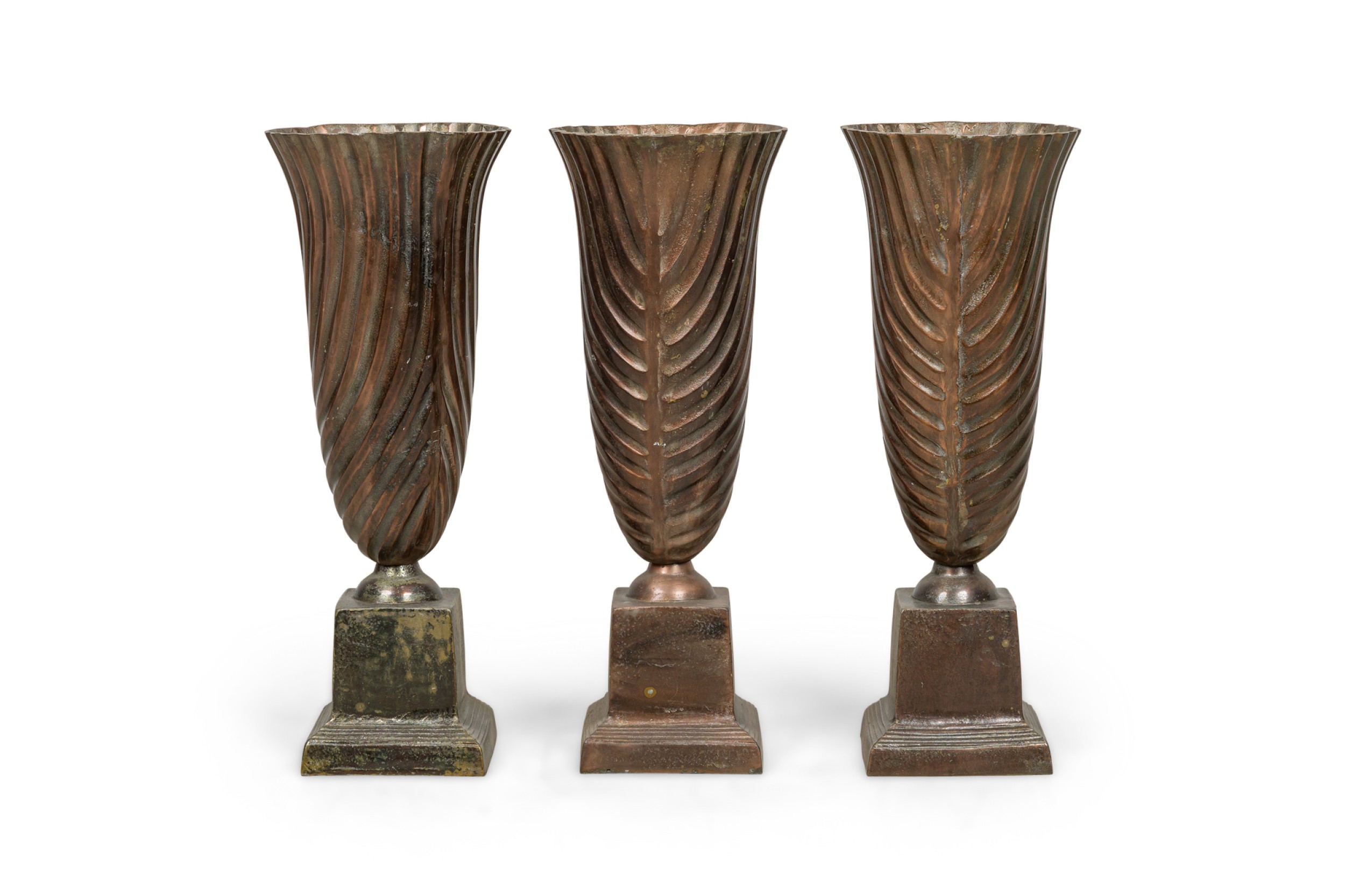 3 French Neo-classical Art Deco style tall brass vases with swirl / fluted design raised on a graduated square plinths. (PRICED EACH).