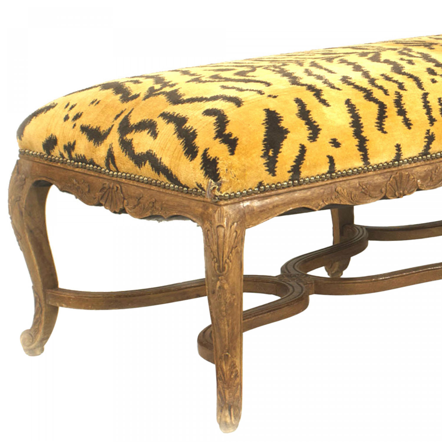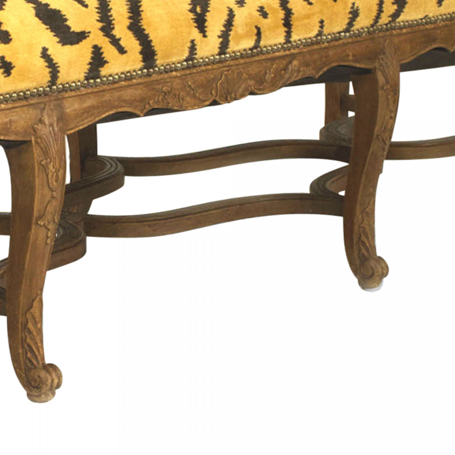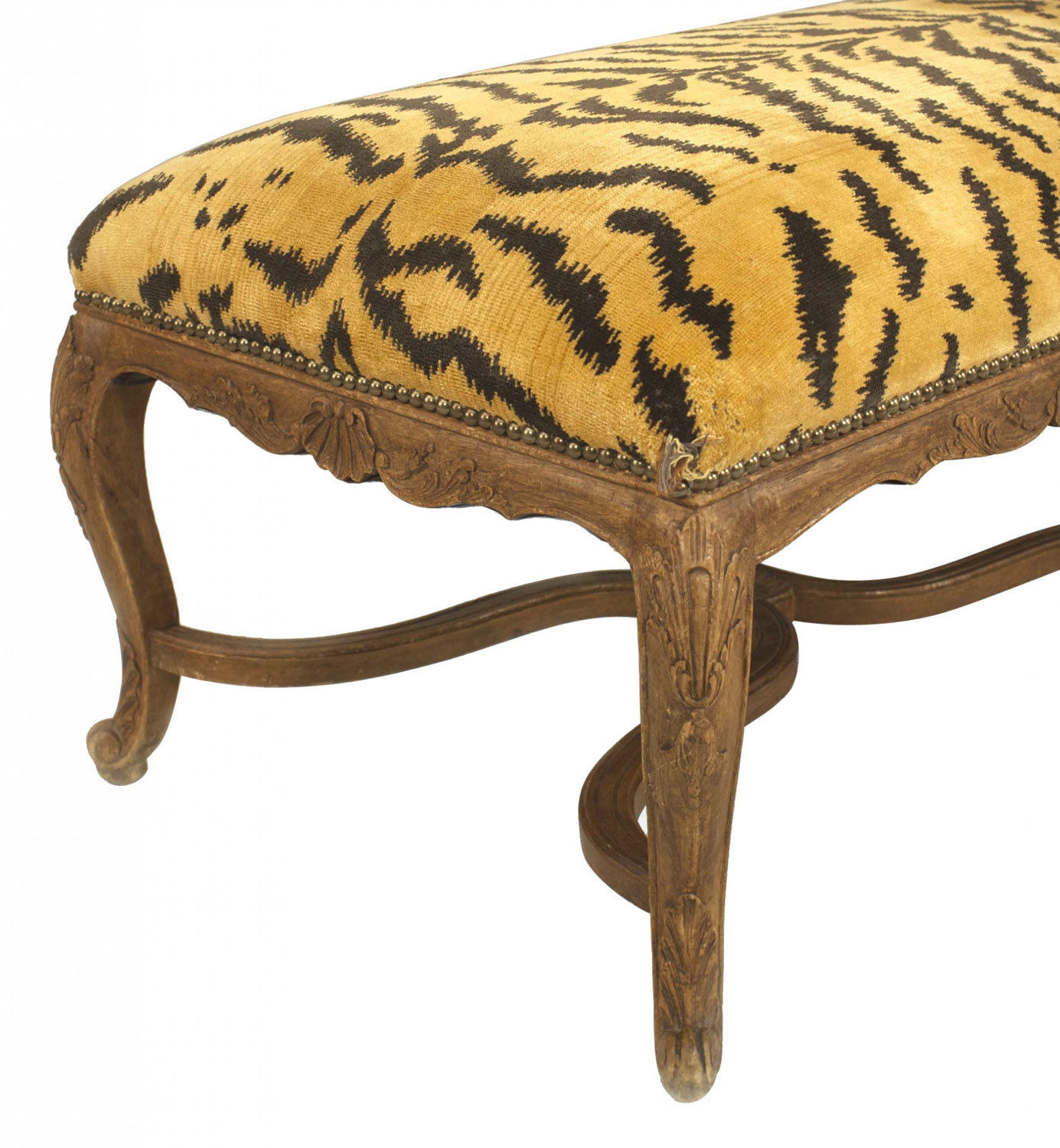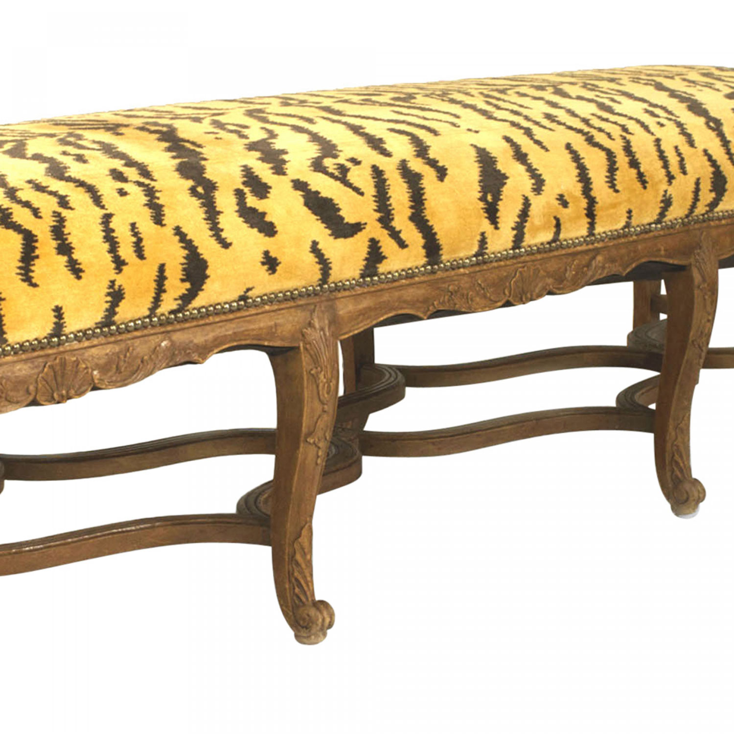 French Regence style (19/20th Century) walnut long 8 leg bench with a stretcher and a faux tiger upholstered seat.