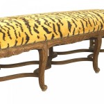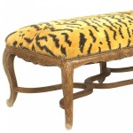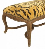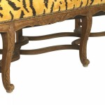 French Regence style (19/20th Century) walnut long 8 leg bench with a stretcher and a faux tiger upholstered seat
