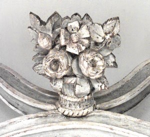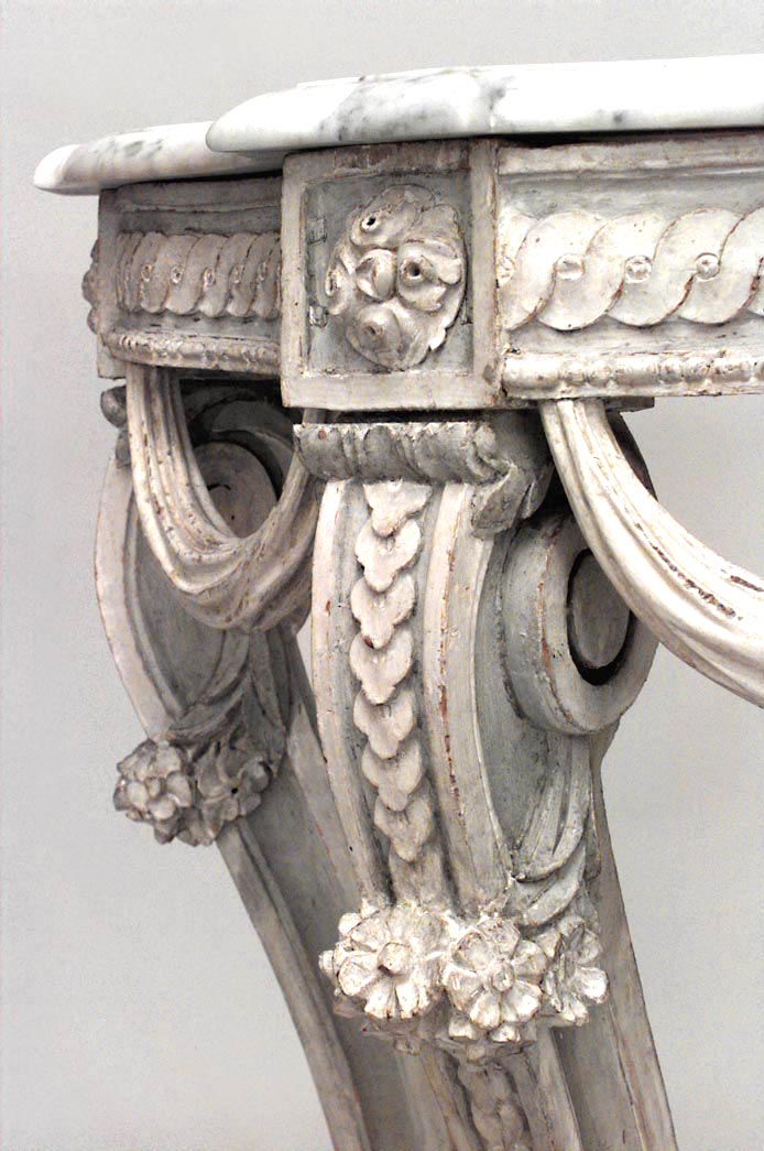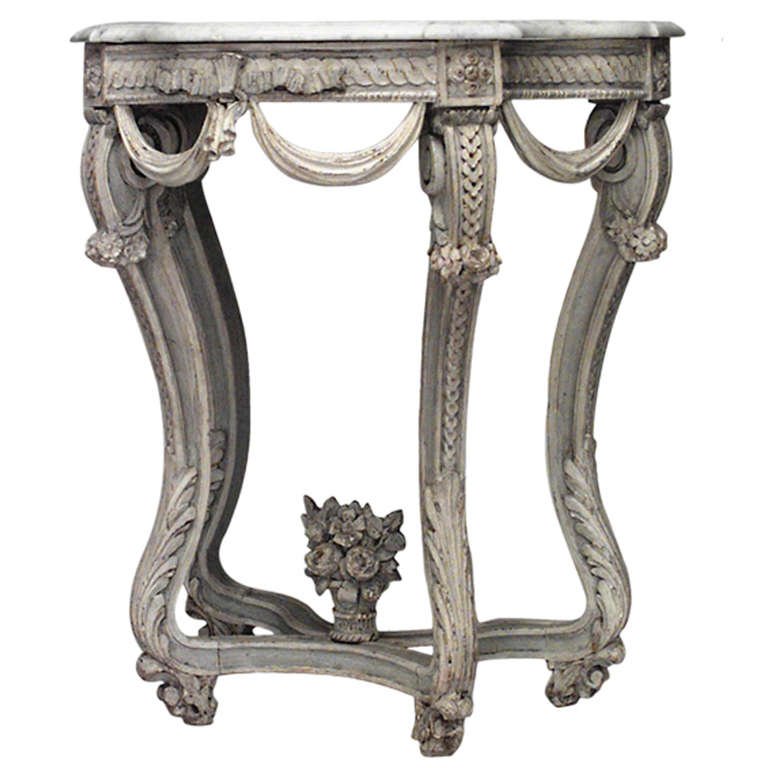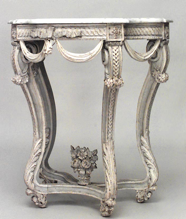 French Regence (18th Century) light blue & white painted serpentine shaped console table with white marble top and festoon design and stretcher with a centered urn having a floral arrangement..