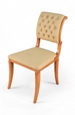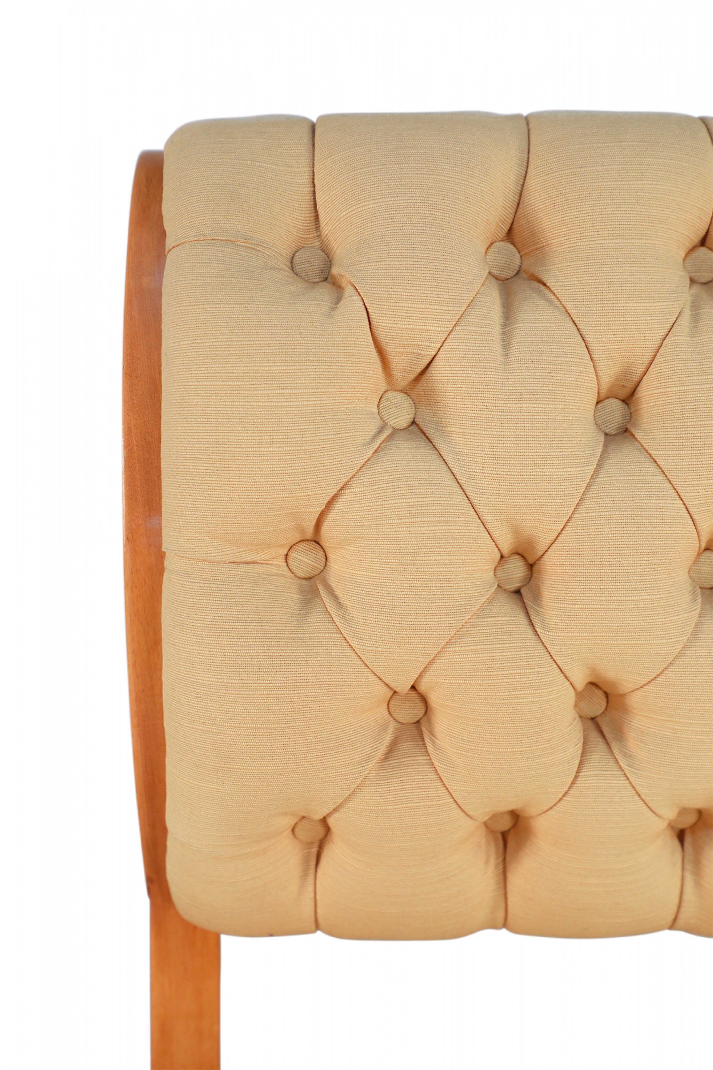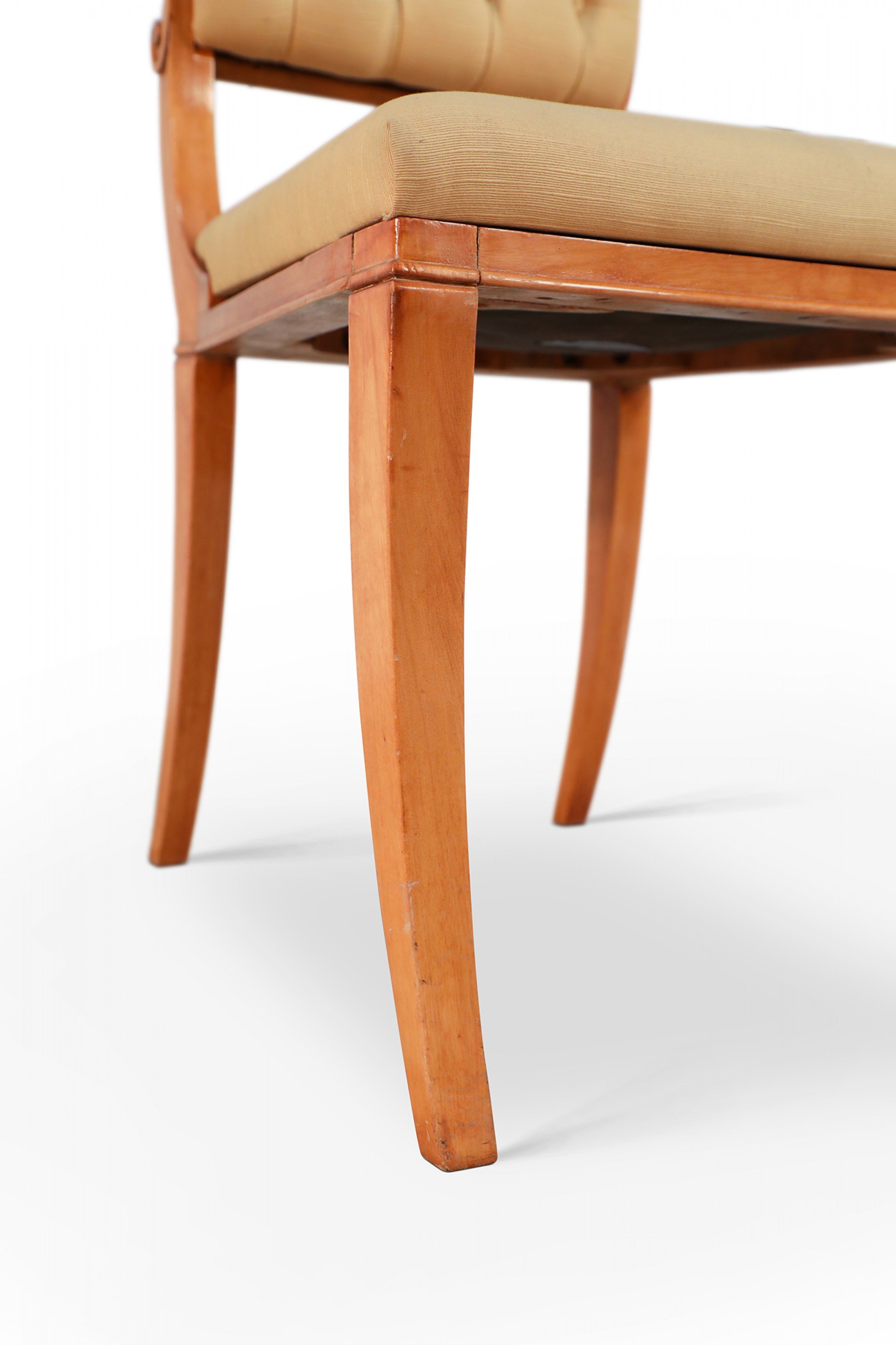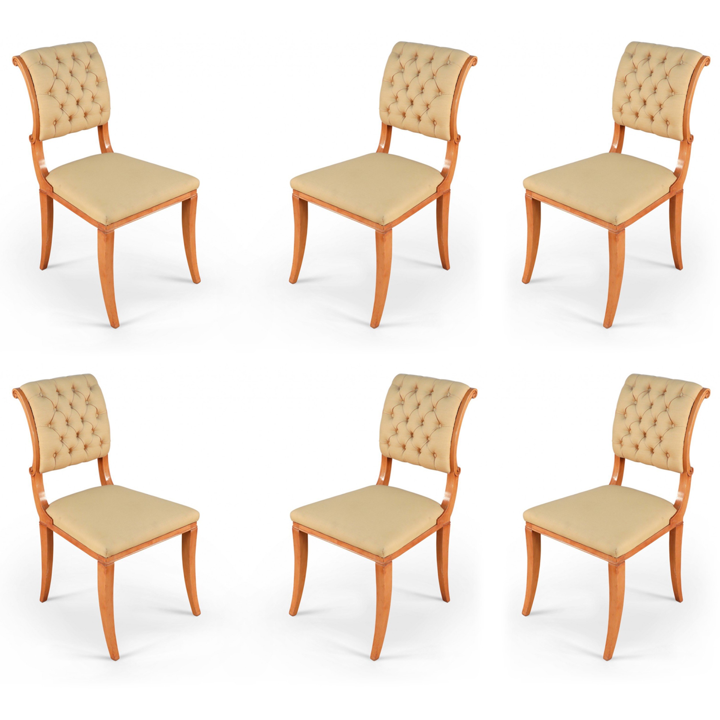 SET of 6 French 1940s sycamore side chairs with scrolled back upholstered in tufted beige silk on saber legs. (att: ANDRE ARBUS)