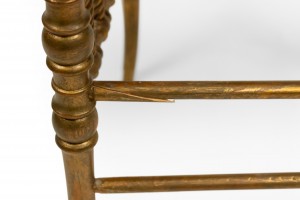 Style: French Materials & Techniques: Rope, gilt / giltwood, slat, woven Category: Seating, Office/Library, Dining Room Condition: There is a split in one of the leg supports.