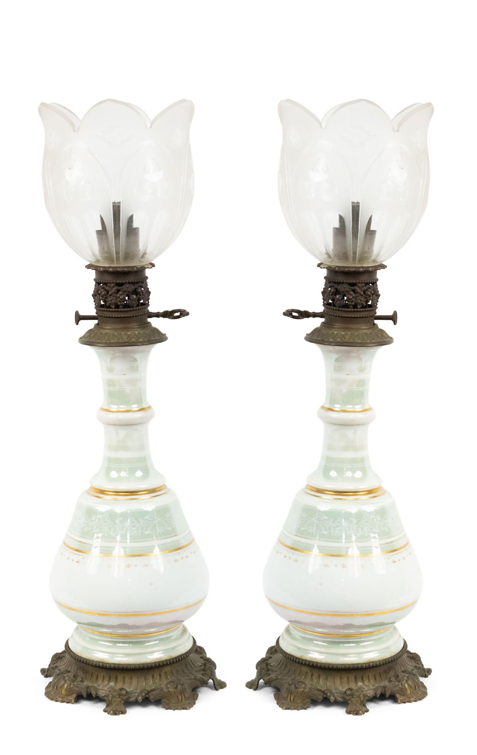 PAIR of French Victorian celadon and white porcelain oil lamps with etched glass shade and bronze base (PRICED AS PAIR).