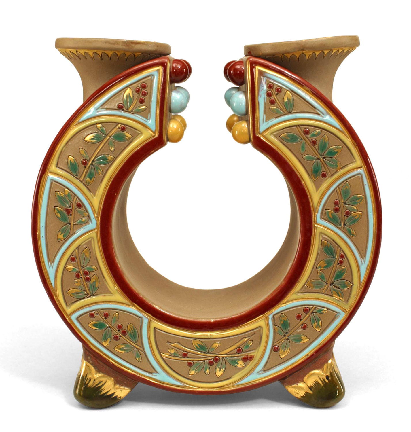 French Victorian (19/20th Cent) faience Majolica small double bud vase with circular shape and decorated with vine, leaves, and fruit (impressed: Sarreguemines 1391).