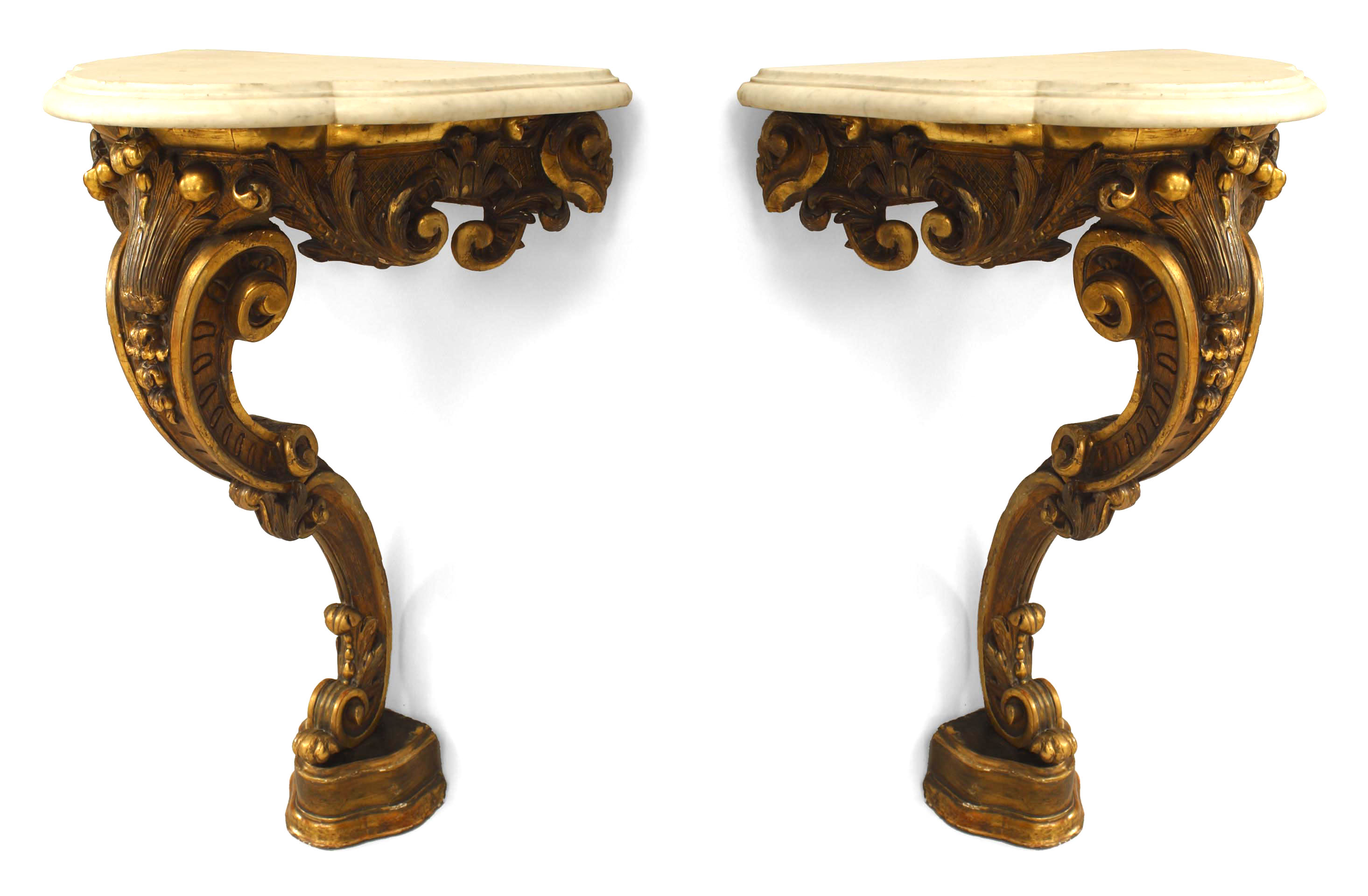 PAIR of French Victorian gilt carved bracket consoles with scroll design and shaped white marble top (with a separate base section) (PRICED AS PAIR).