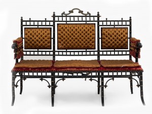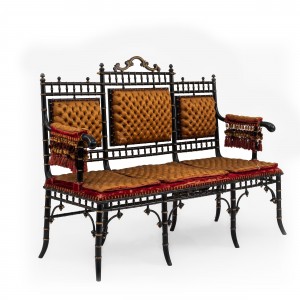 French Victorian faux-bamboo design ebonized and gilt-trimmed settee with tufted gold upholstery and fringe (matching stools: 052463).