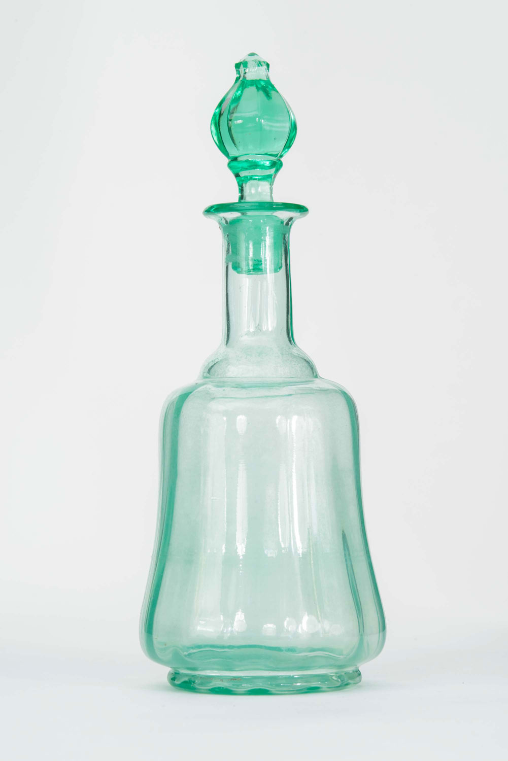 French Victorian style green-tinted glass decanter with fluted design and a stopper