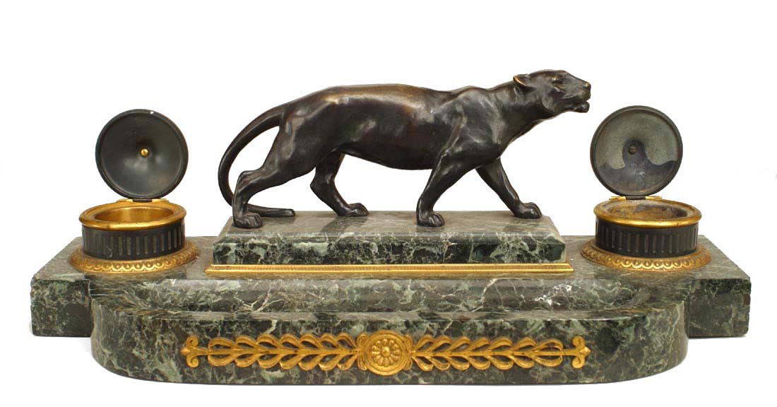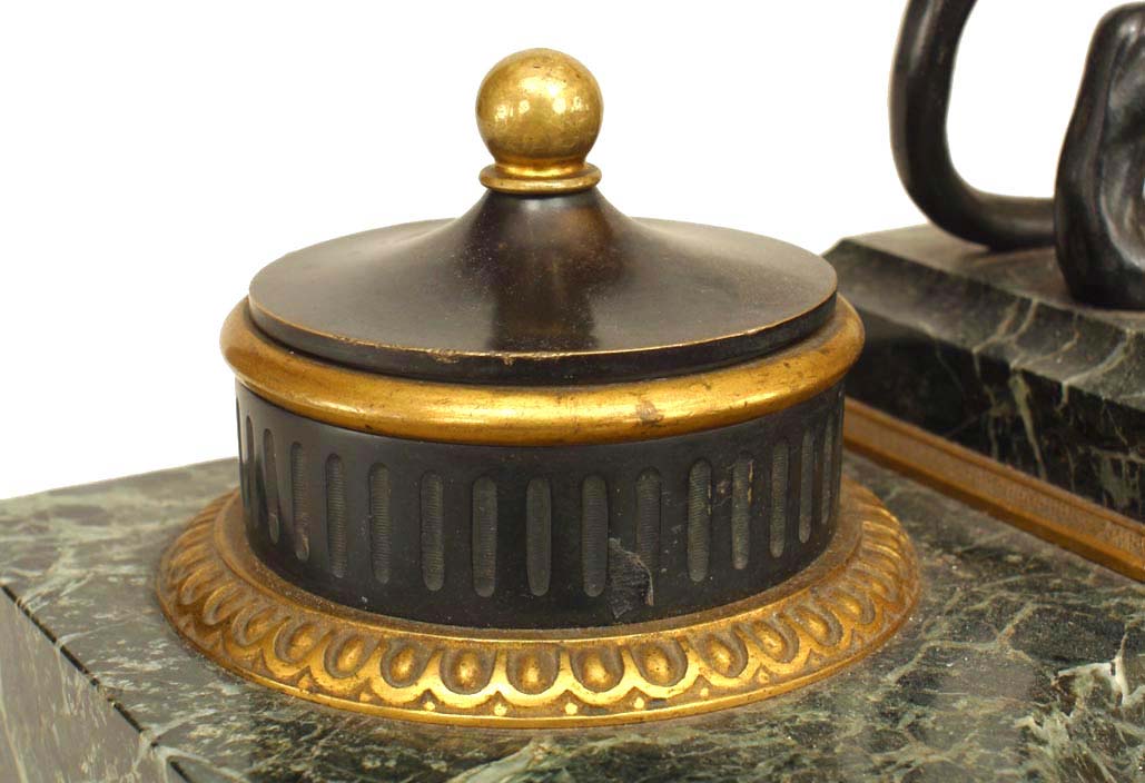 French Victorian Green Marble Inkwell with Tiger