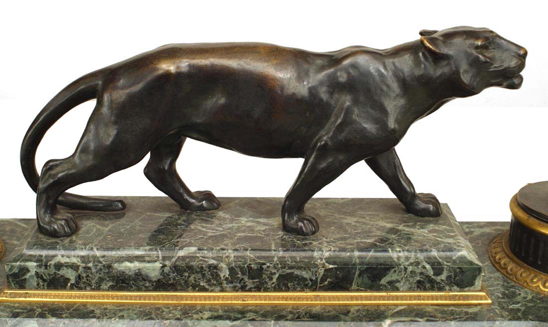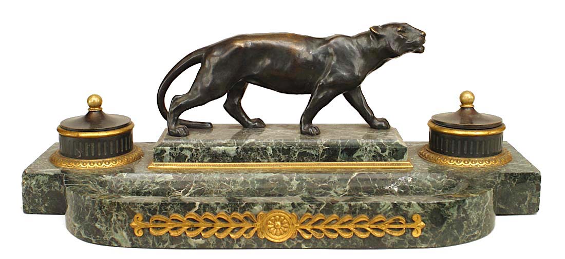 French Victorian green marble double inkwell with bronze trim and centered figure of tiger..