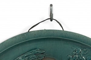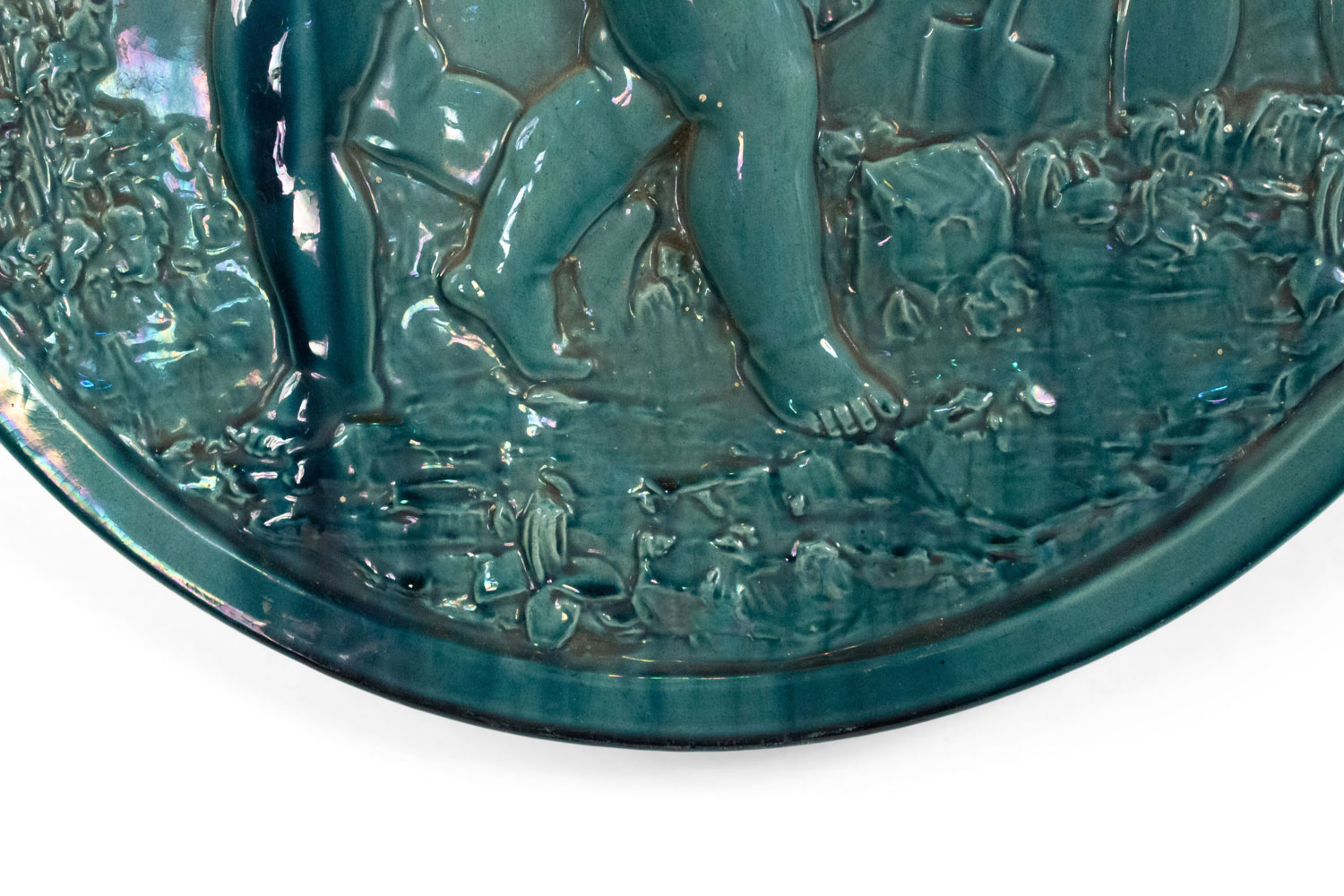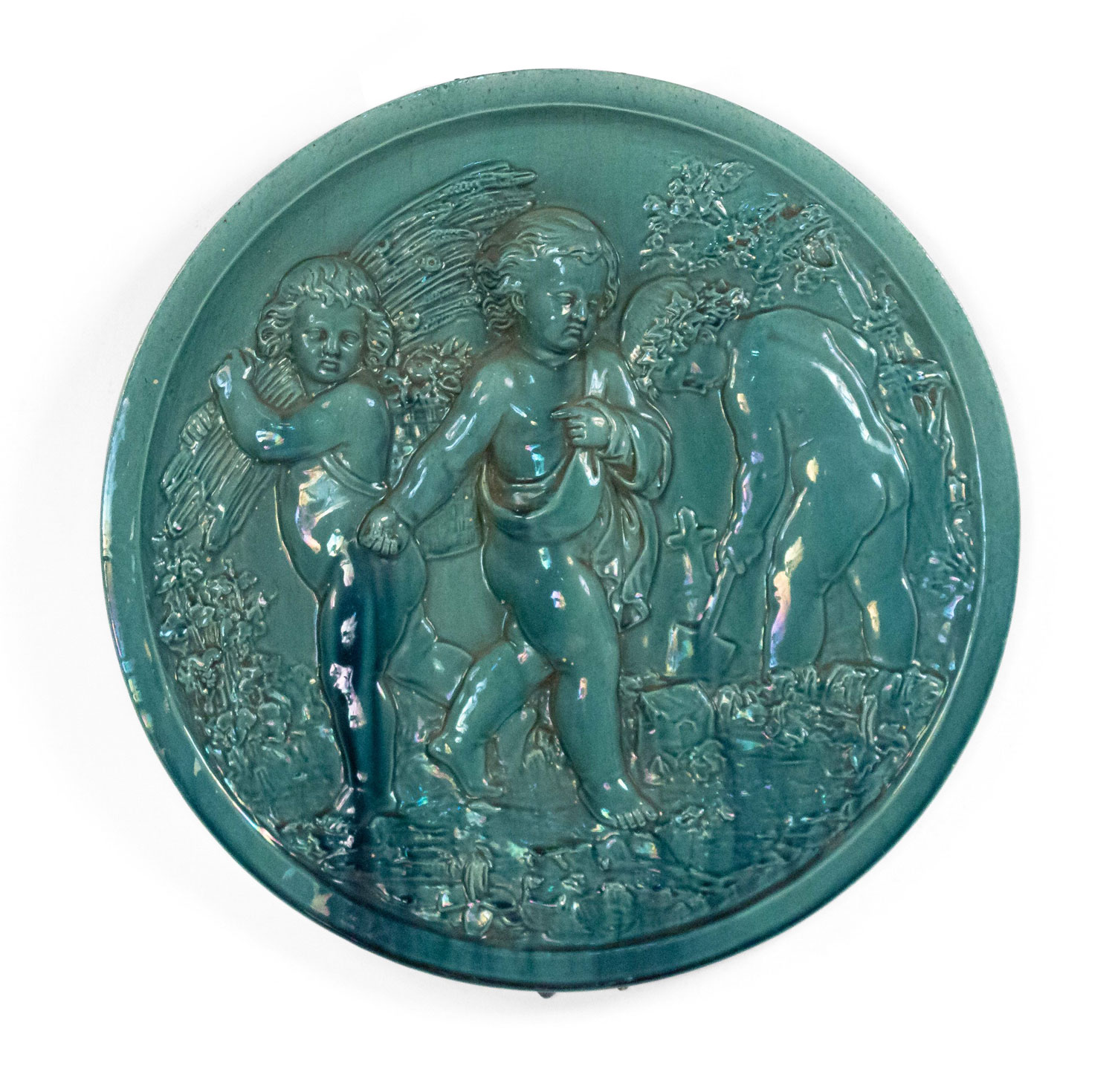 French Victorian round green porcelain wall plaque with 3 cupids in relief.