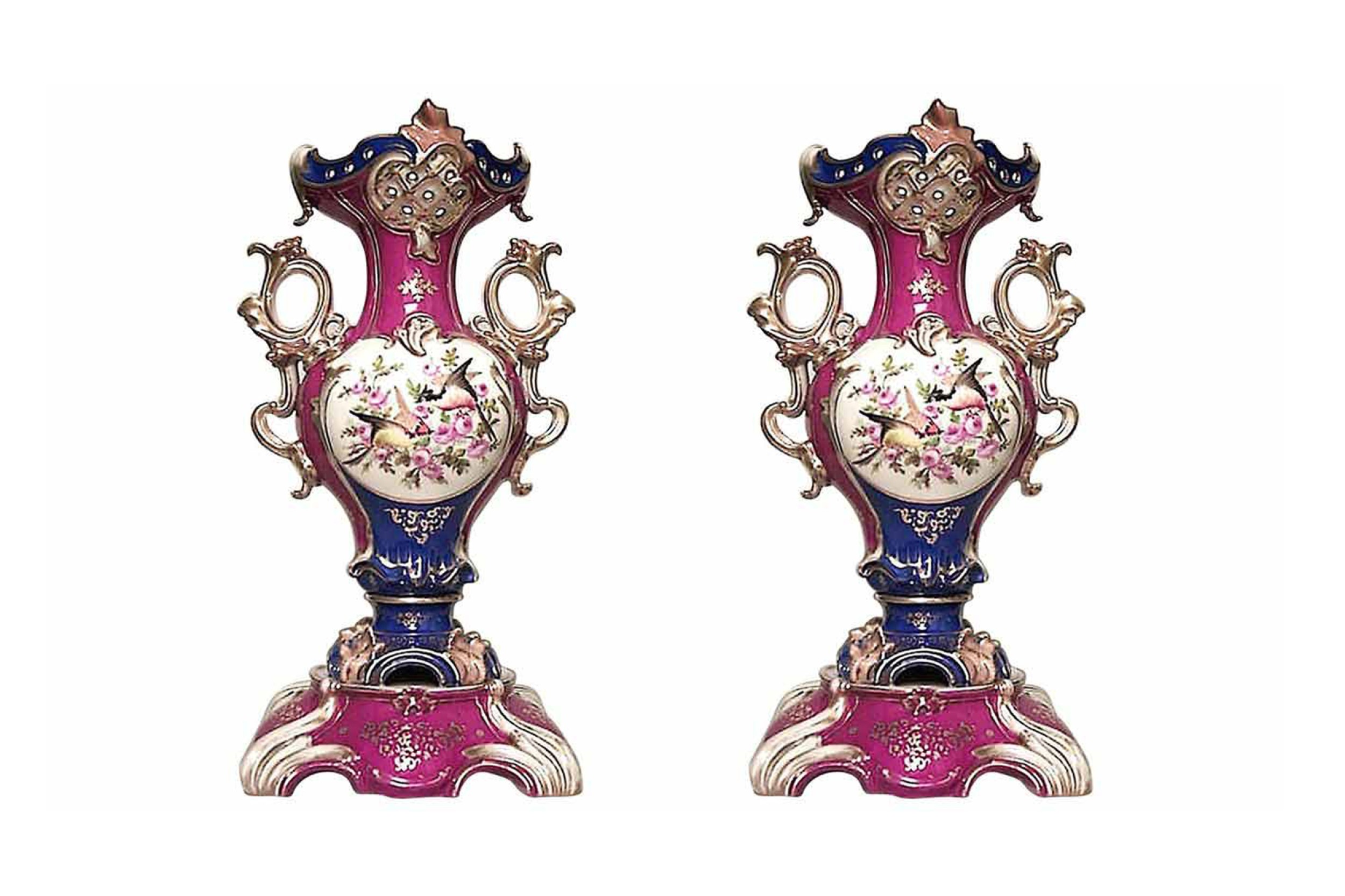 PAIR of French Victorian Jacob Petit style porcelain red, white and blue vases with bird scene and scroll handles.