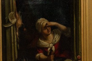 French Victorian gold framed oil painting portrait of lady standing by window holding poultry (signed I. BANKE ?).