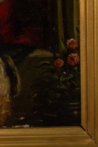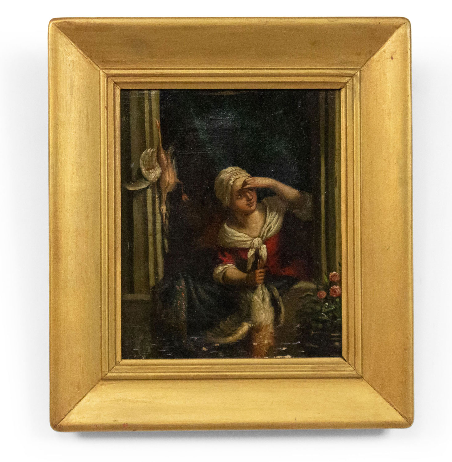 French Victorian gold framed oil painting portrait of lady standing by window holding poultry (signed I. BANKE ?)