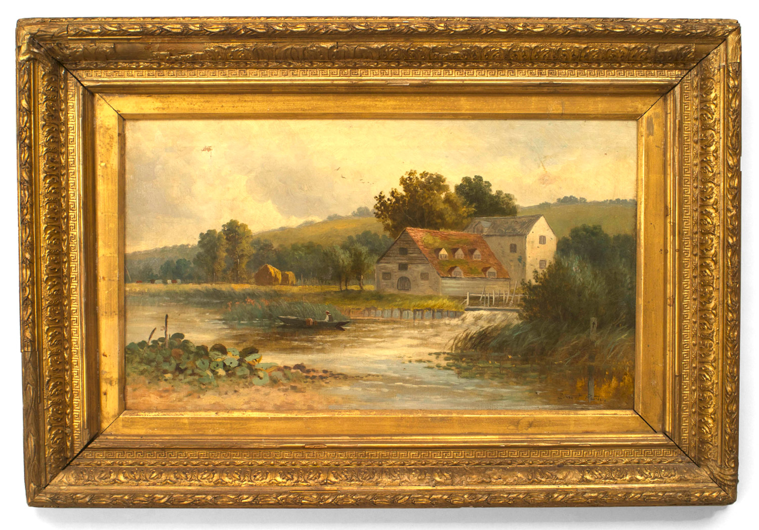 French Victorian gilt framed oil landscape painting of man in row boat by house. (signed ERNEST PARTIN)