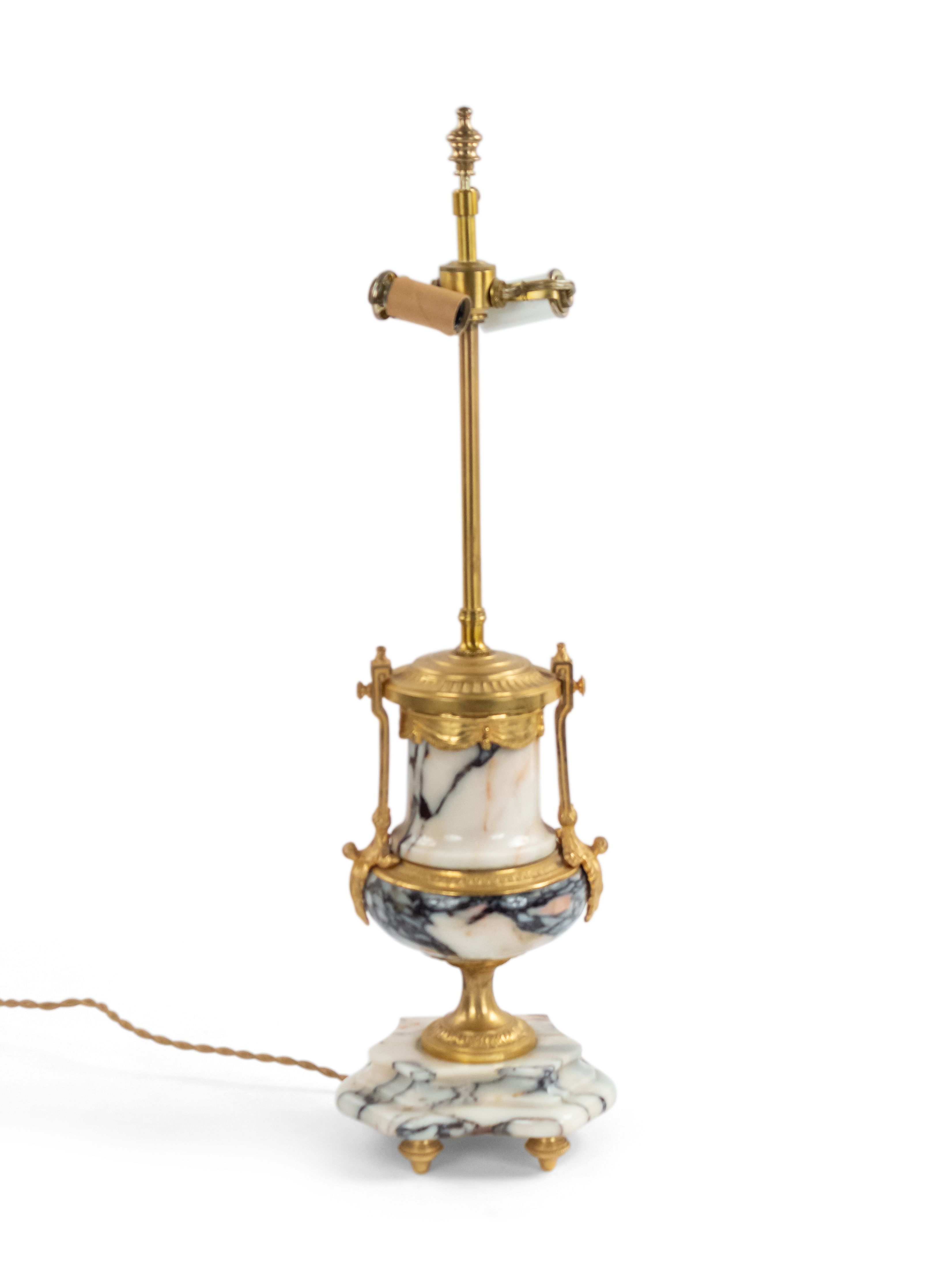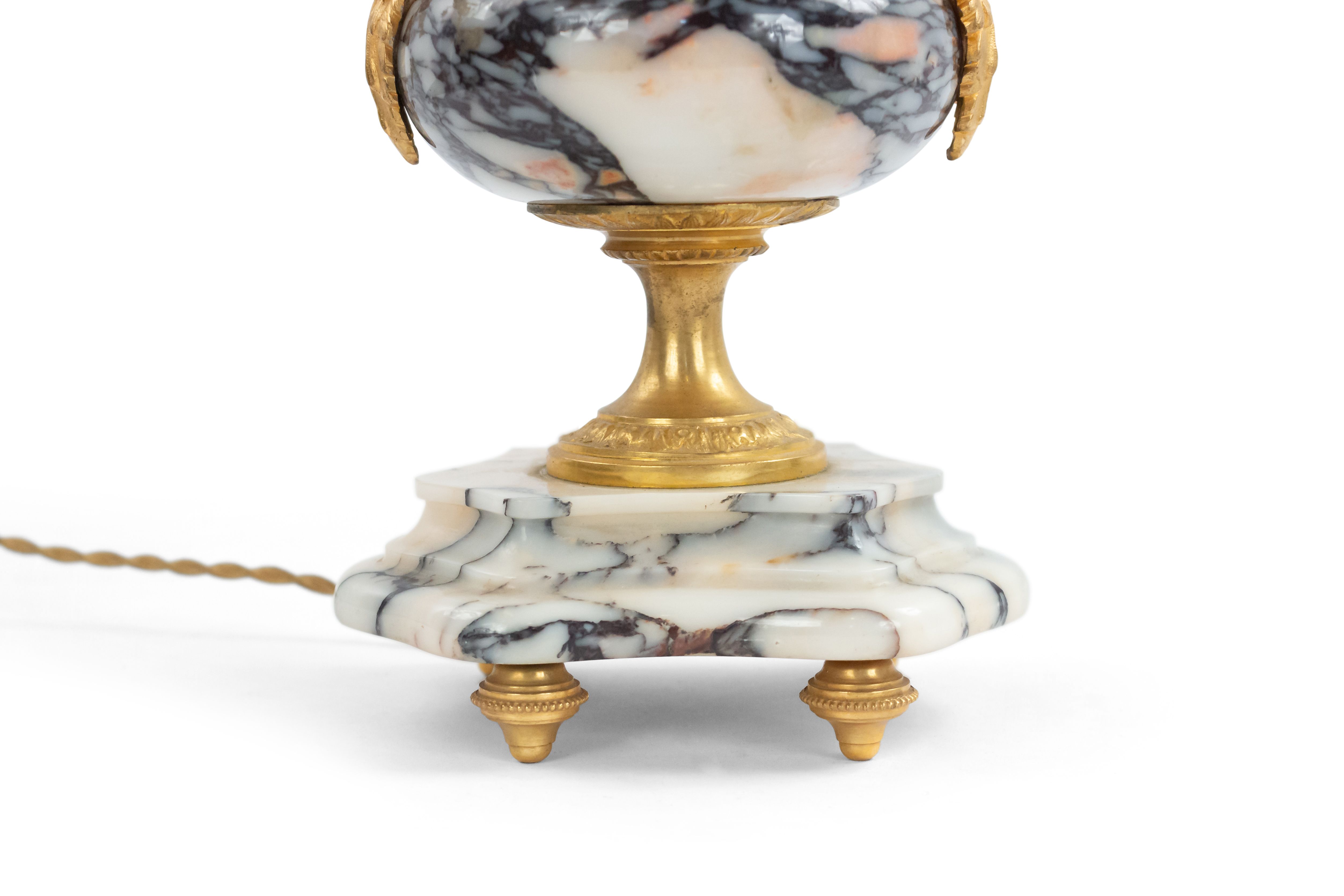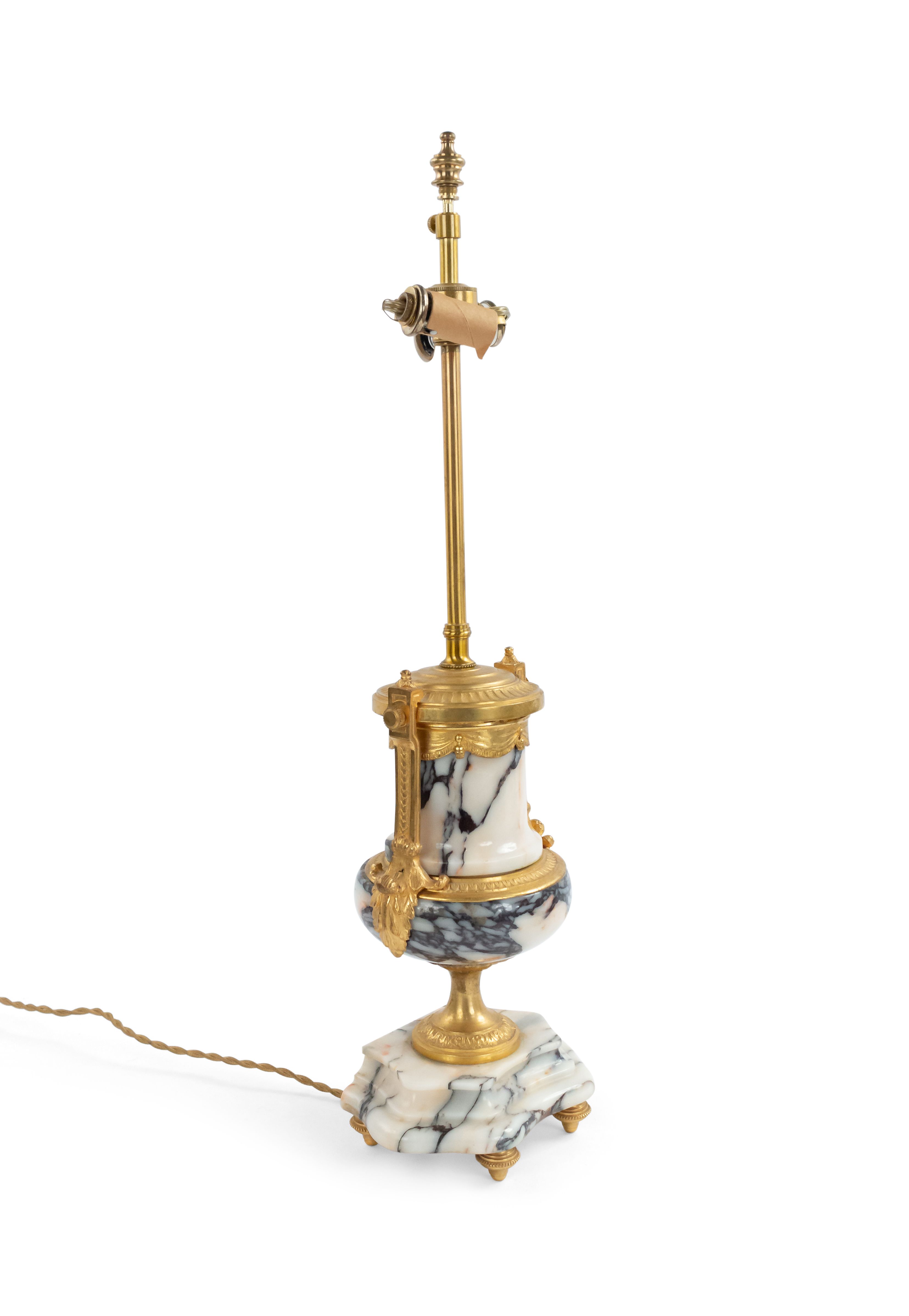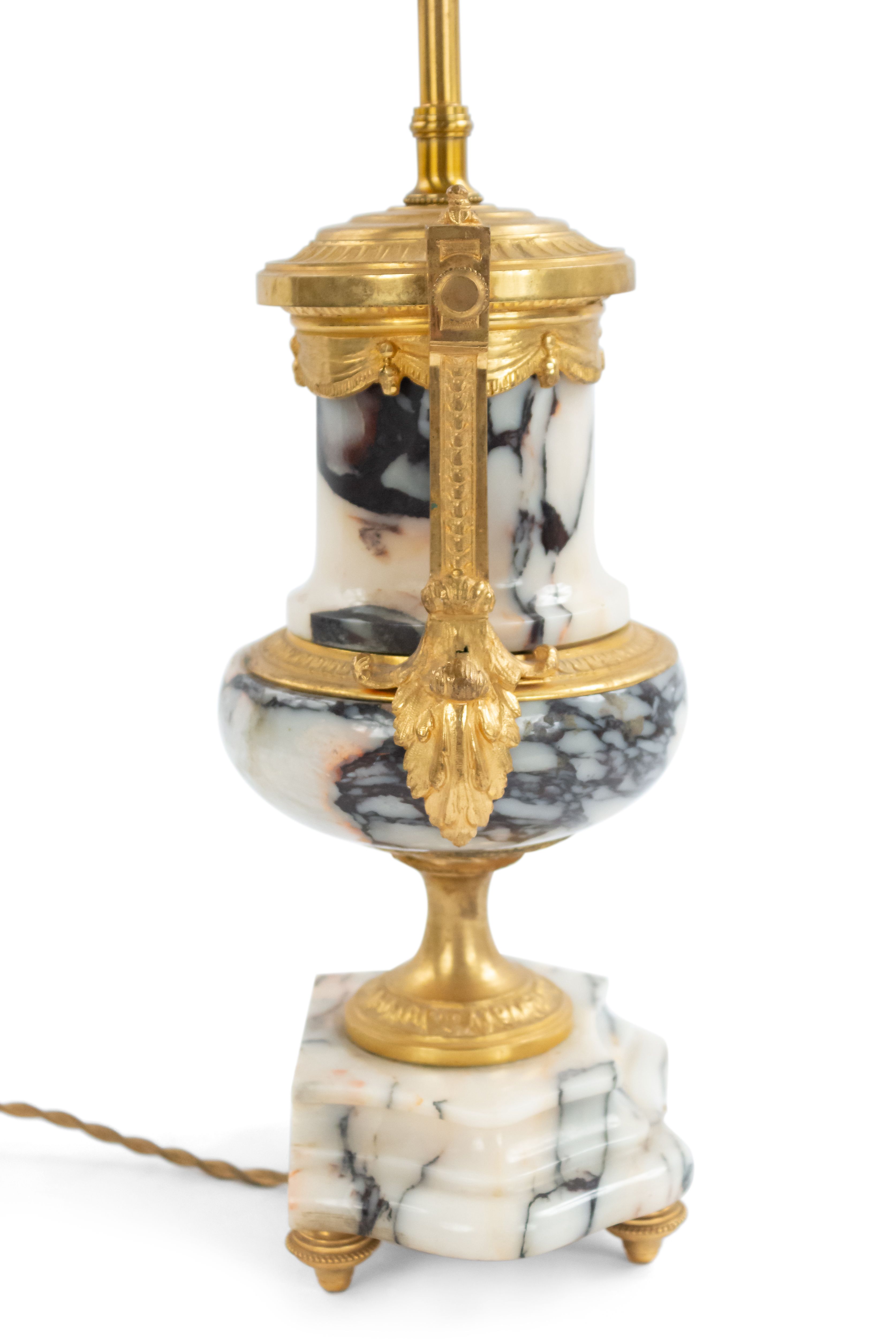 PAIR of French Victorian (19/20th Century) white and black veined marble urn form lamps with gilt bronze side handles and trim (PRICED AS PAIR).