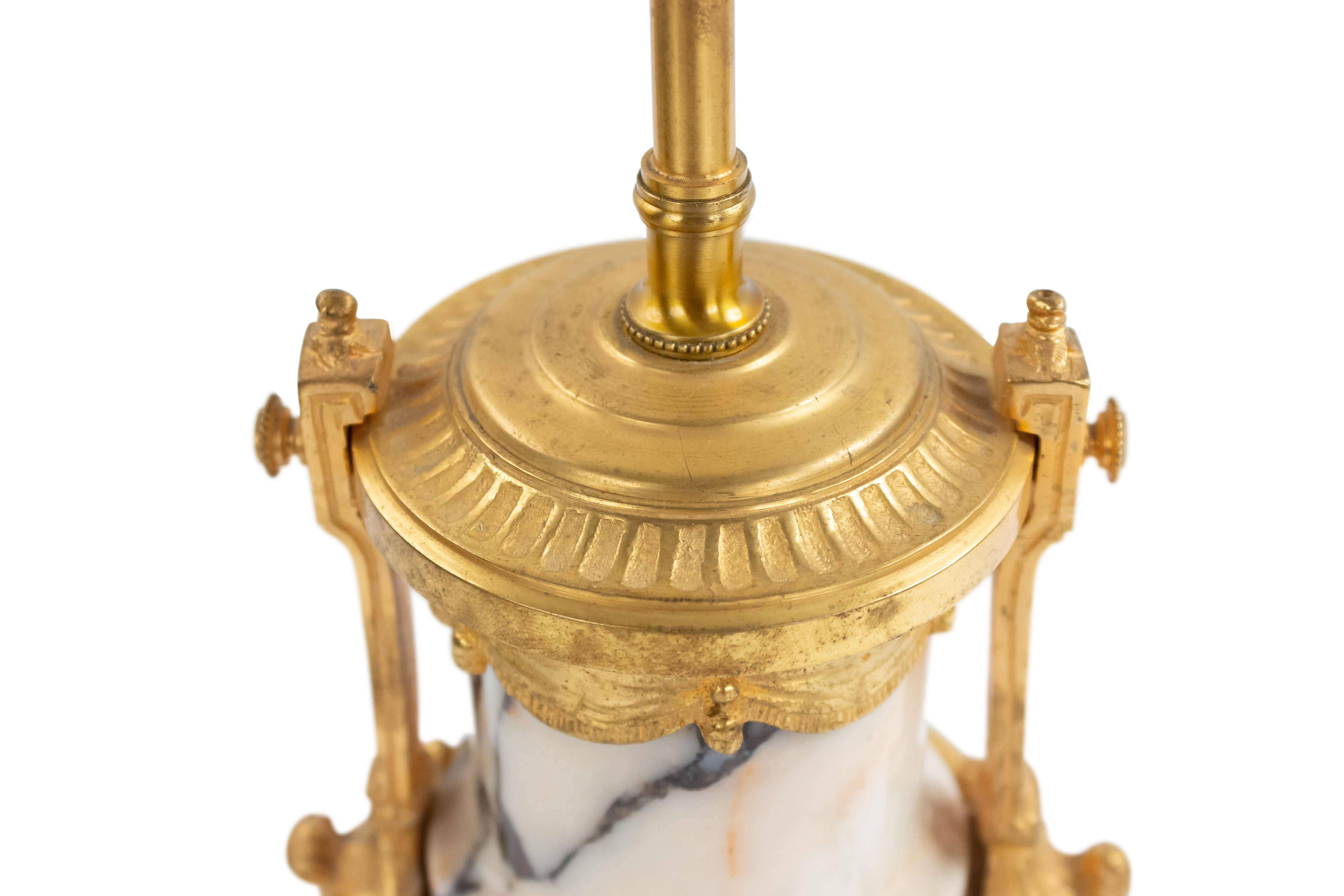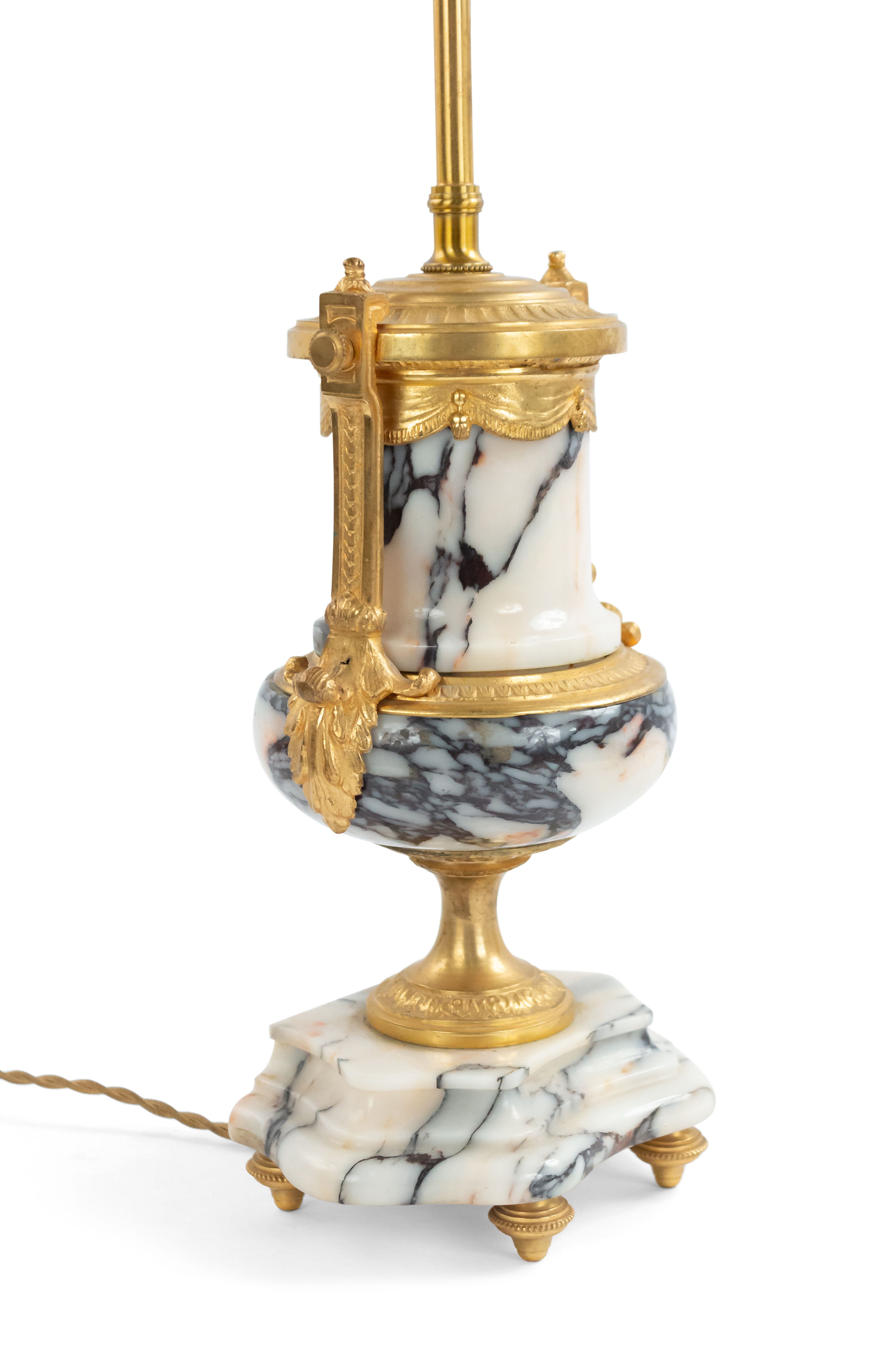 PAIR of French Victorian (19/20th Century) white and black veined marble urn form lamps with gilt bronze side handles and trim (PRICED AS PAIR)..