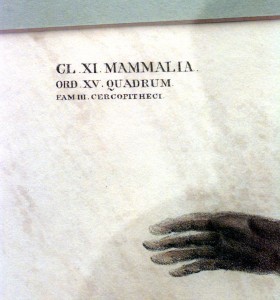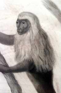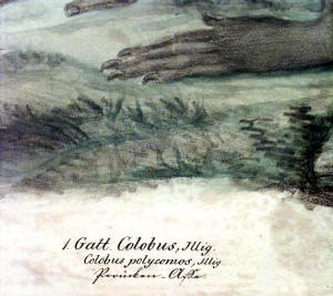 French Victorian (19th Cent) colored engraving of monkey figure standing by tree stump in green & black trimmed frame (1. Gatt. Colobus, illig.) (similar to Inv. #030290A)