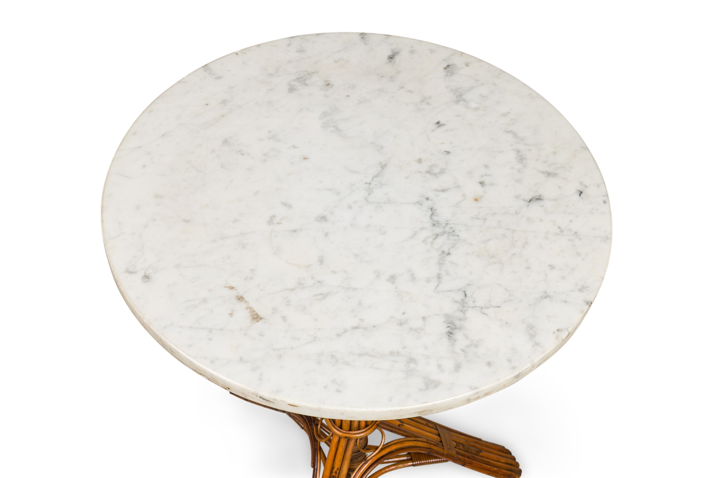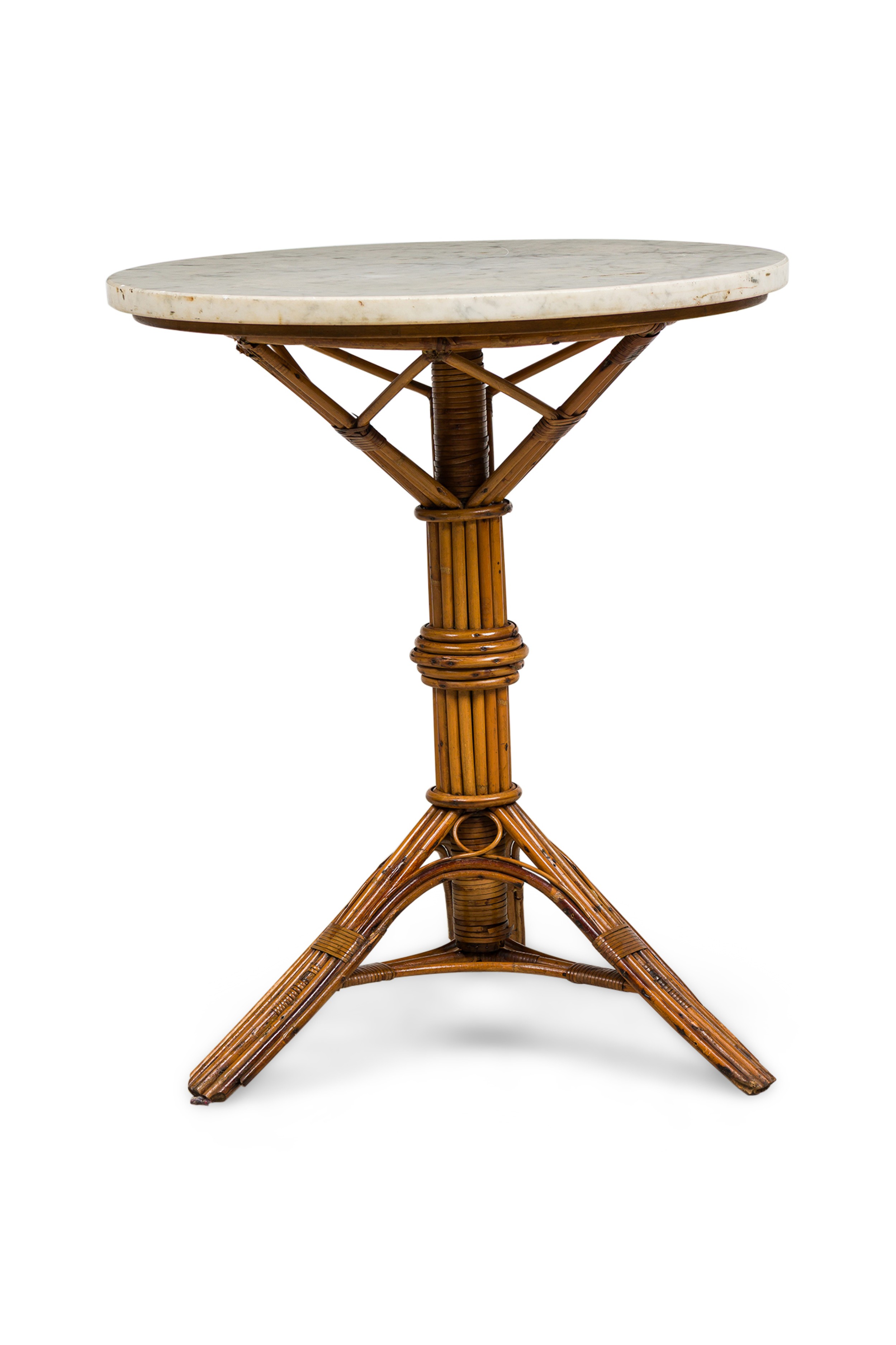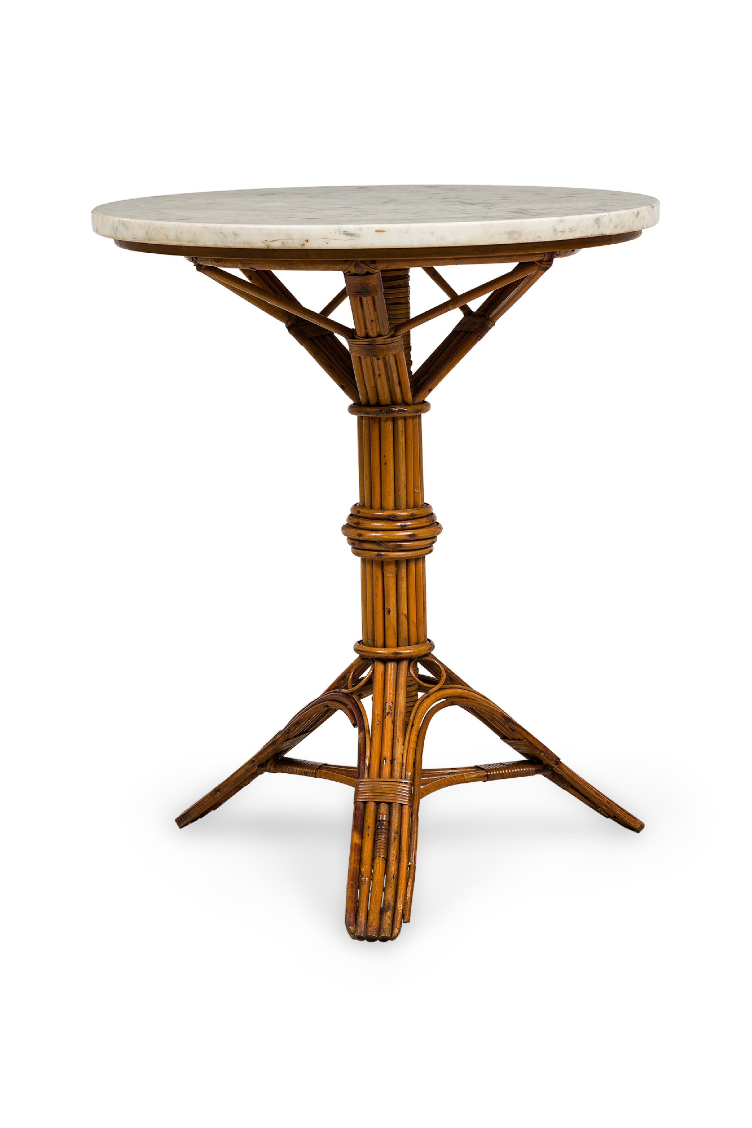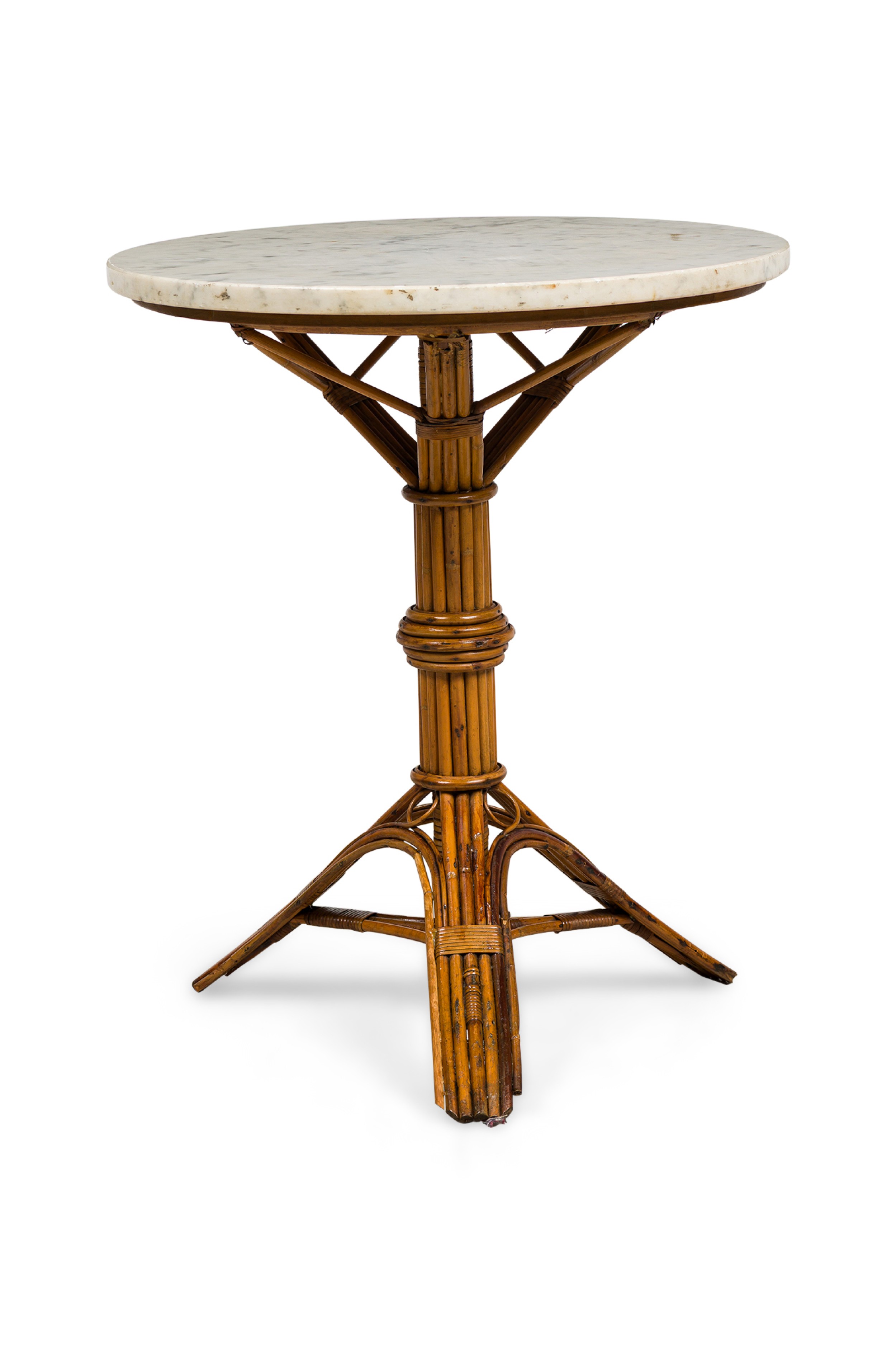 French Victorian style (early 20th Century) natural rattan and wicker trim pedestal base end table with a round white marble top