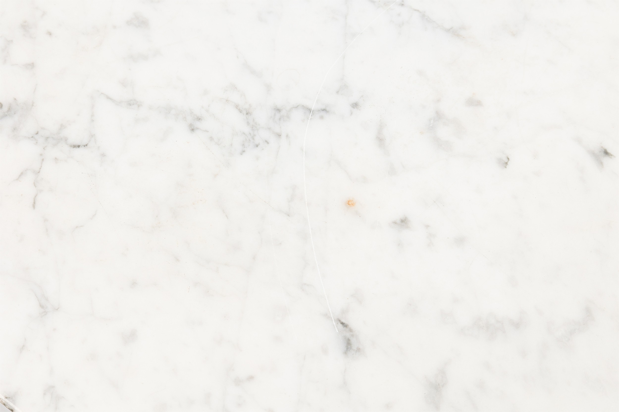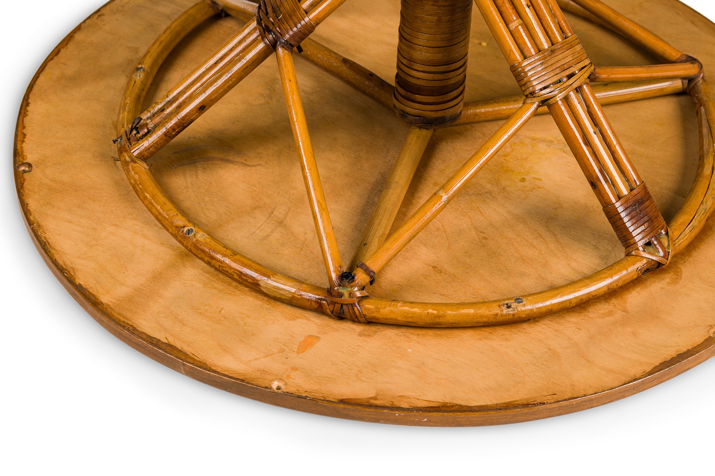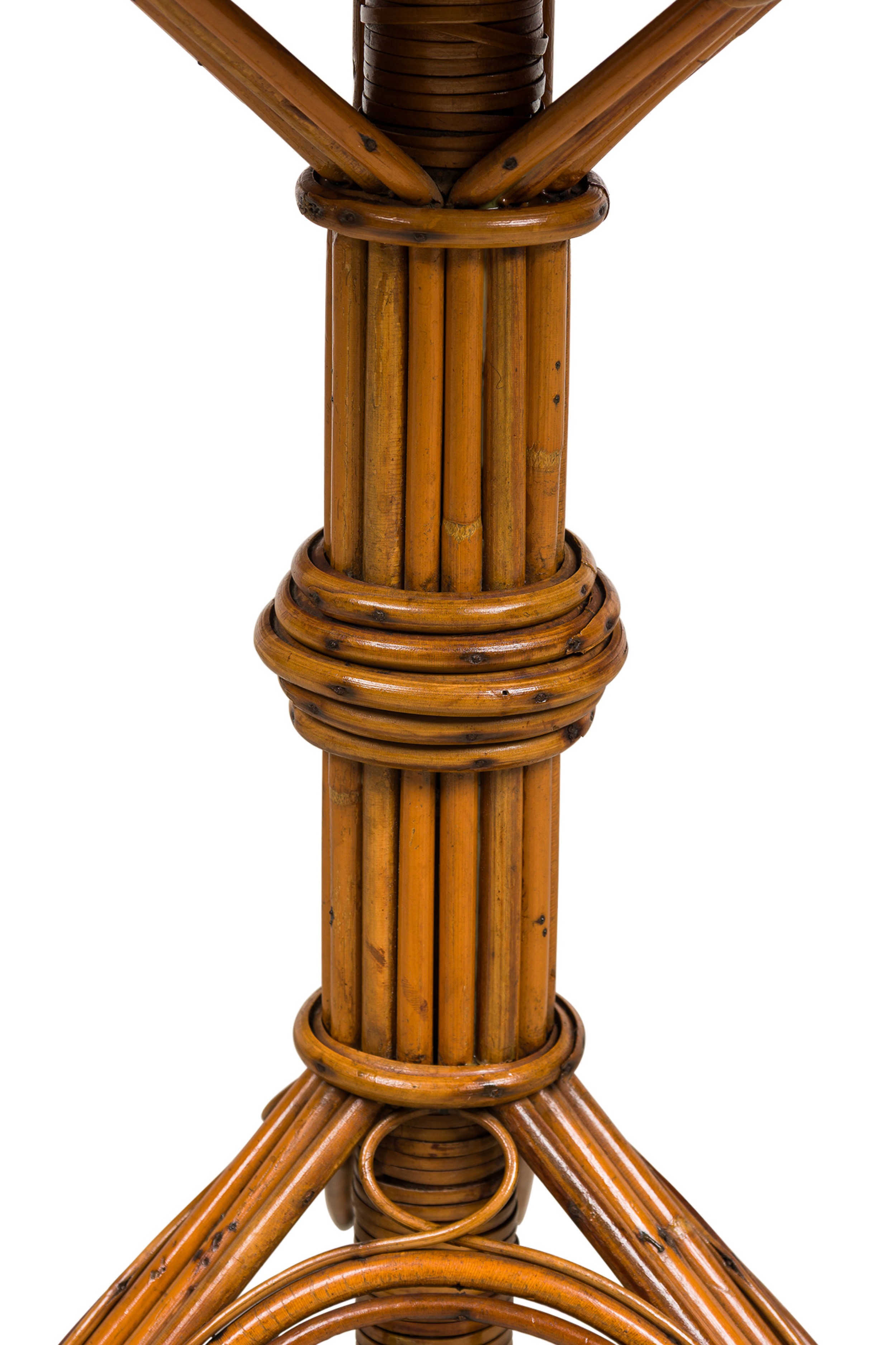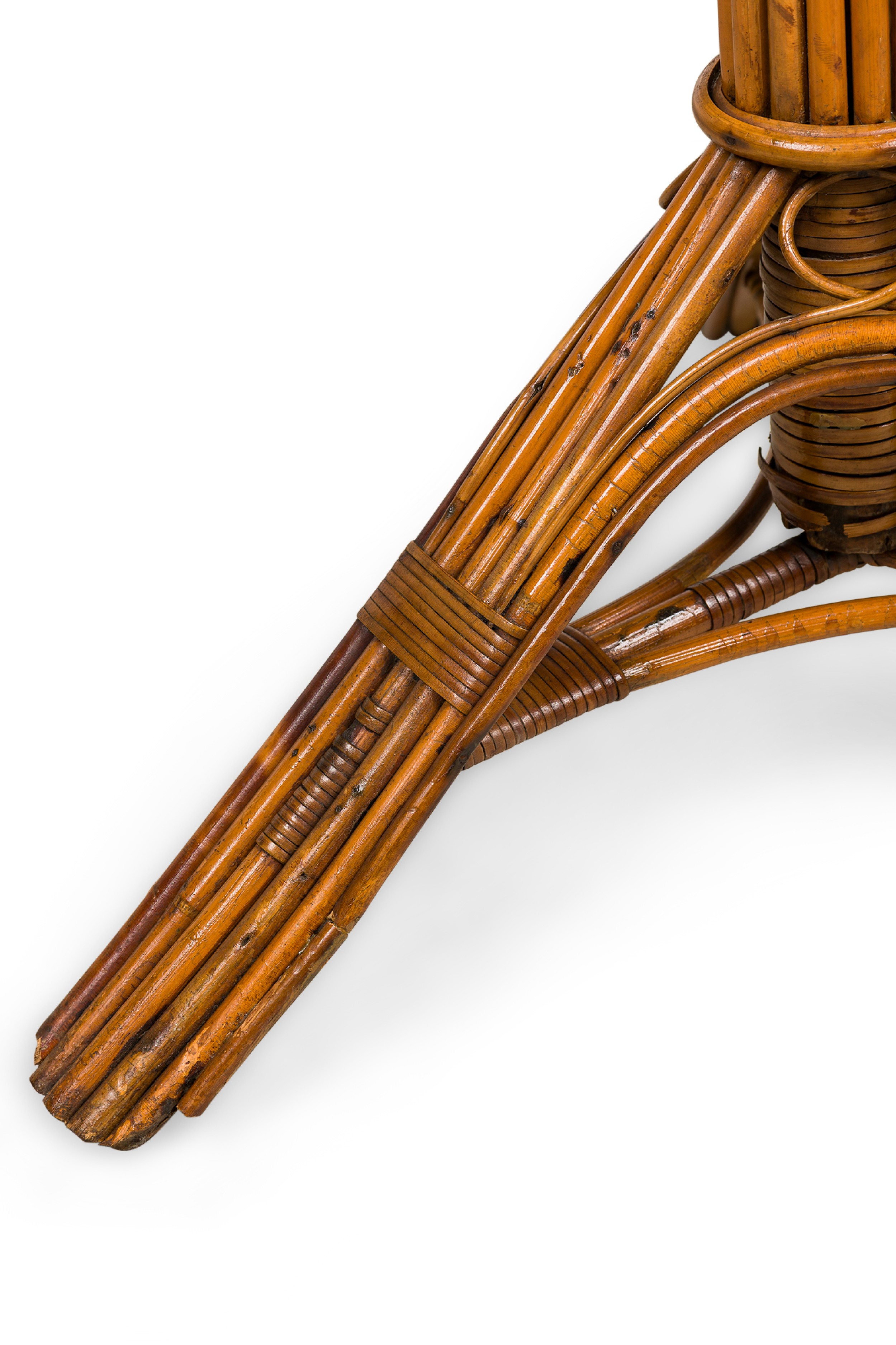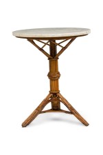 French Victorian style (early 20th Century) natural rattan and wicker trim pedestal base end table with a round white marble top