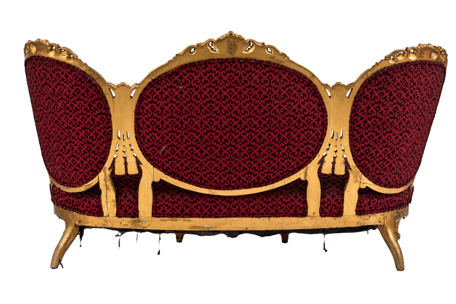 French Victorian carved gilt triple oval back settee with rope and tassel carving