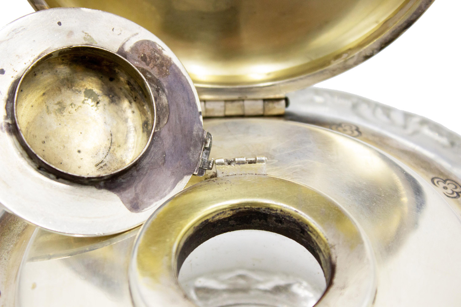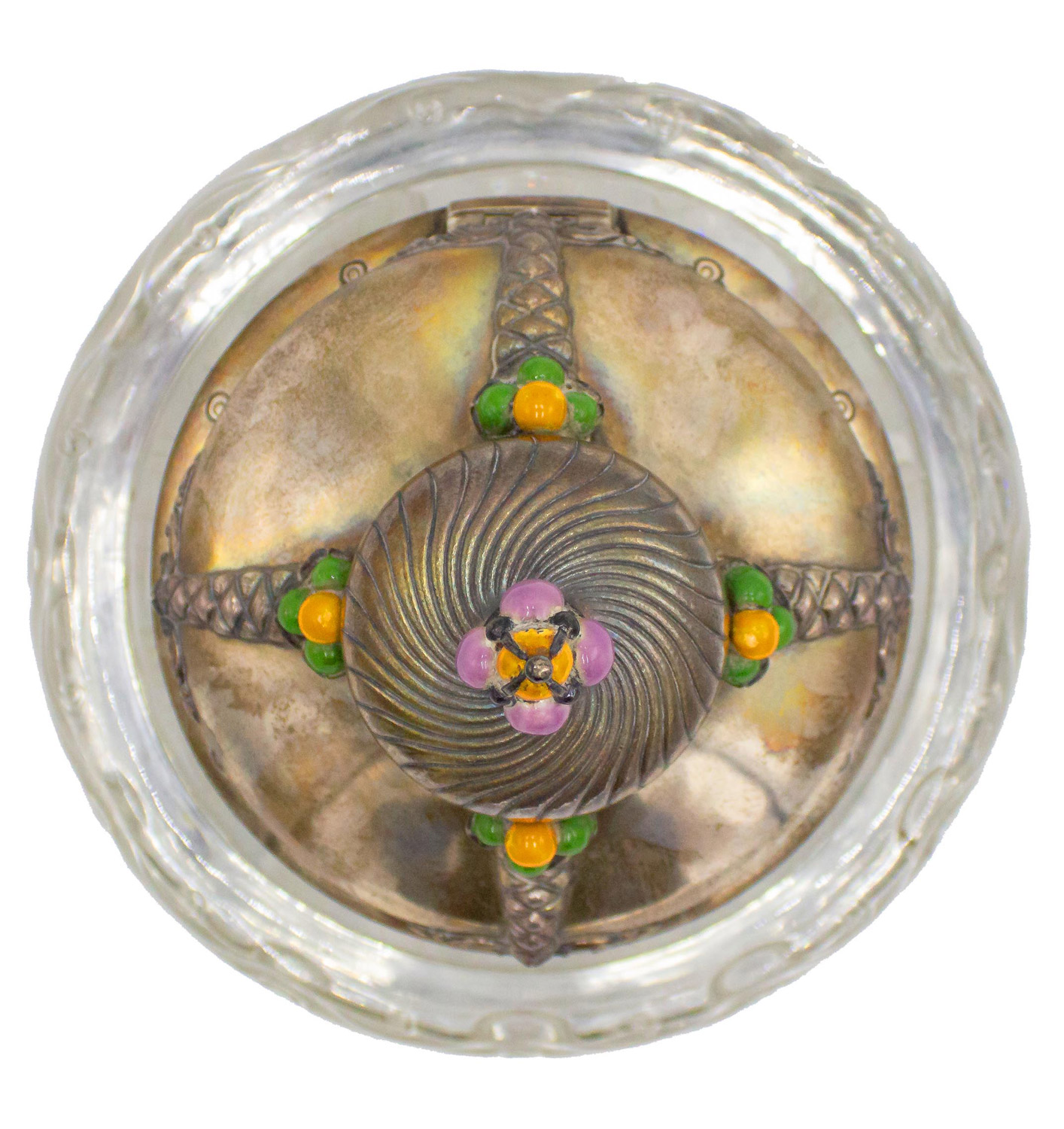 French Victorian round crystal inkwell with silver and enamel cornucopia top (signed TIFFANY) *as is