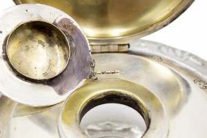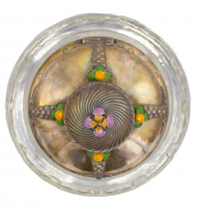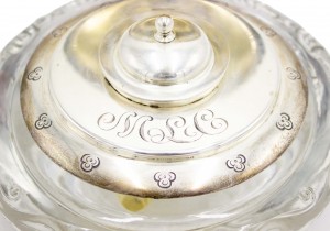 French Victorian round crystal inkwell with silver and enamel cornucopia top (signed TIFFANY) *as is.