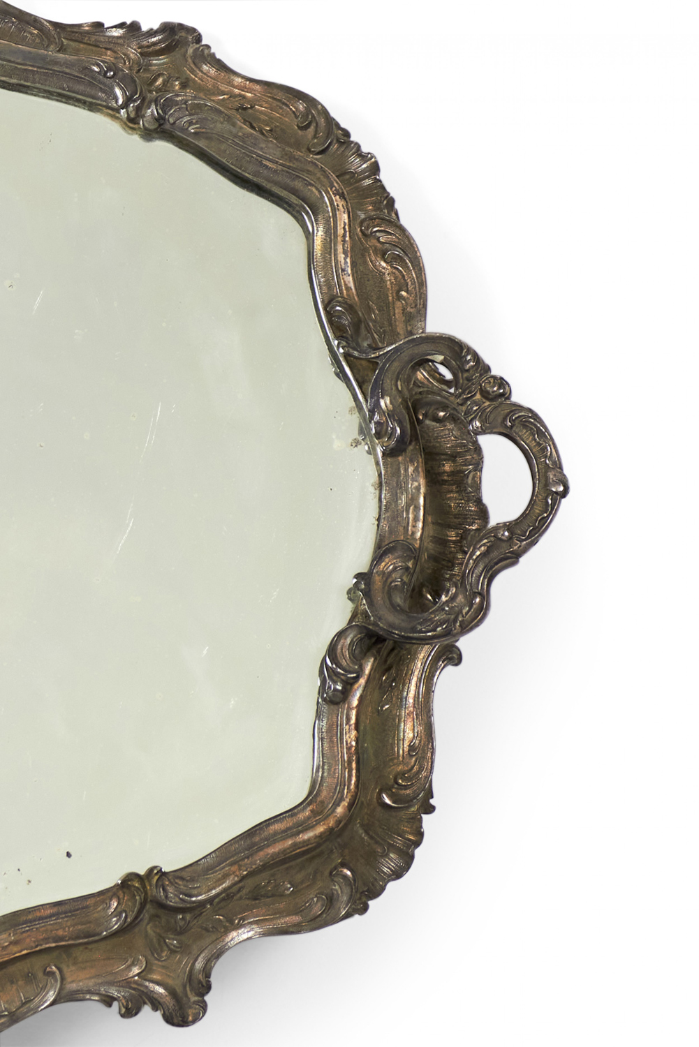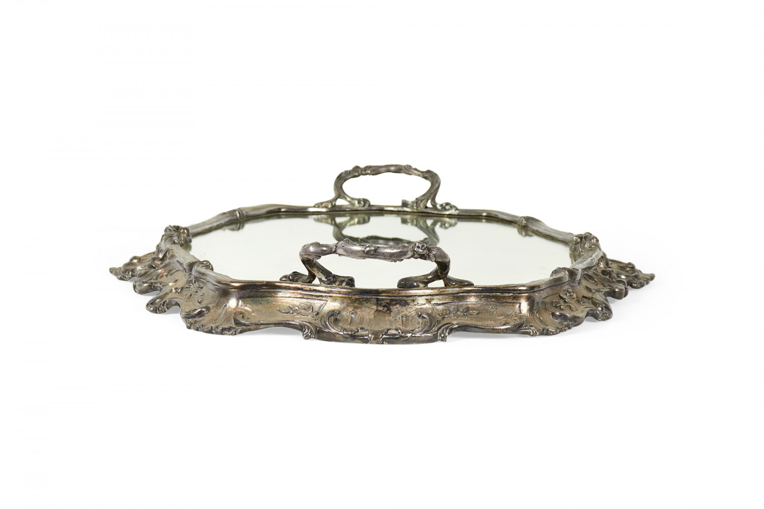 French Victorian (19th Century) silver plate rectangular shaped tray with scroll & shell design border and handles with mirrored surface.