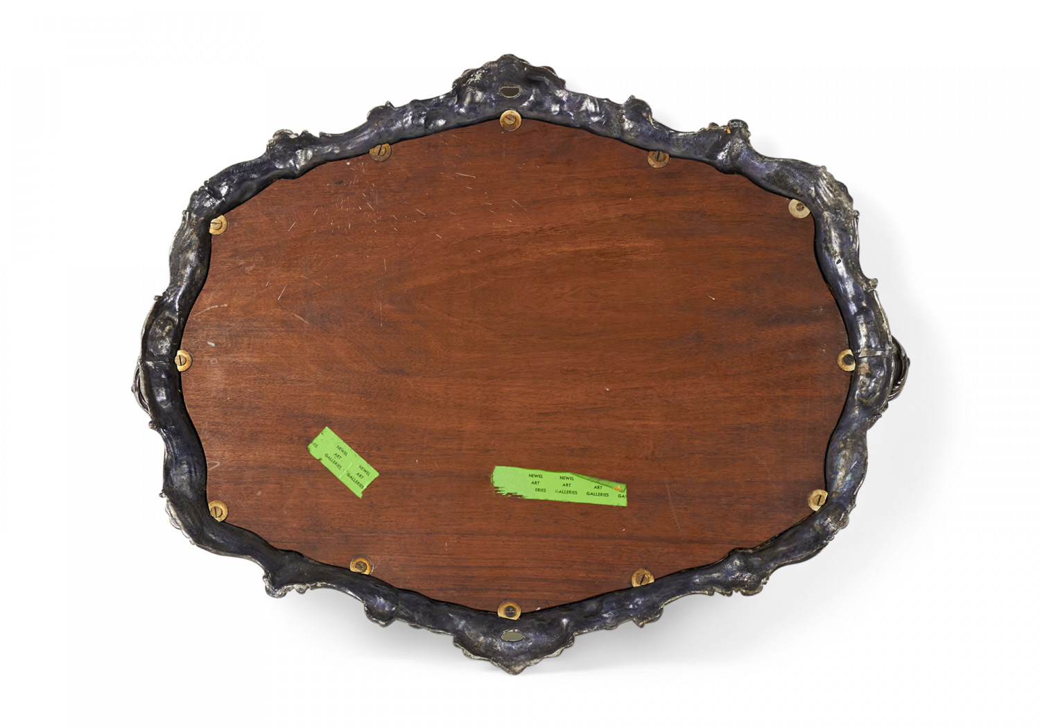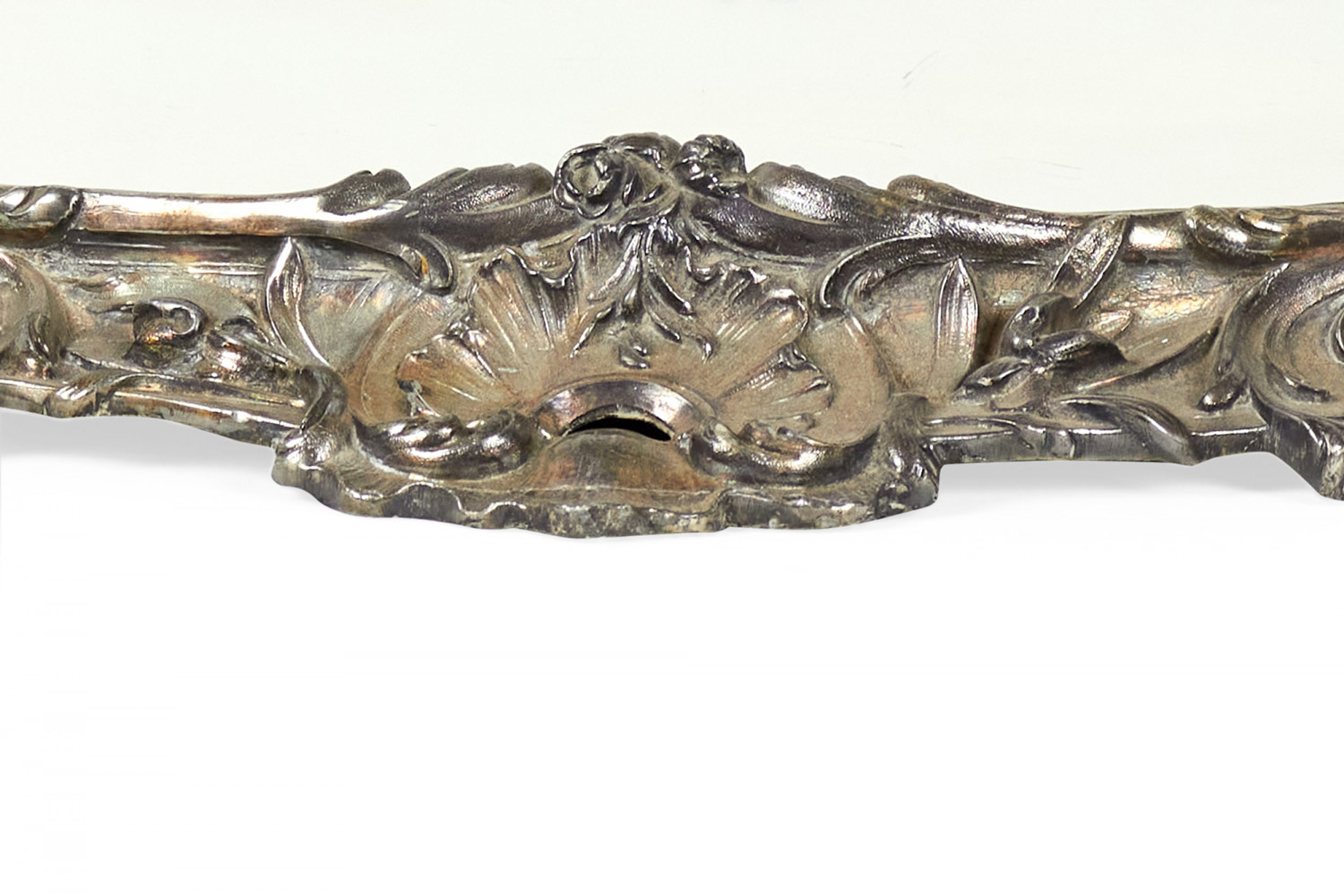 French Victorian (19th Century) silver plate rectangular shaped tray with scroll & shell design border and handles with mirrored surface..
