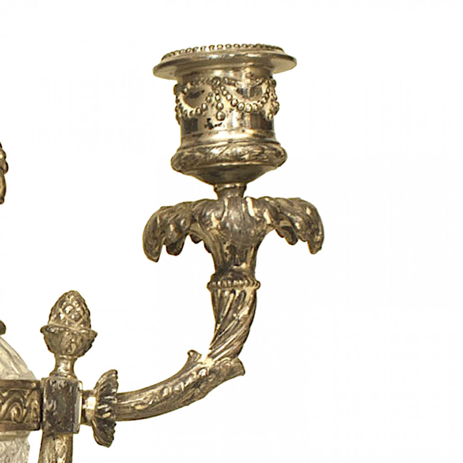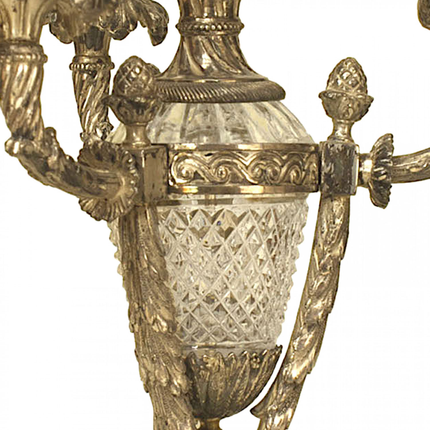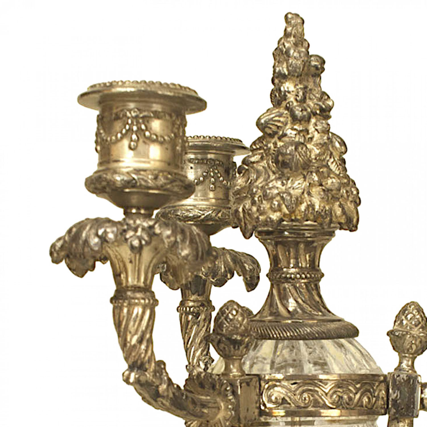 PAIR of French Victorian-style silvered bronze and cut glass three-light candelabras resting on a round onyx base. (PRICED AS PAIR)