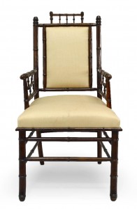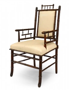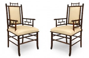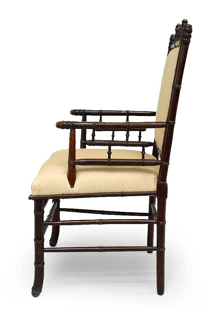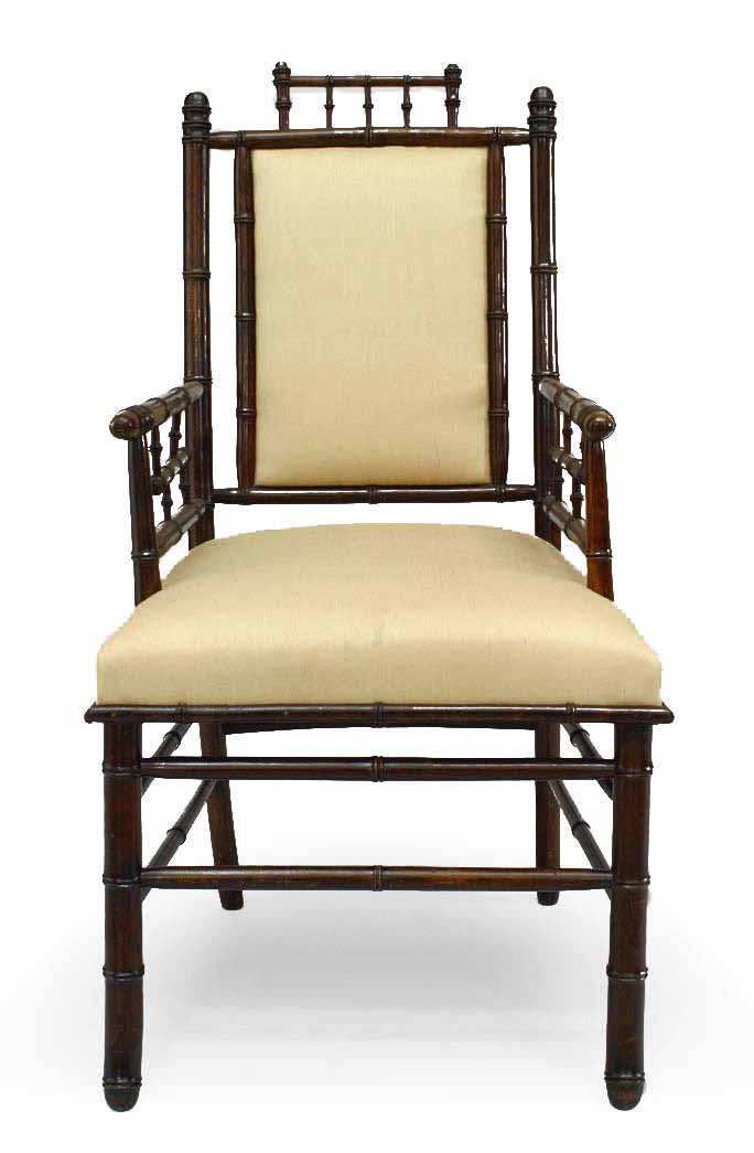 Pair of French Victorian Faux Bamboo Upholstered Walnut Armchairs