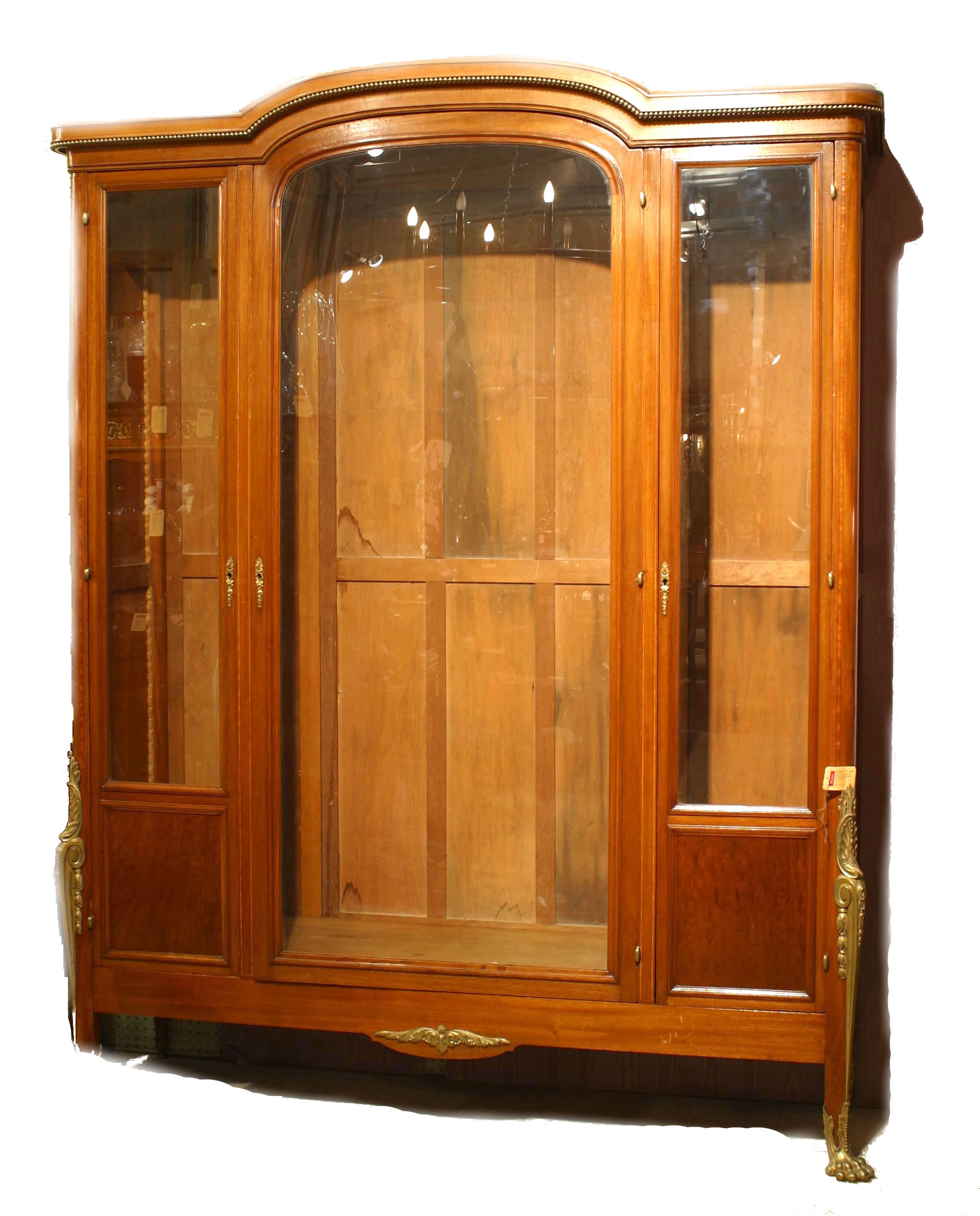 French Victorian walnut bookcase cabinet with 3 doors and bronze trim with banded inlay.