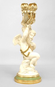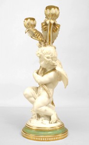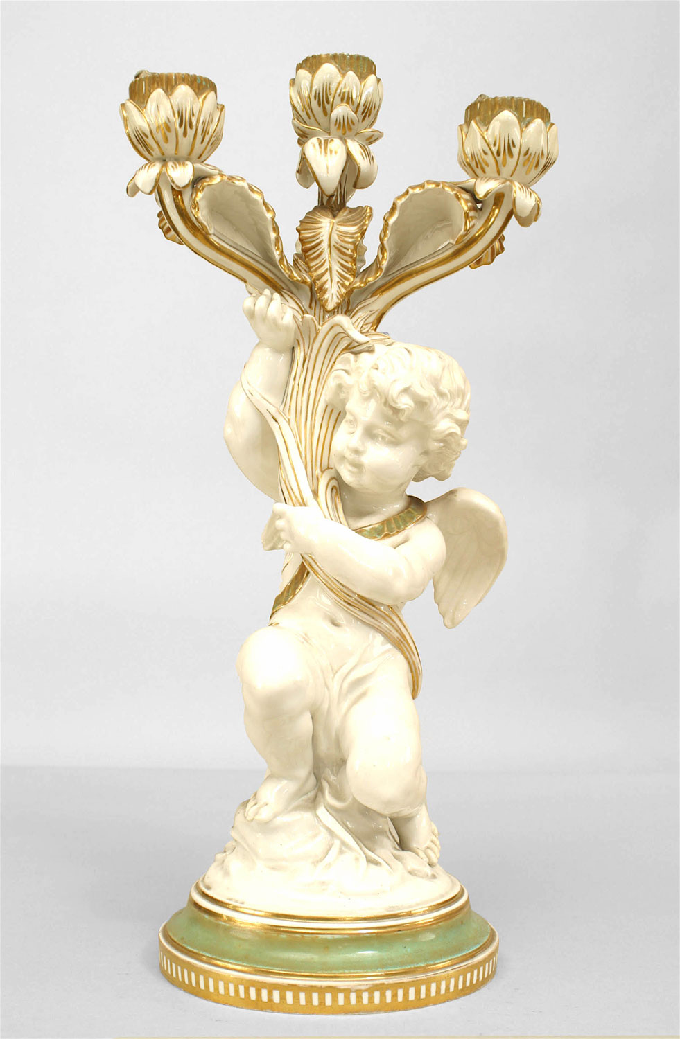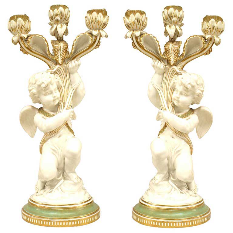 Pair of French Victorian White and Gilt Porcelain Cupid Candelabras