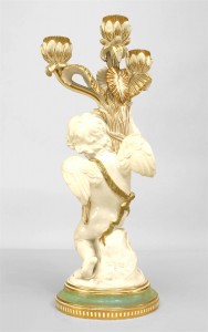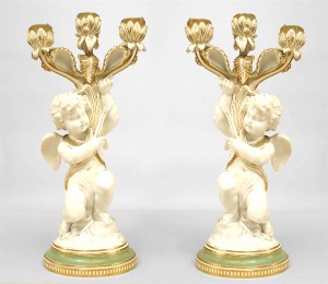 PAIR of French Victorian white porcelain winged cupids with gilt and green trim holding 3 arm candelabras (PRICED AS PAIR)