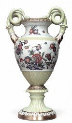 French Victorian large white and yellow trim porcelain vase with floral and butterfly design with snake handle..