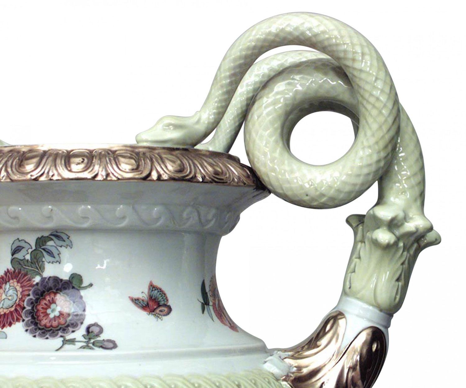 French Victorian large white and yellow trim porcelain vase with floral and butterfly design with snake handle.
