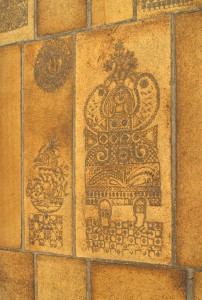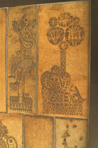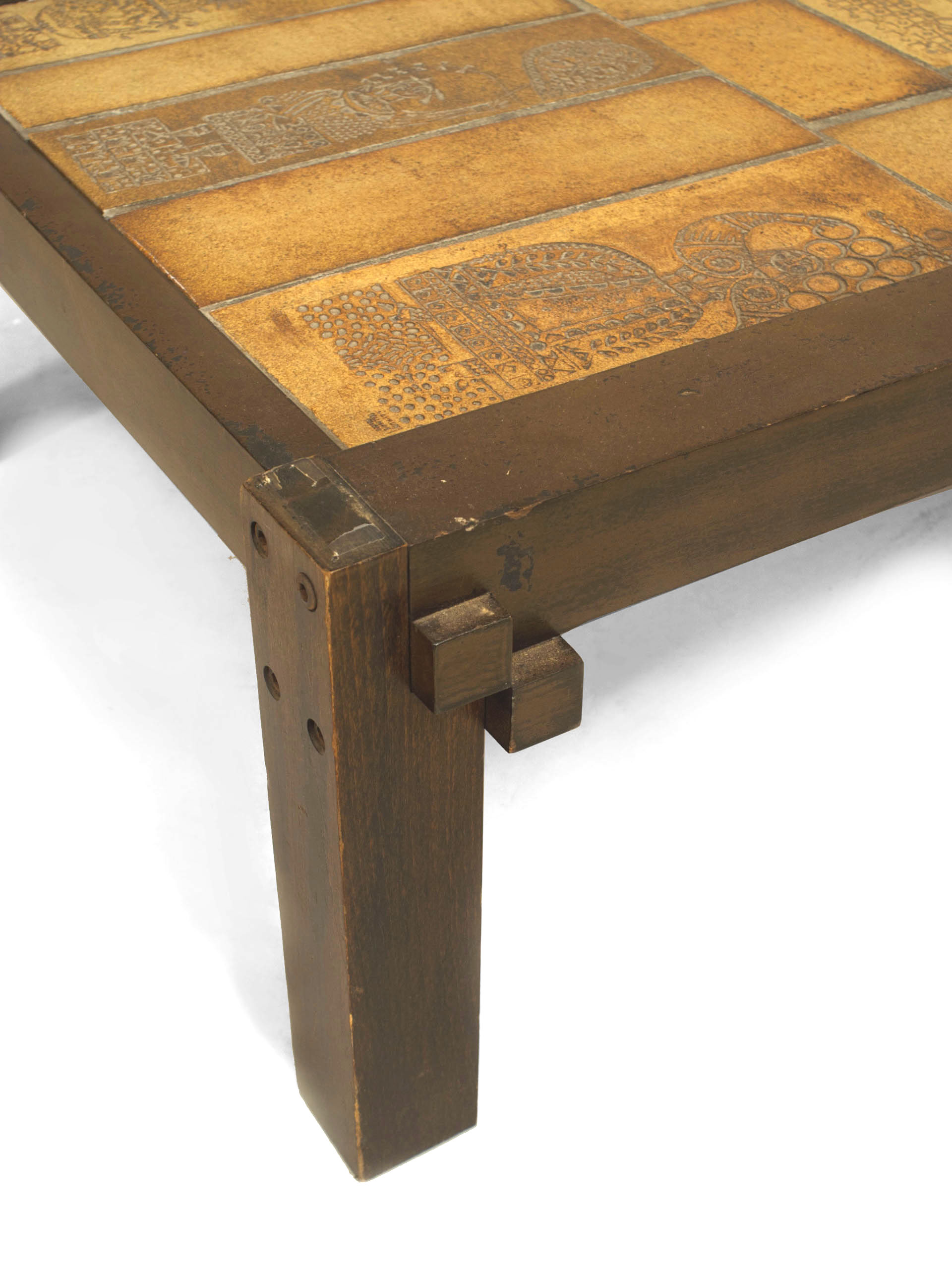 French Mid-Century (1960s) rectangular coffee table with a brown painted wood frame supporting a ceramic tile top decorated with stylized figures. (signed: ROGER CAPRON)