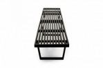 American Mid-Century extended rectangular platform bench with a black painted slat seat supported by three trapezoidal frame black metal legs. (GEORGE NELSON FOR HERMAN MILLER)