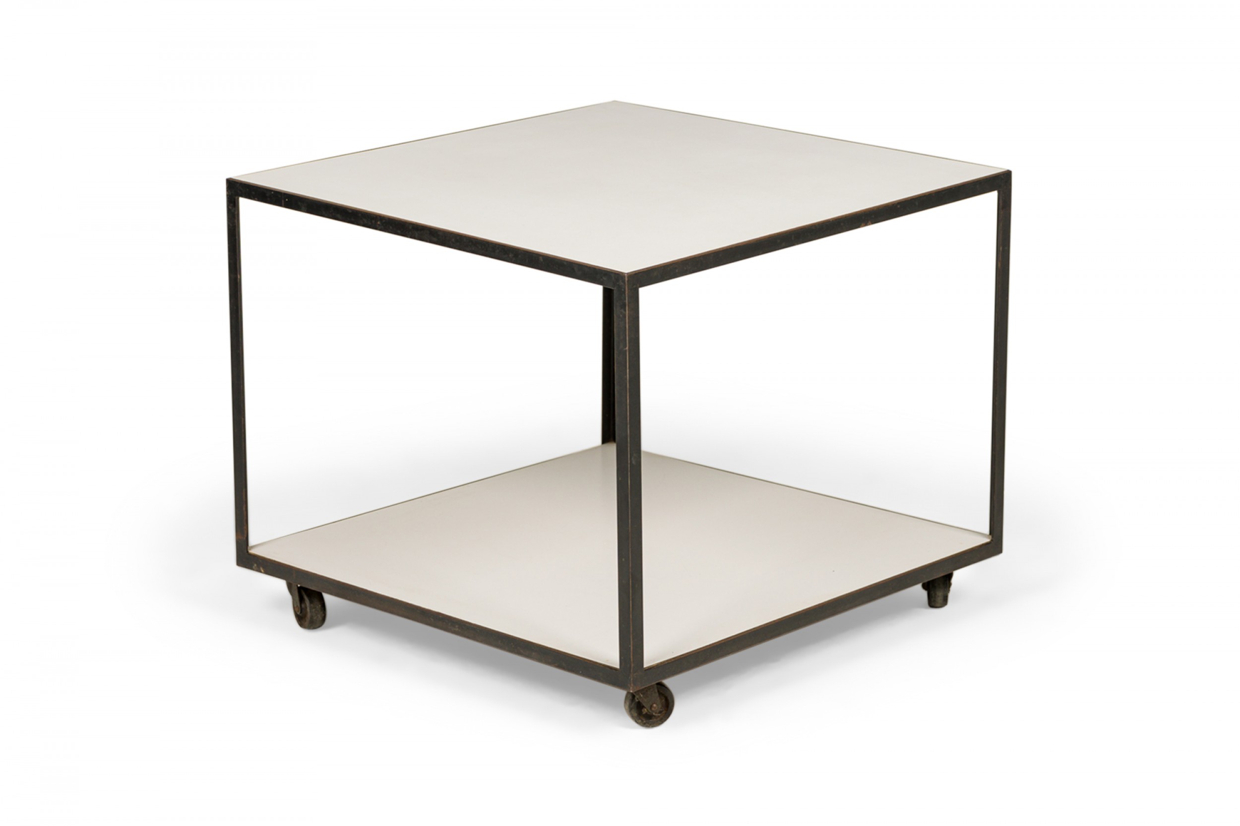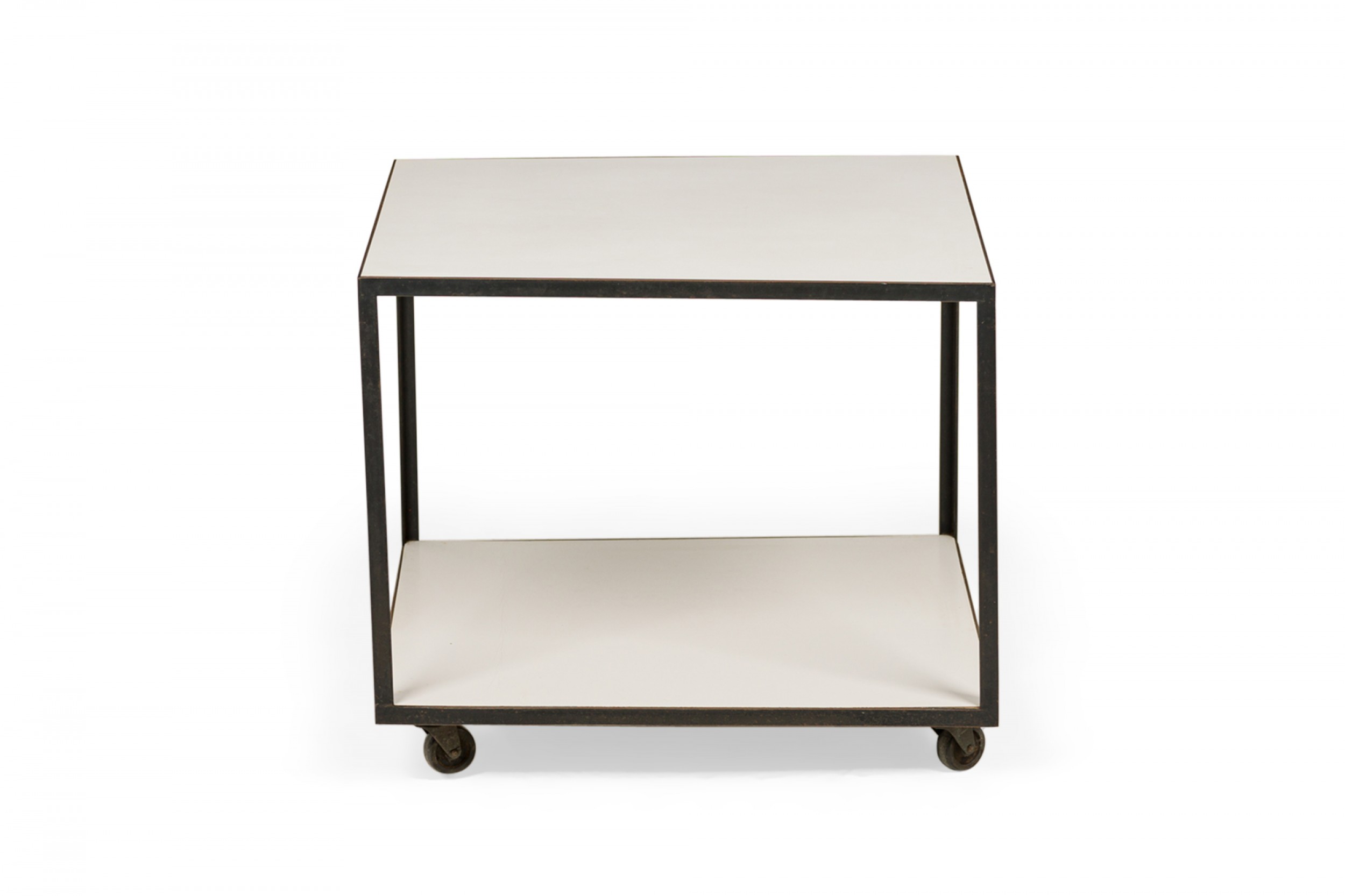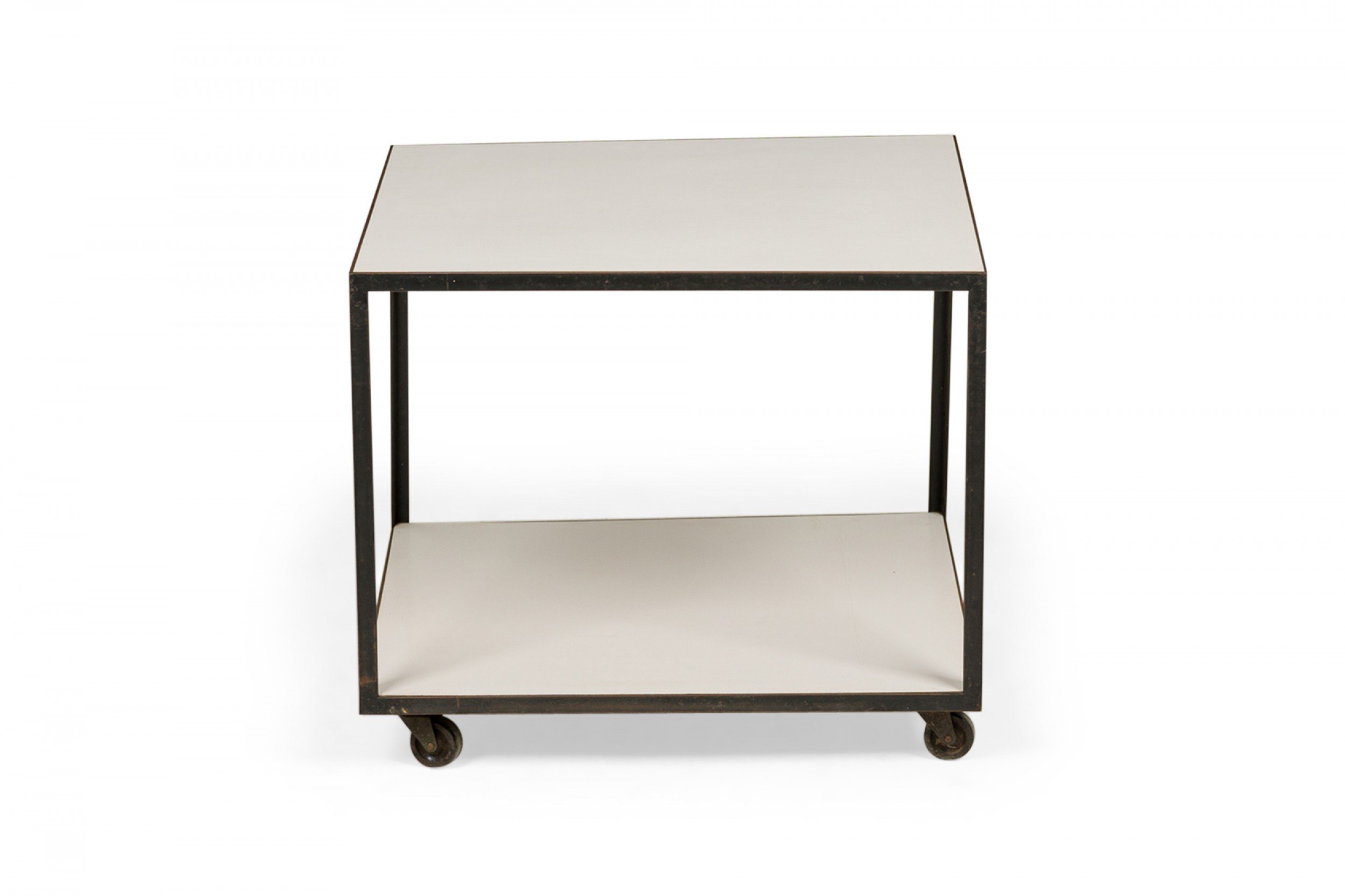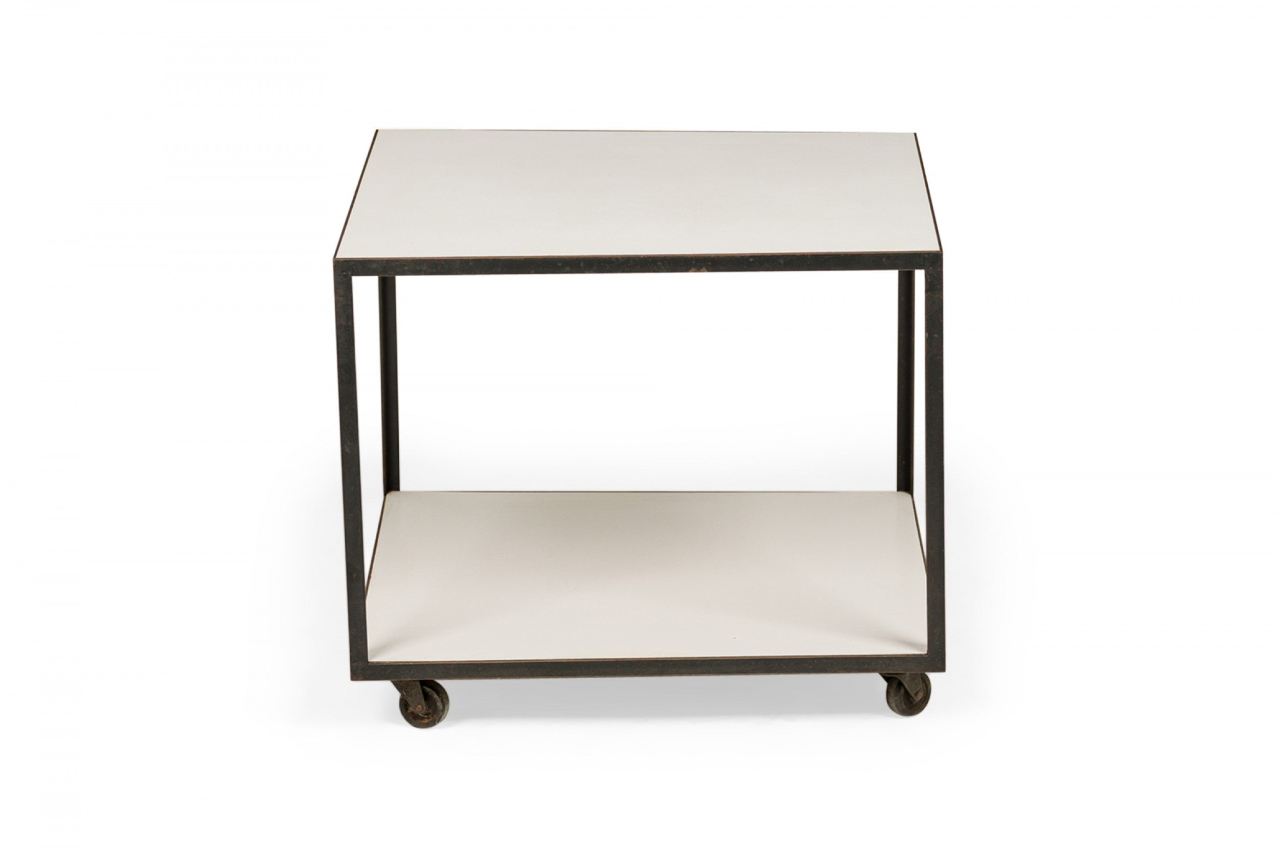 2 PAIRS of American Mid-Century rolling end / side tables with square white laminate tops and lower shelves contained in an open cube-form black coated steel frame, resting on four small casters. (GEORGE NELSON FOR HERMAN MILLER)(PRICED PER PAIR)