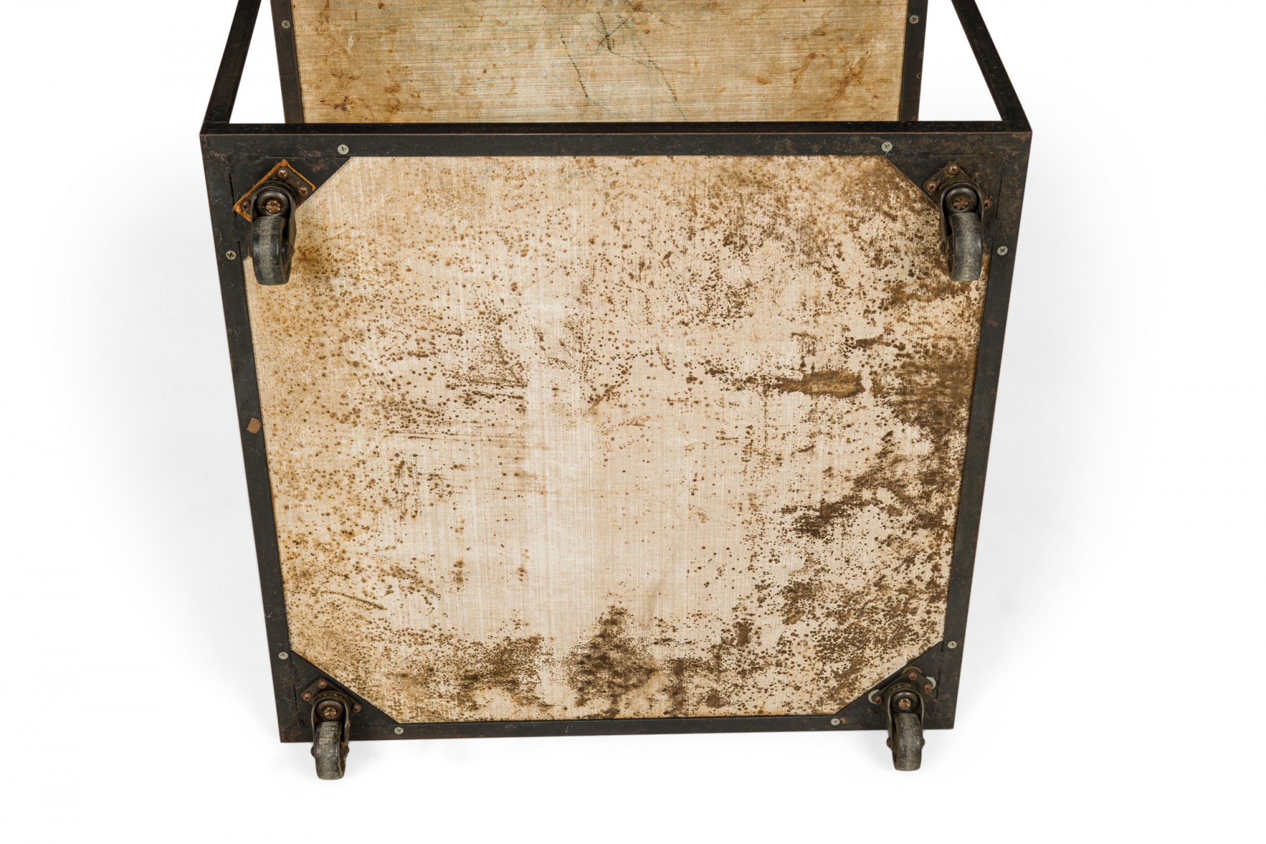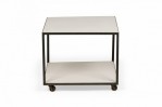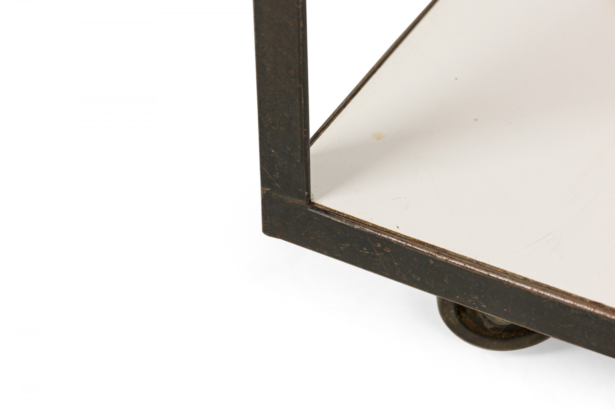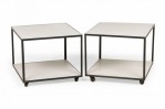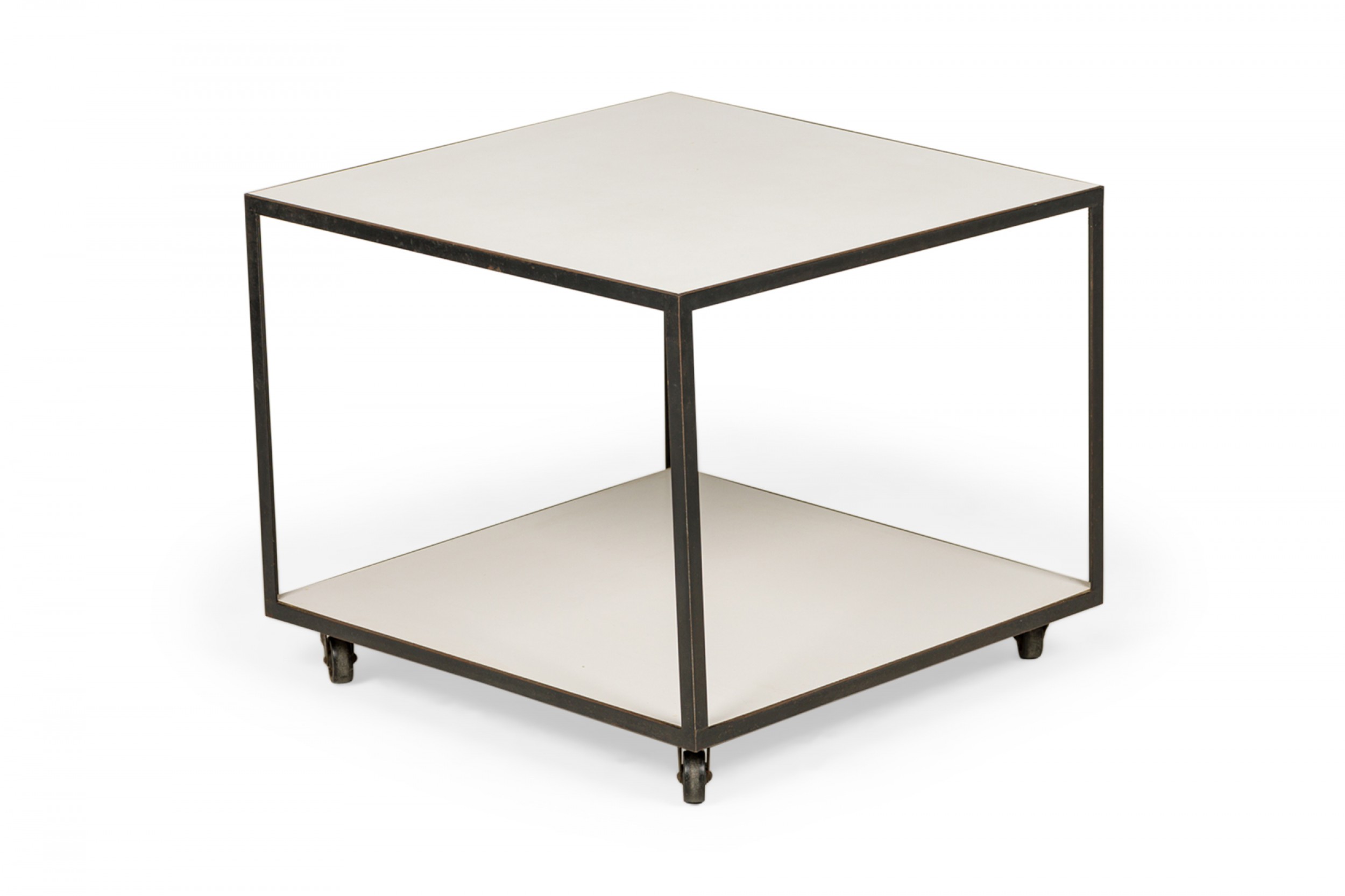 2 PAIRS of American Mid-Century rolling end / side tables with square white laminate tops and lower shelves contained in an open cube-form black coated steel frame, resting on four small casters. (GEORGE NELSON FOR HERMAN MILLER)(PRICED PER PAIR)