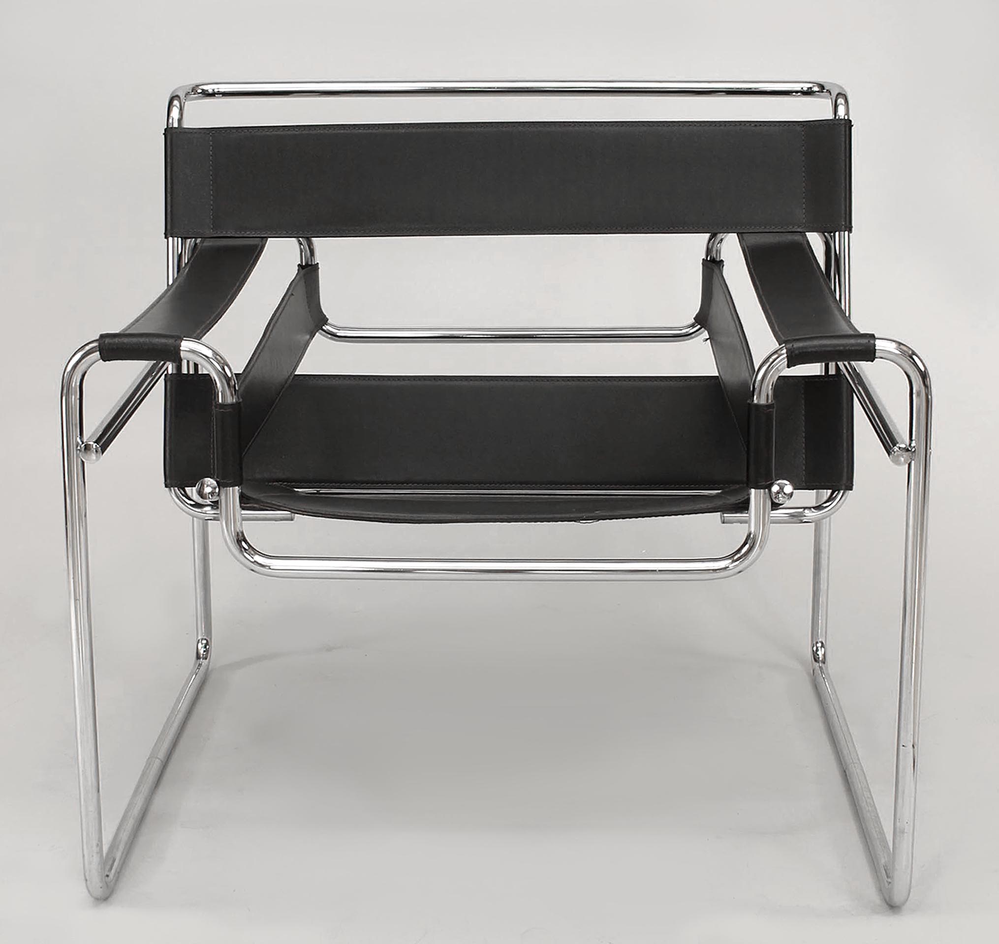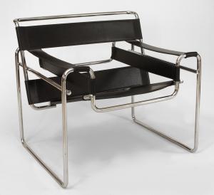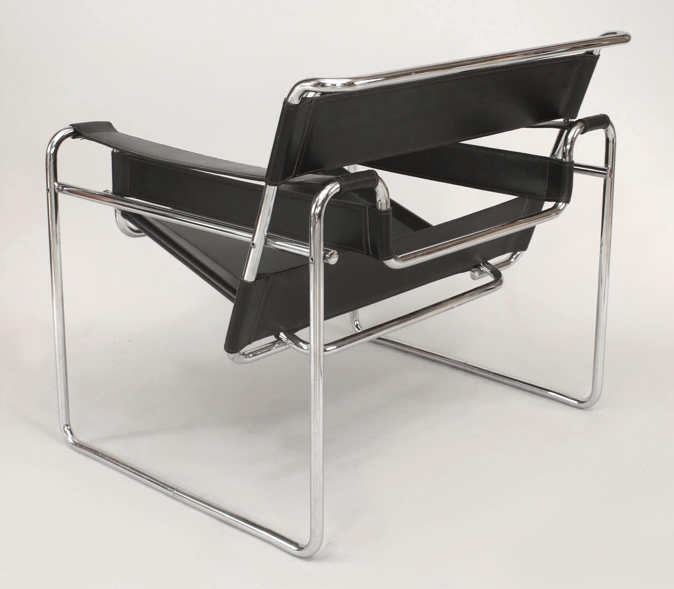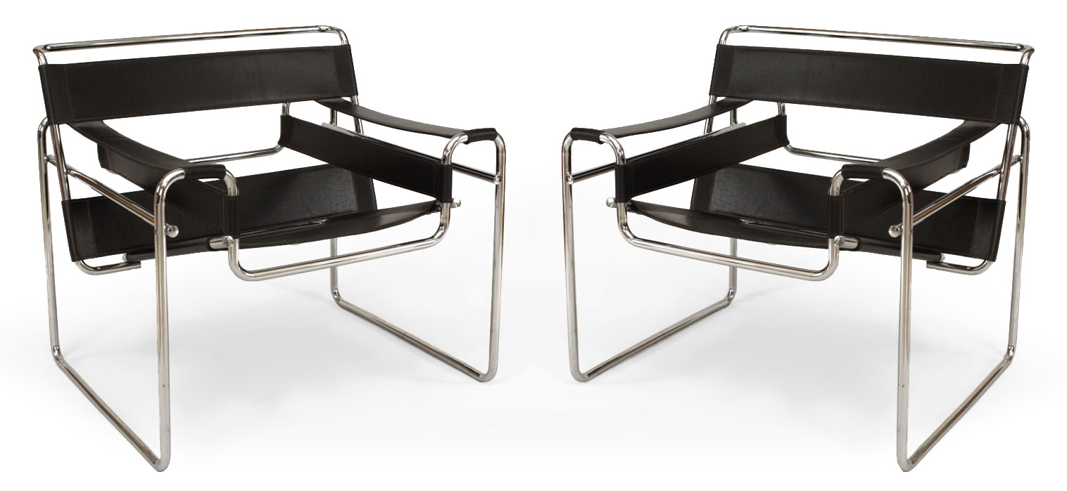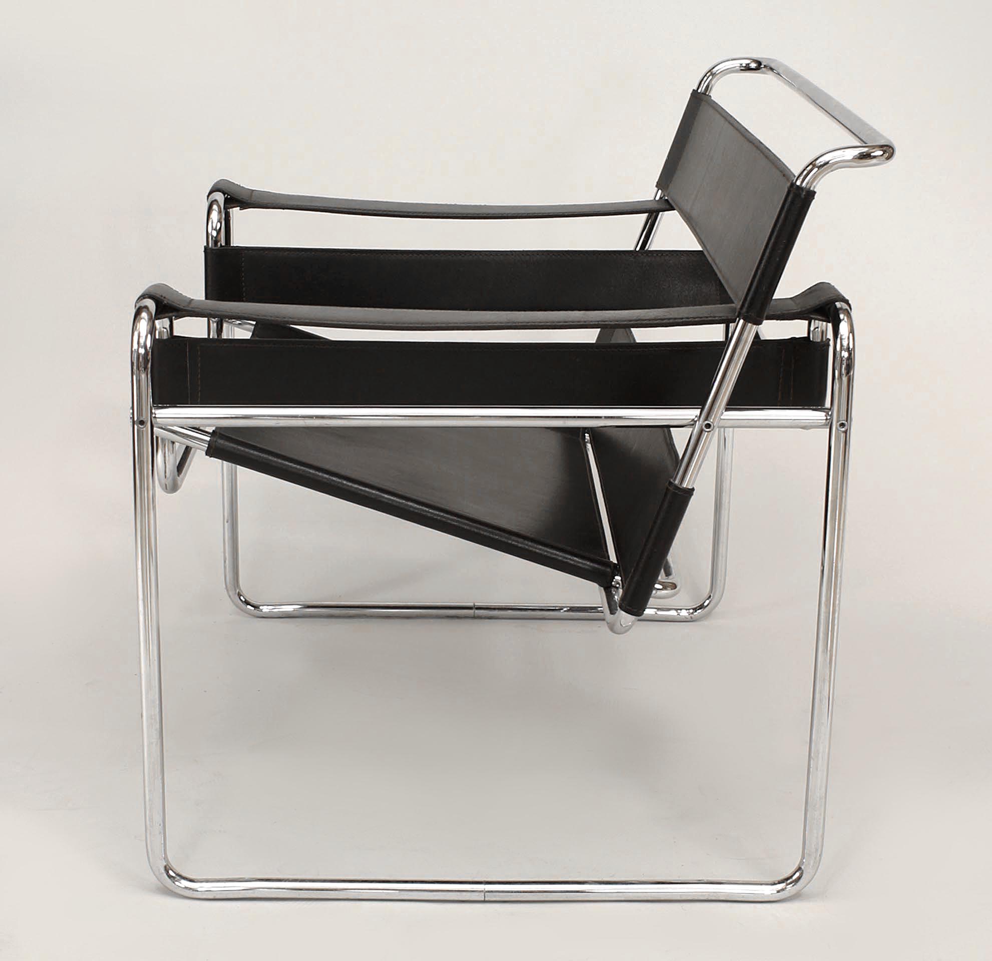 2 German 1920s-style (modern) chrome plated frame and black leather "Wassily" arm chairs (PRICED EACH).