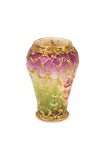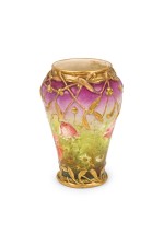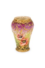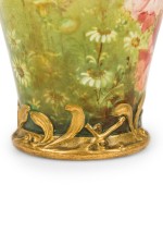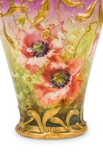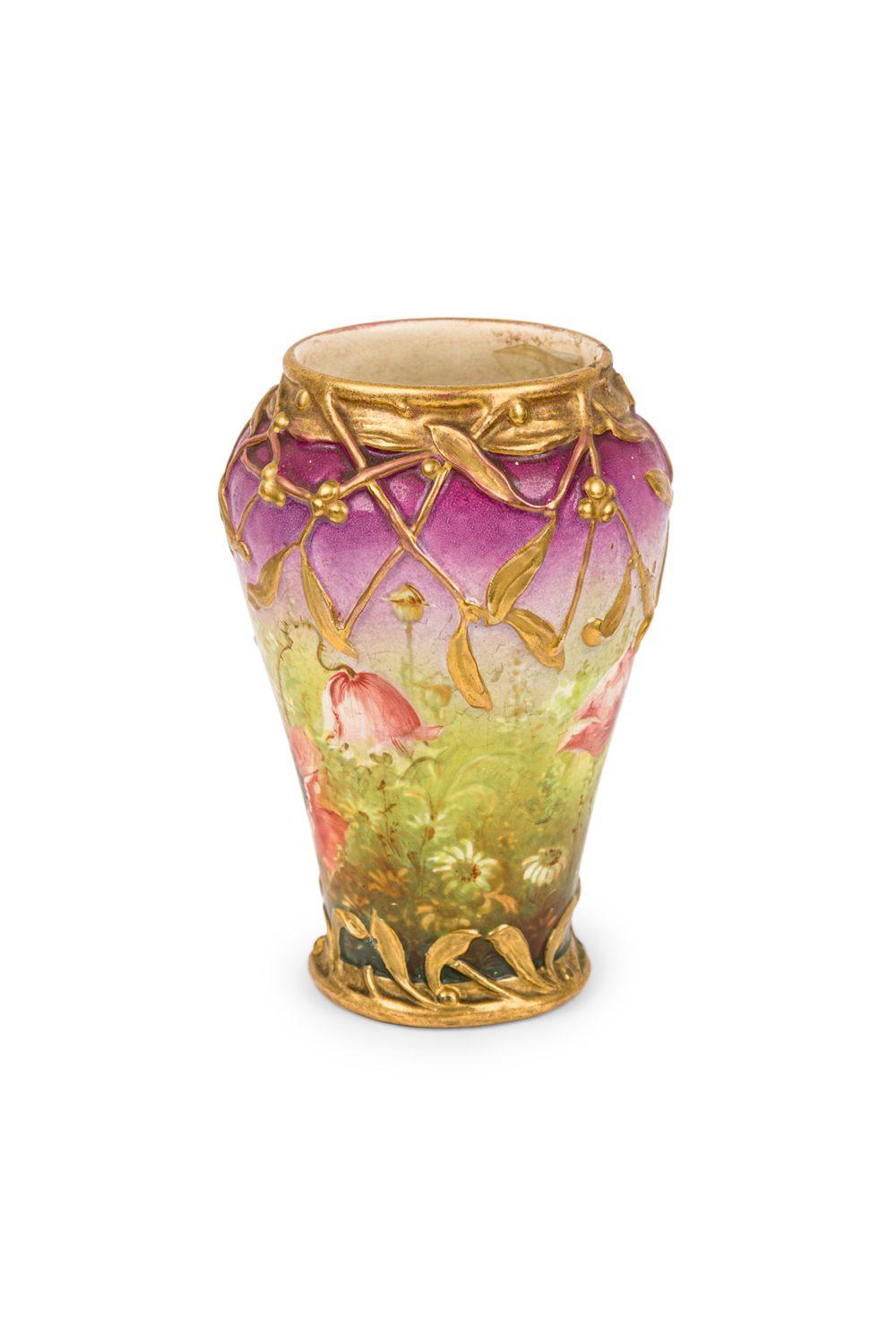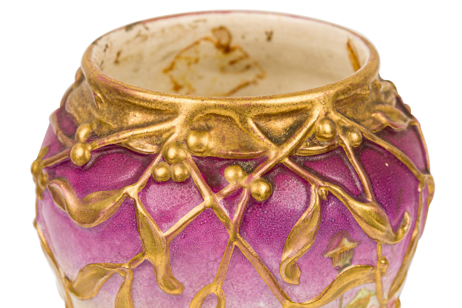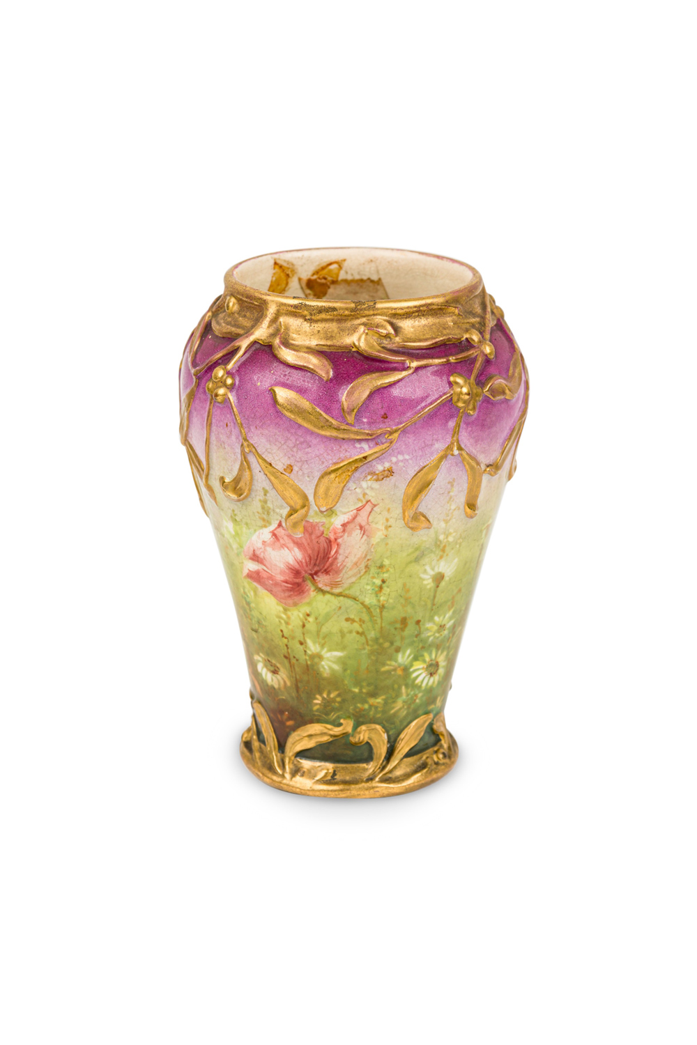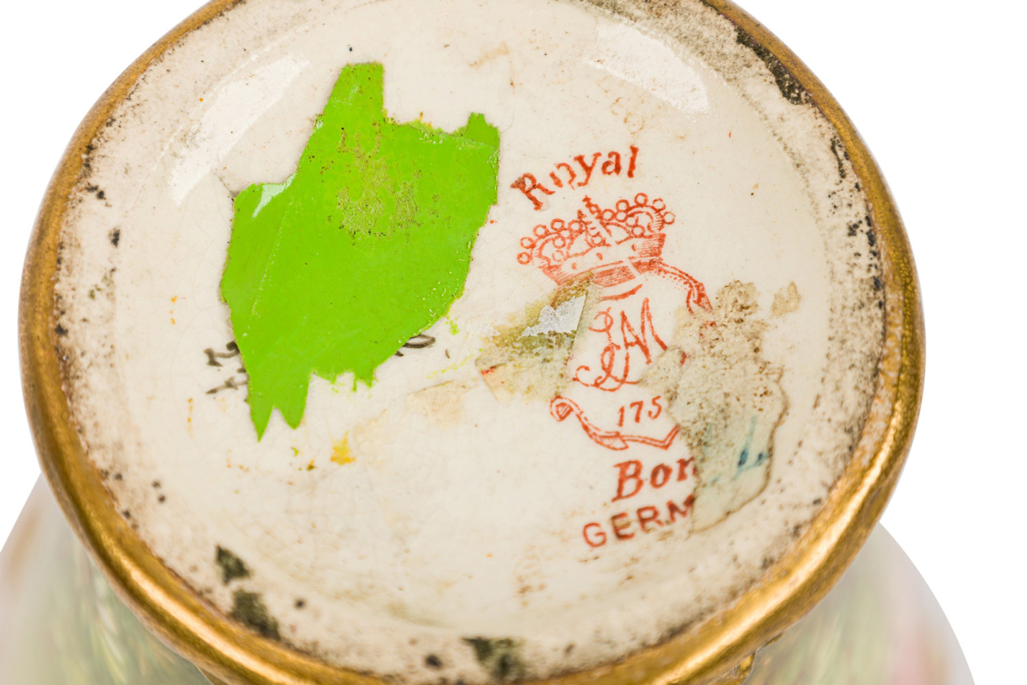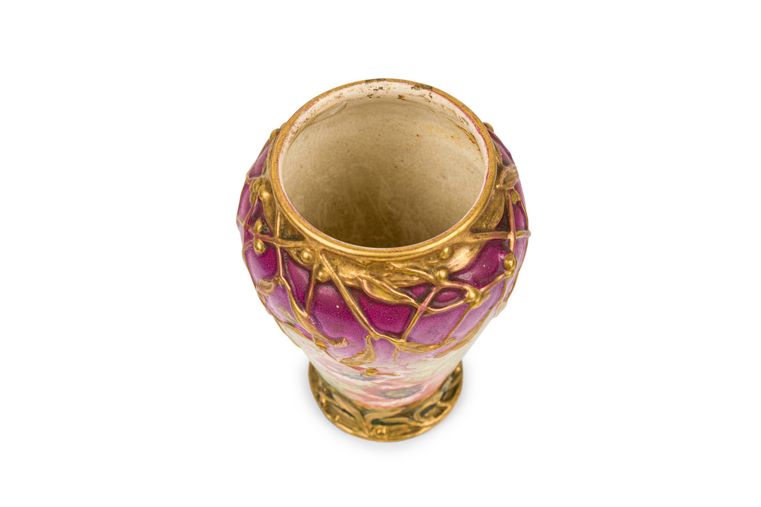 German (19th Cent) Royal Bonn pink and green porcelain shaped vase with floral design and gilt trim..