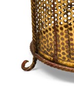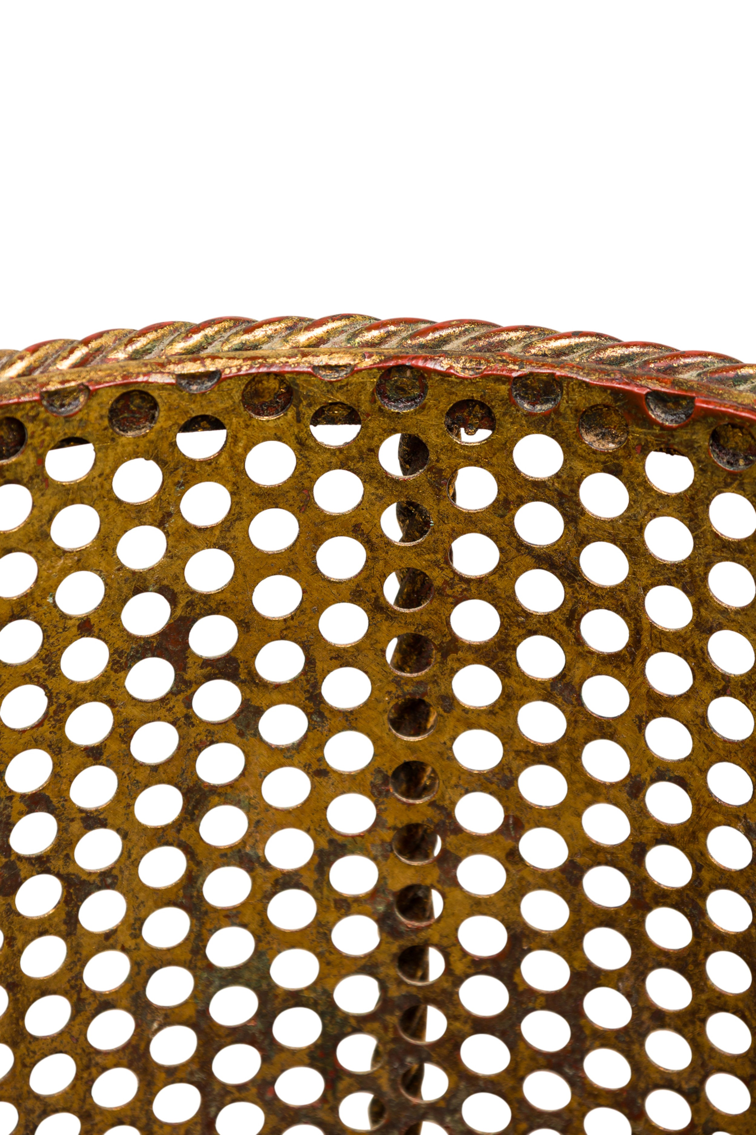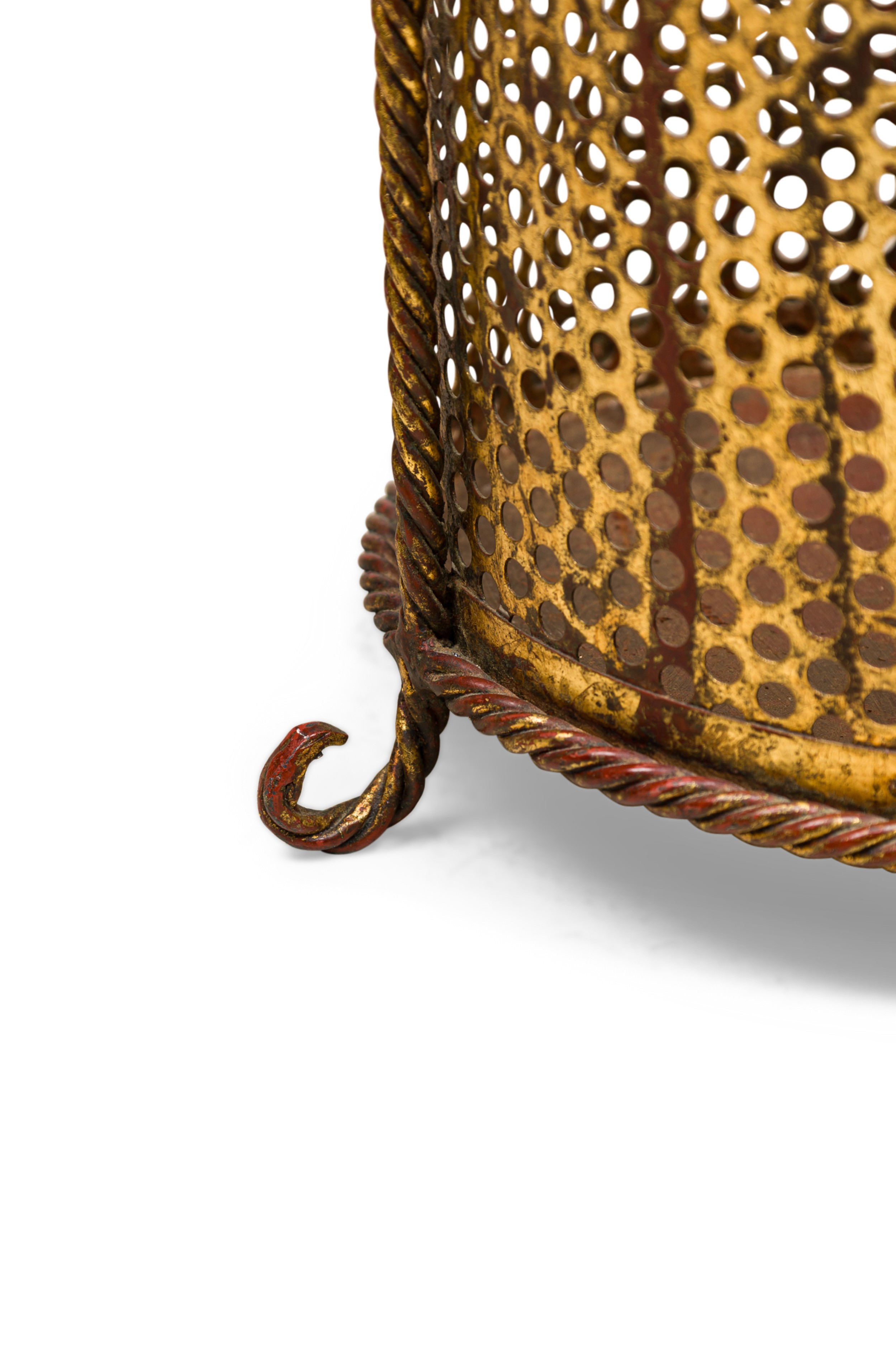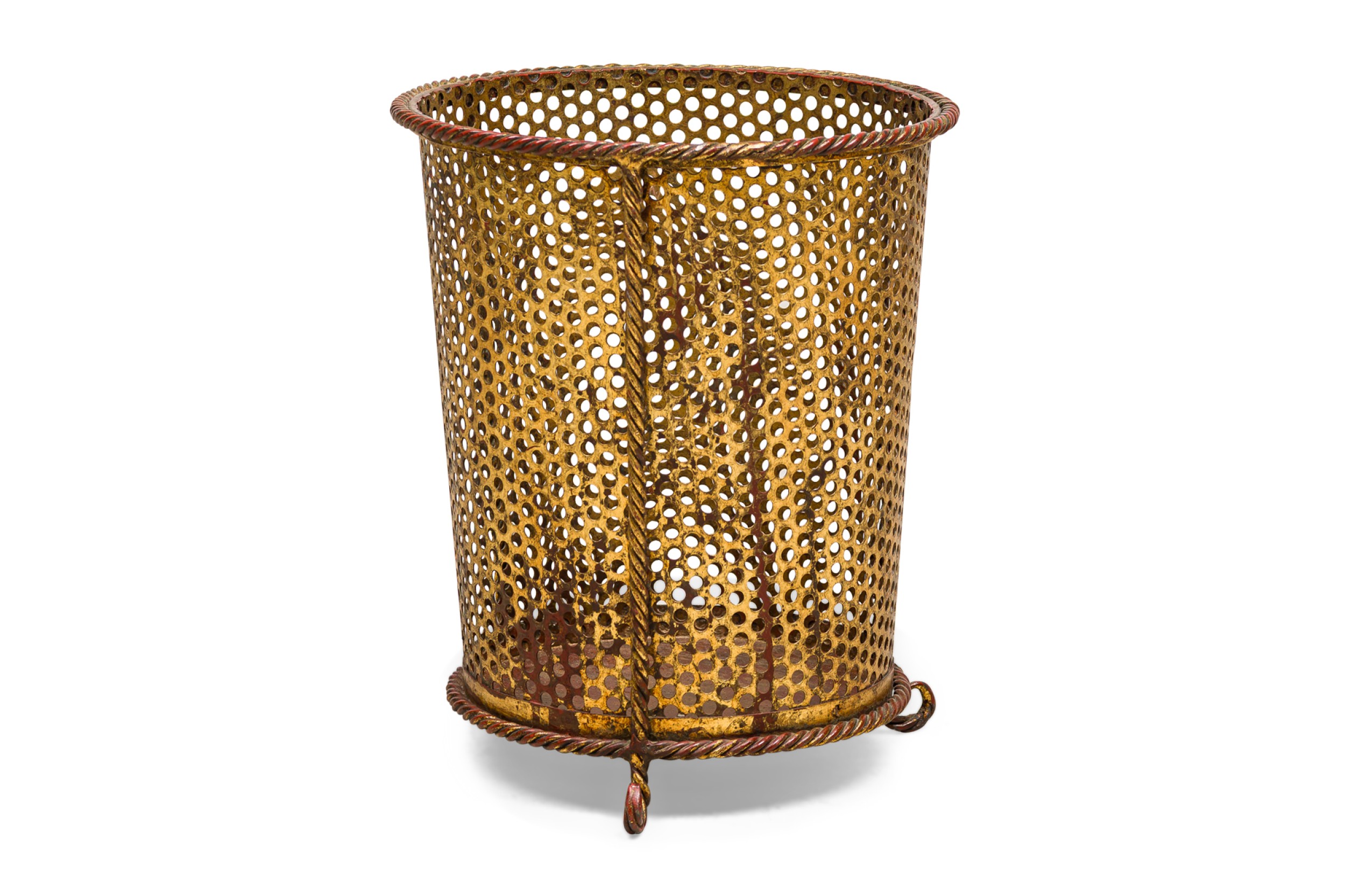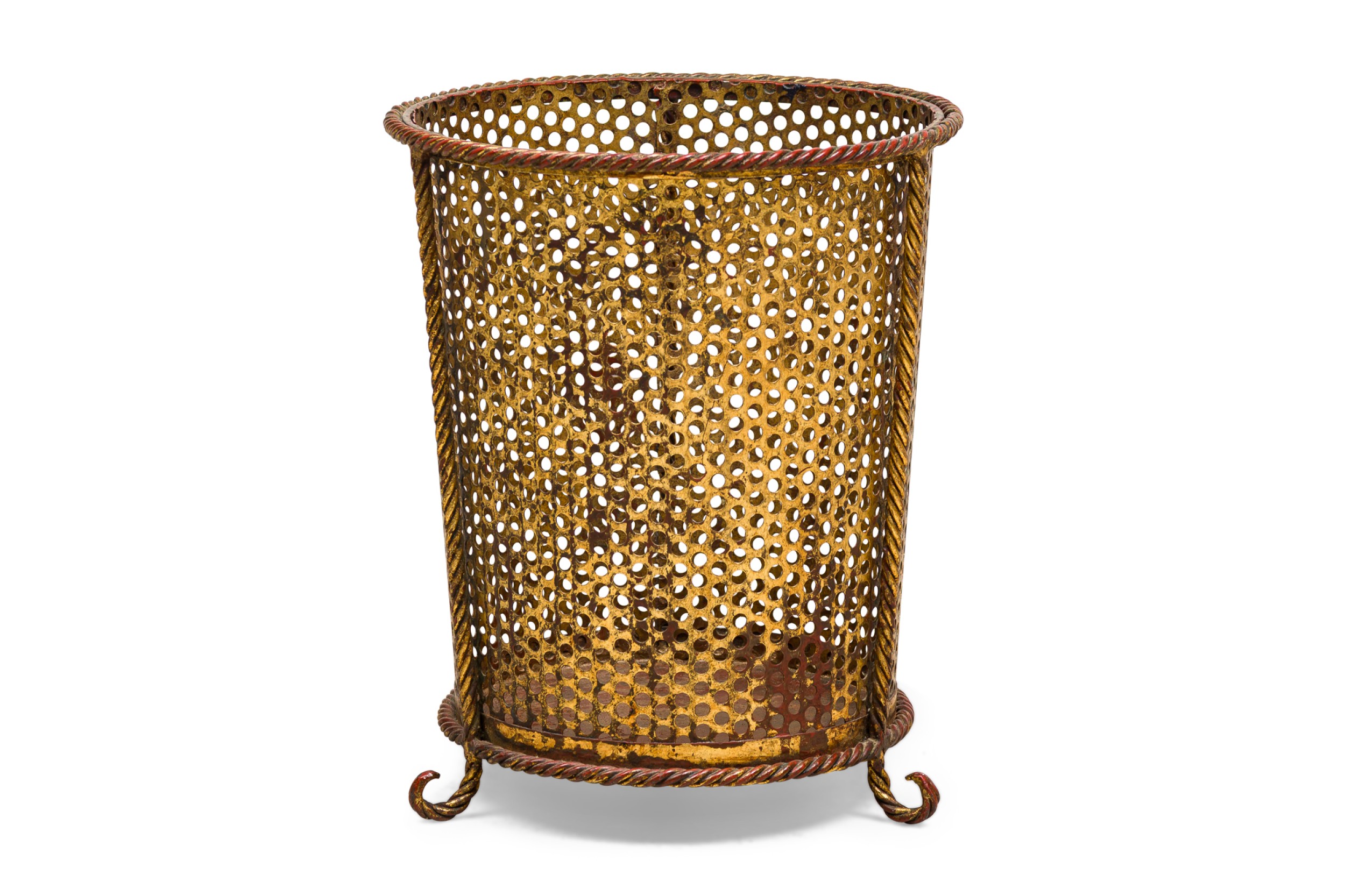 Italian Mid-Century gilt metal rope trim round waste paper basket with perforated frame resting on 3 scroll feet