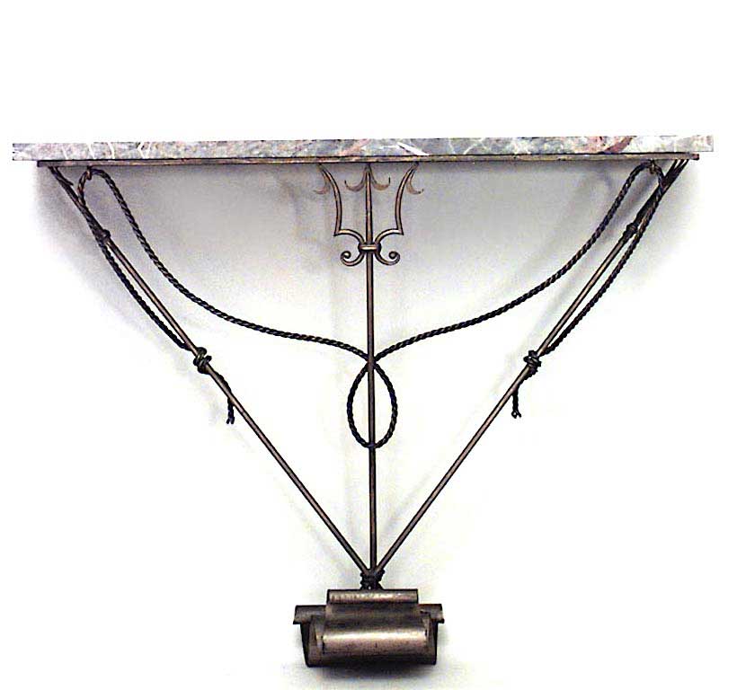 Italian Mid-Century (1940s) style gilt iron console table with rectangular grey marble top on a trident & rope twist base.