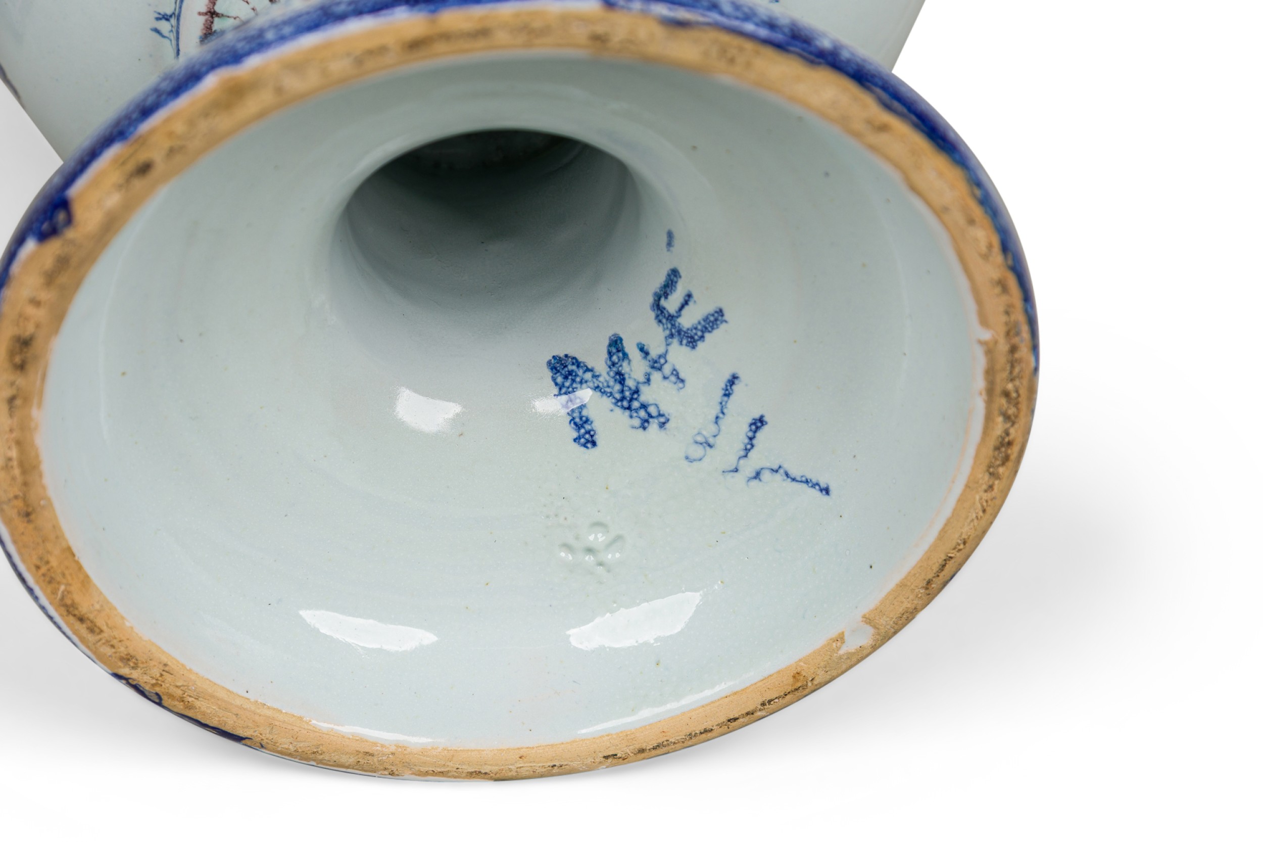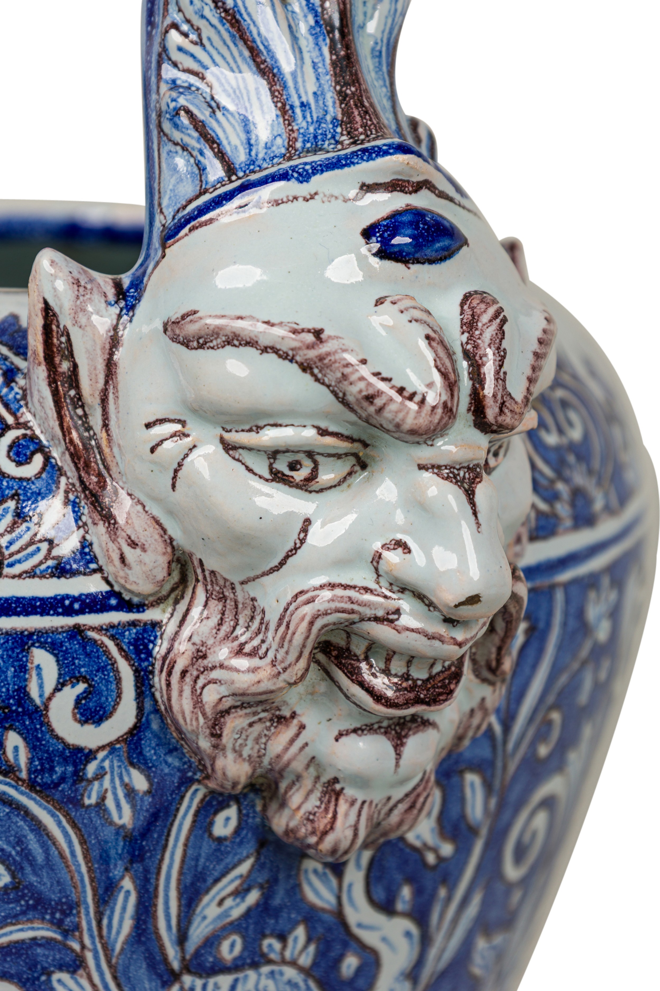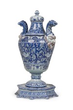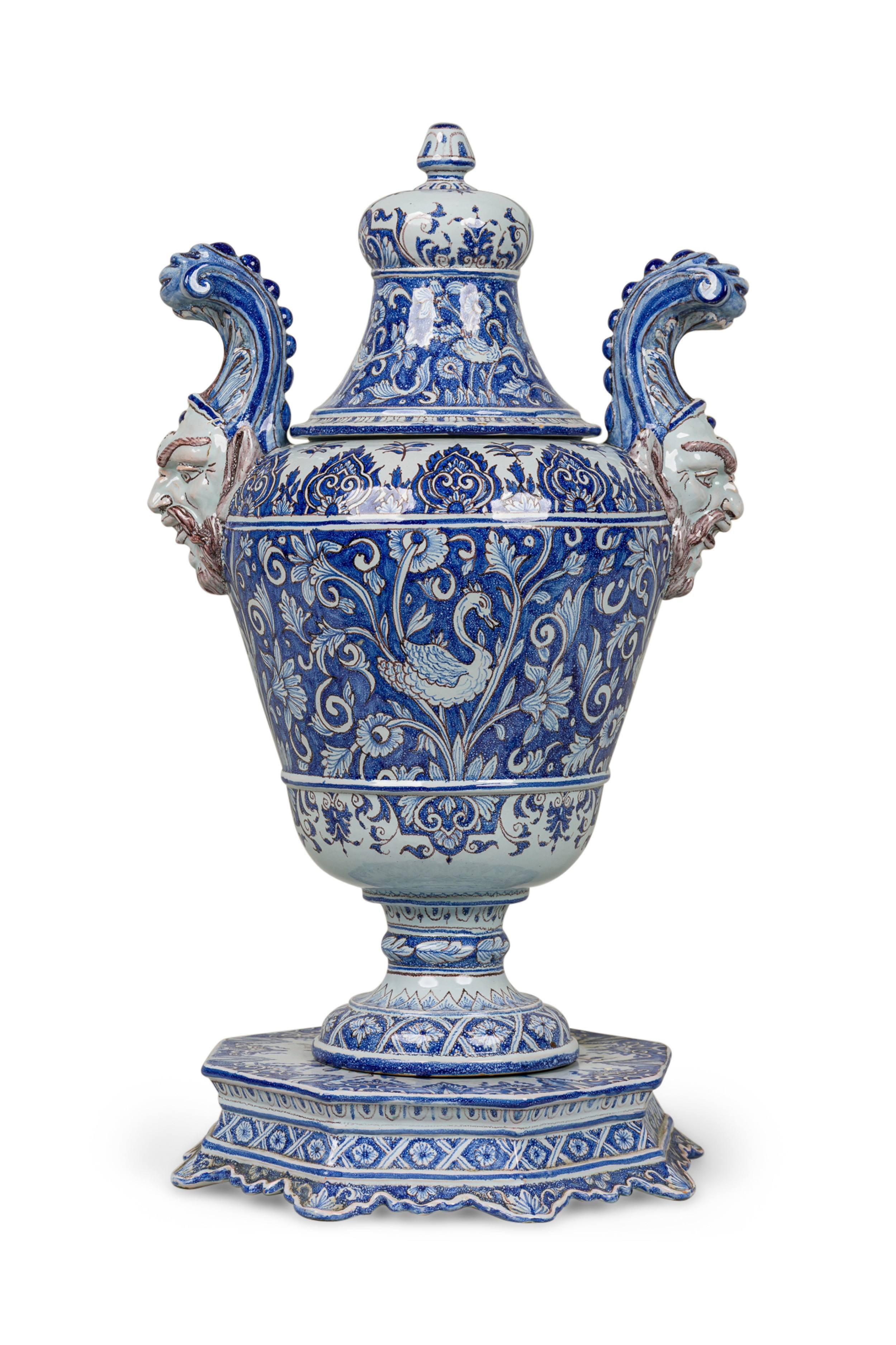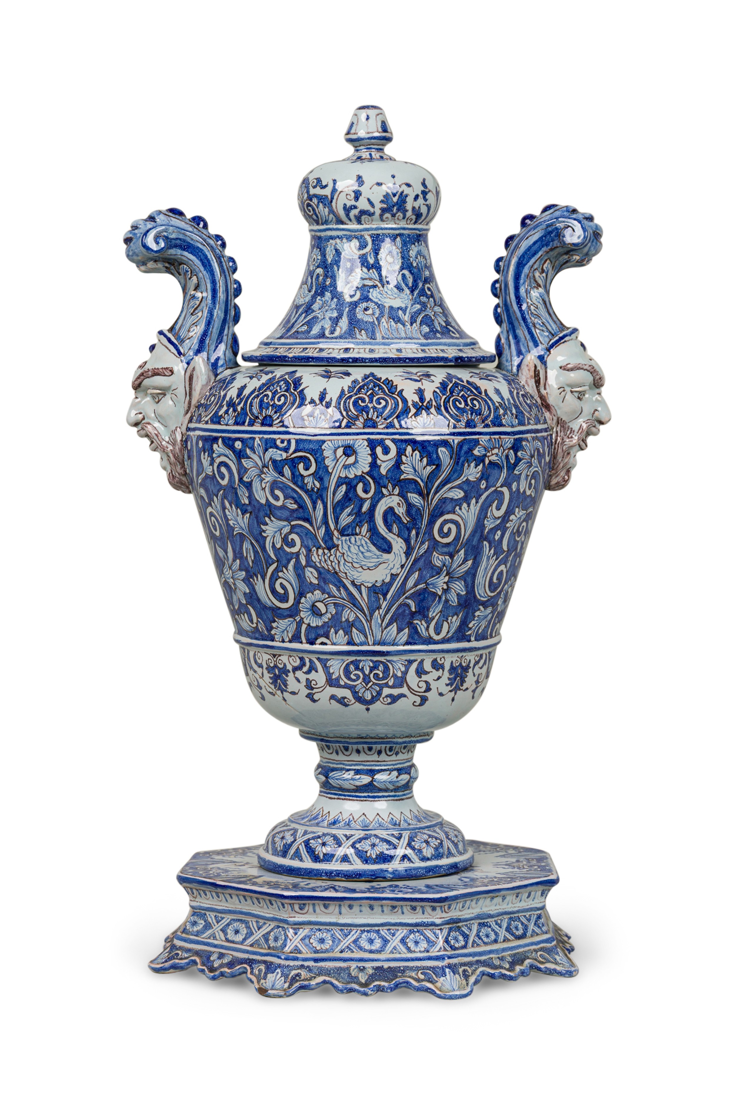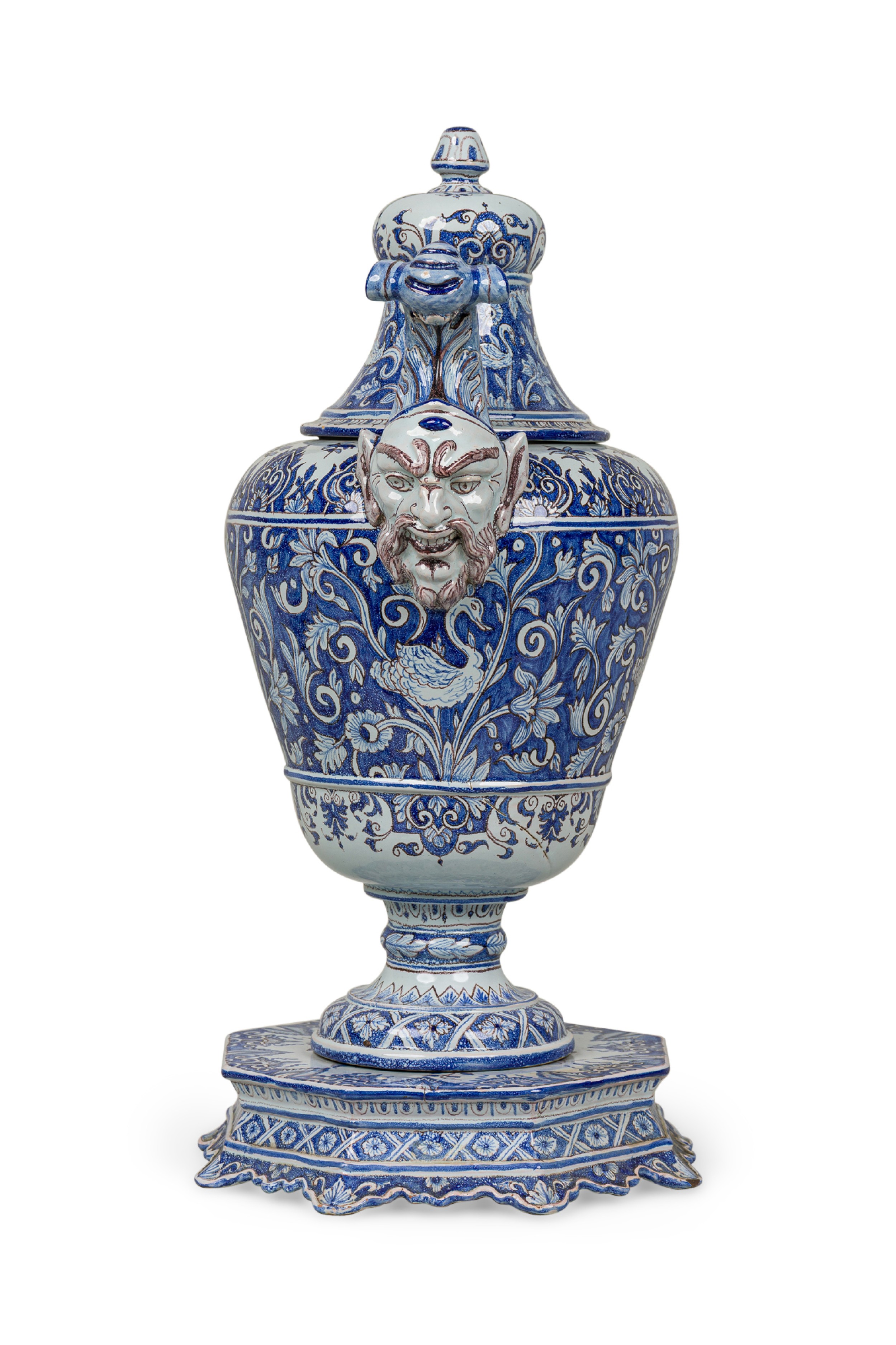 Italian Baroque style (19th Century) large blue and white floral, scroll, and bird decorated porcelain vase with saytr head handles and a cover standing on an octagonal base (3 sections) (marked: N E).