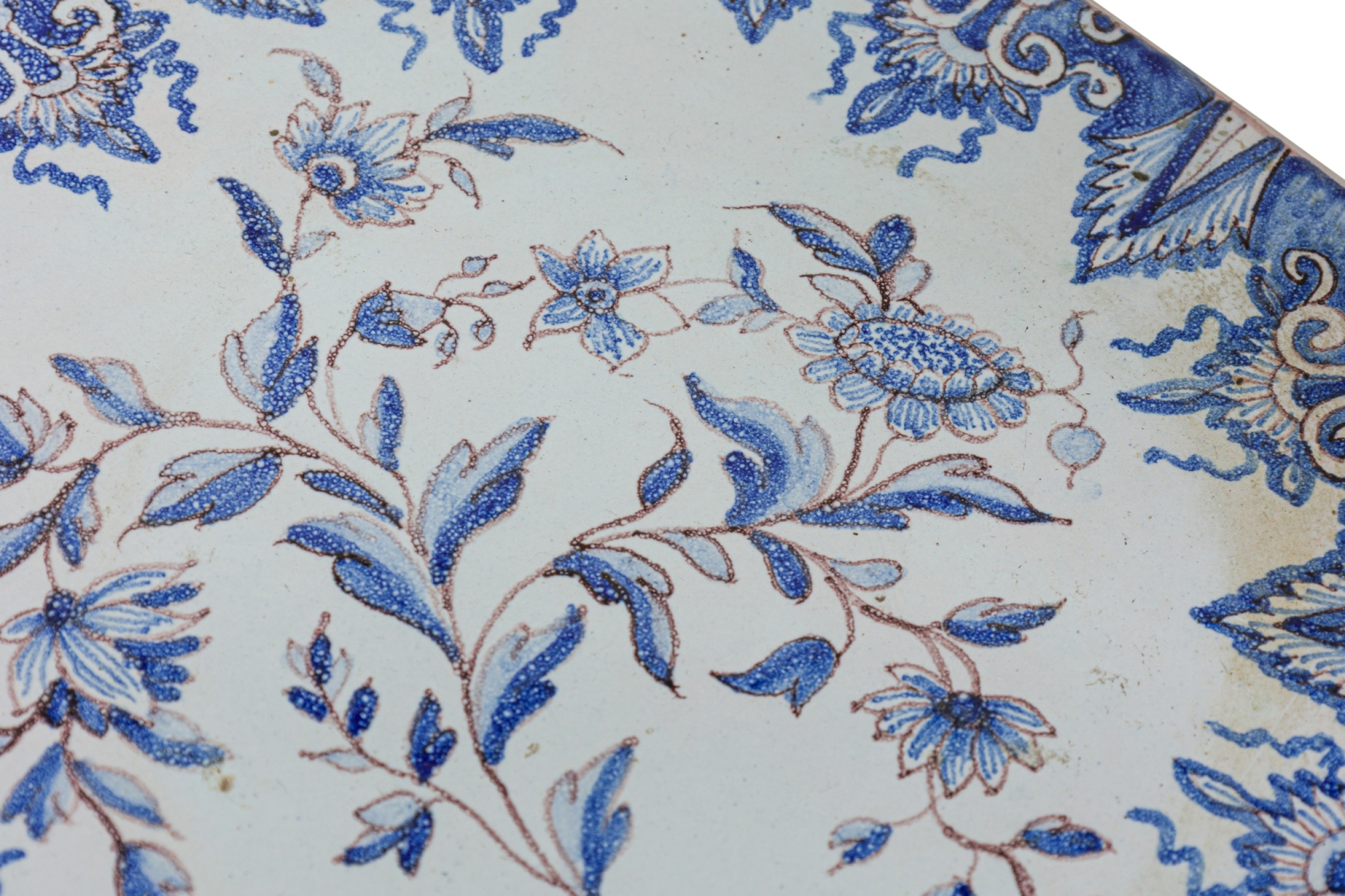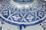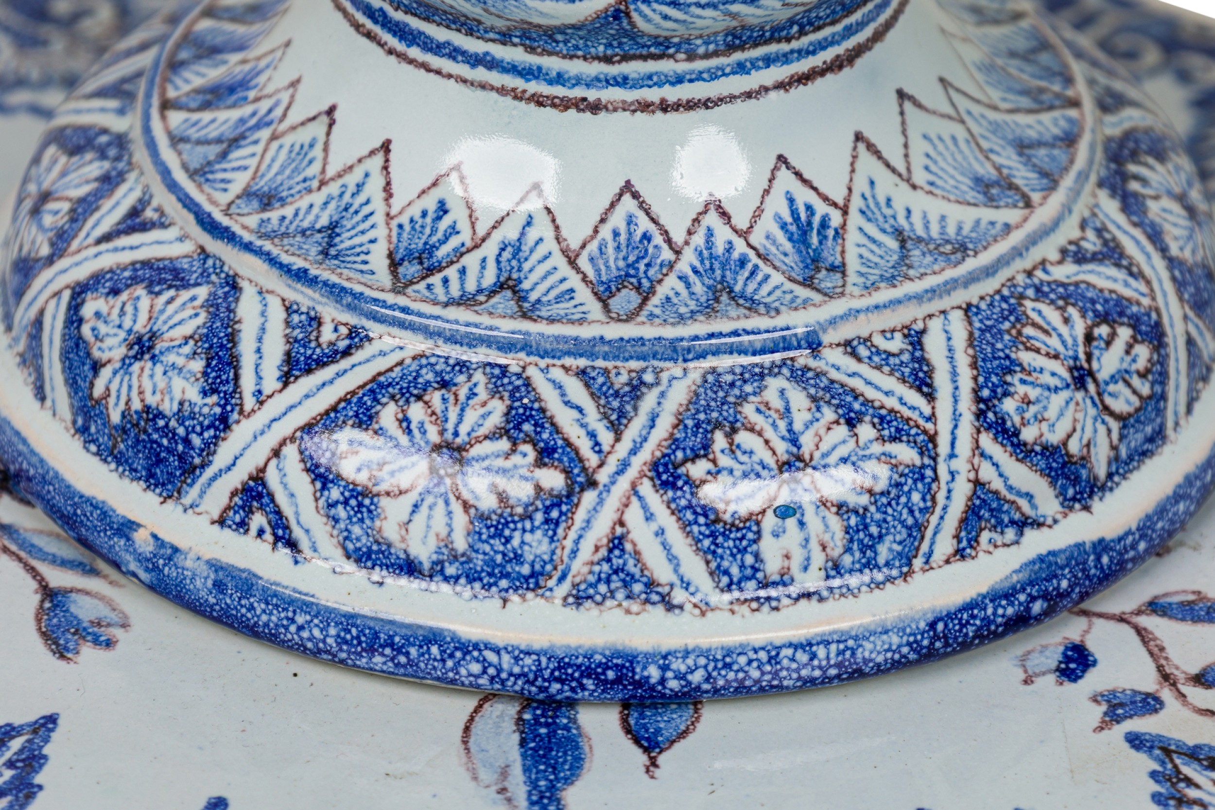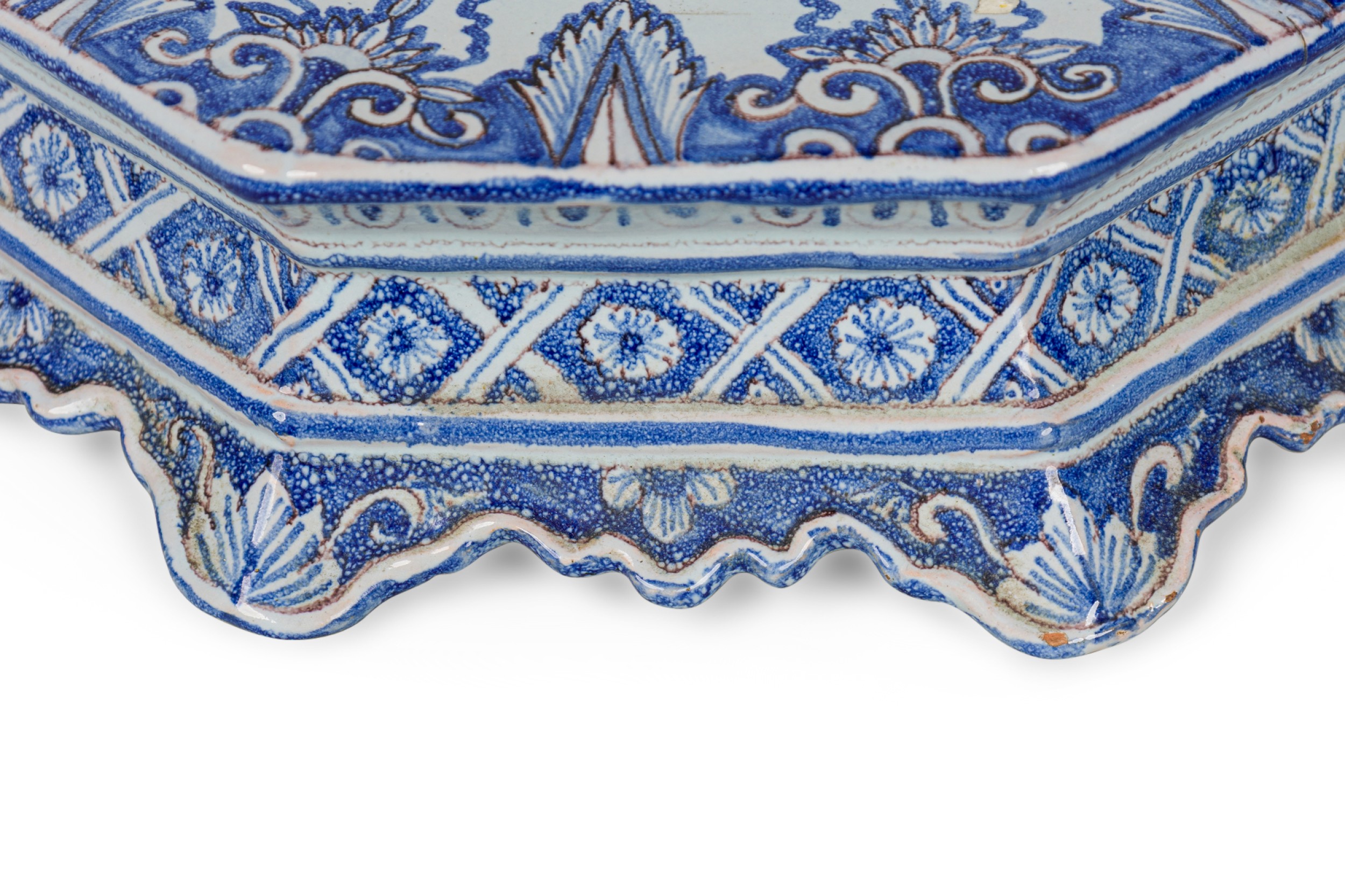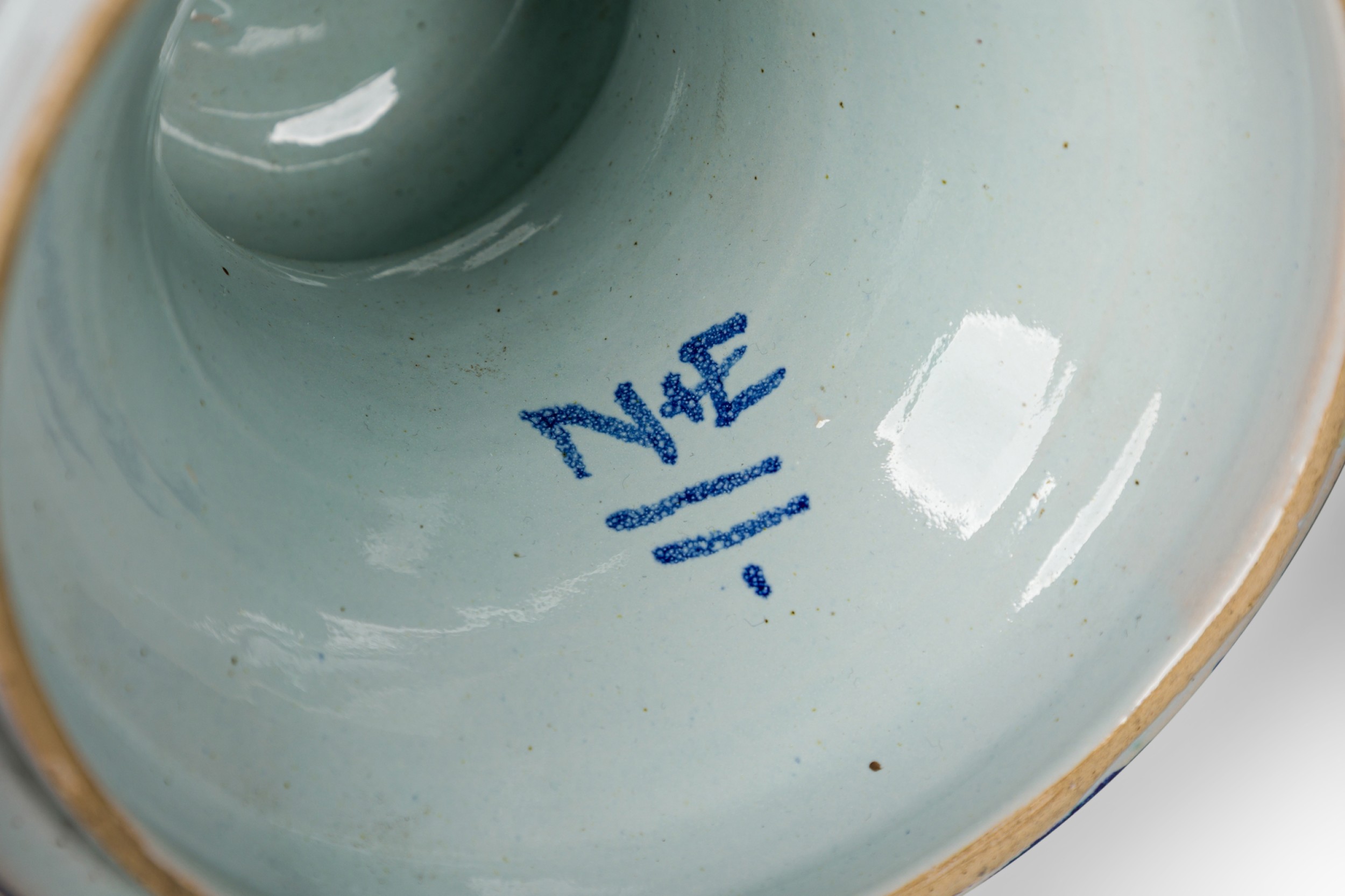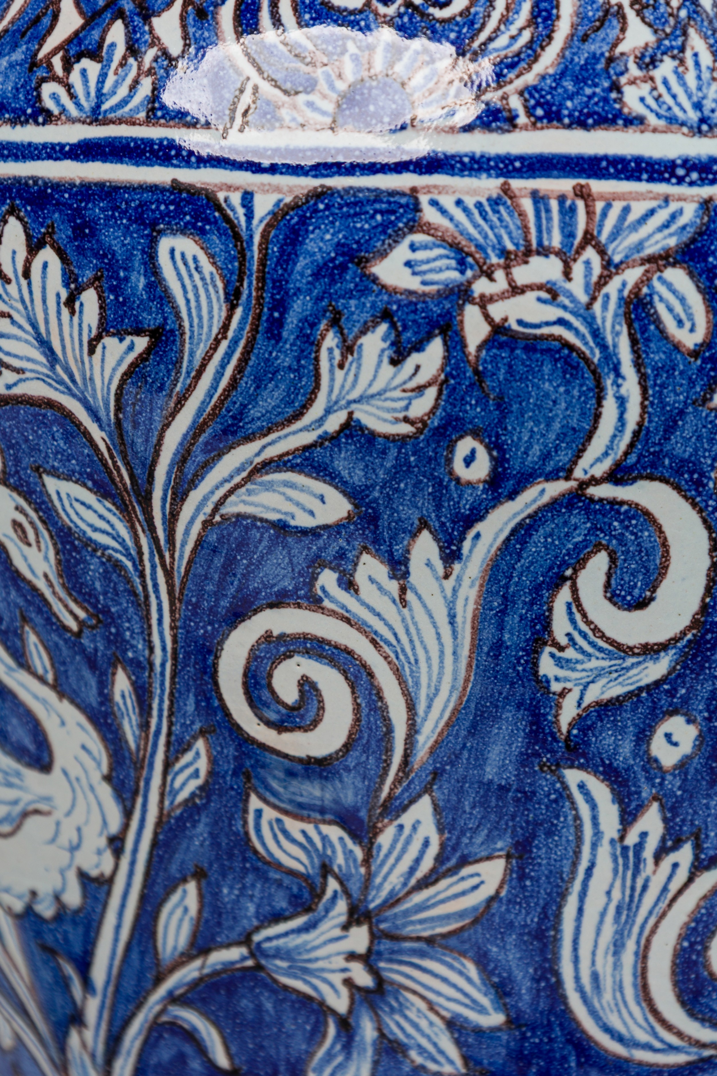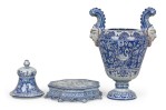 Italian Baroque style (19th Century) large blue and white floral, scroll, and bird decorated porcelain vase with saytr head handles and a cover standing on an octagonal base (3 sections) (marked: N E).