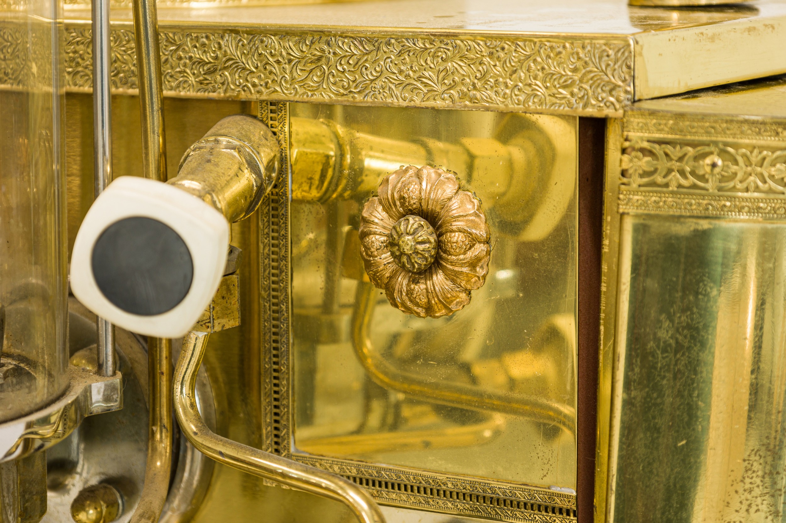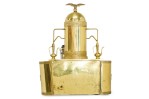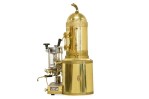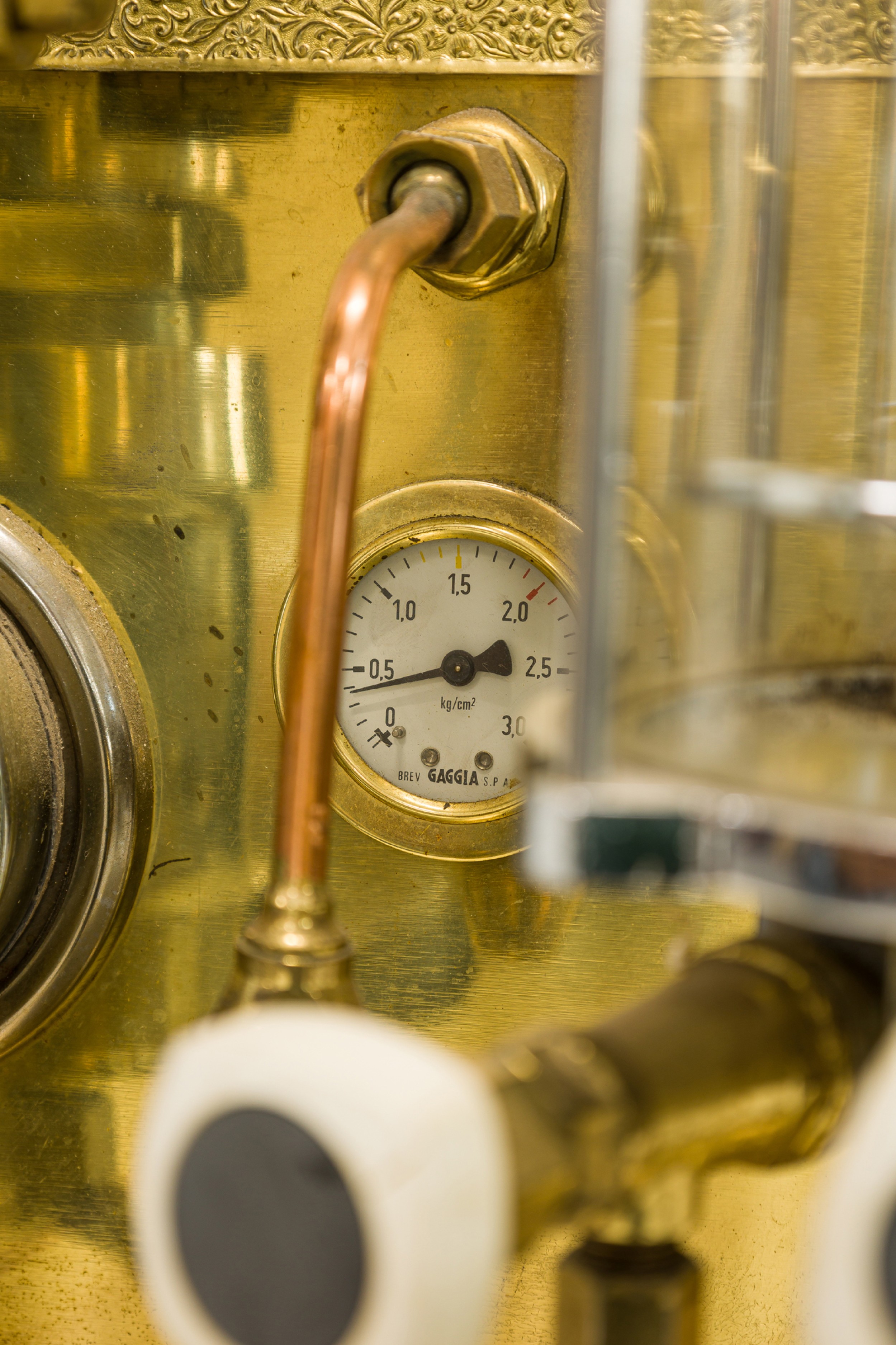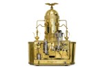 Italian Mid-Century brass professional cappuccino machine with a variety of gauges, dials and operatic devices and topped with a decorative eagle finial (GAGGIA Orione 1G-U) (ABC DELUXE)
