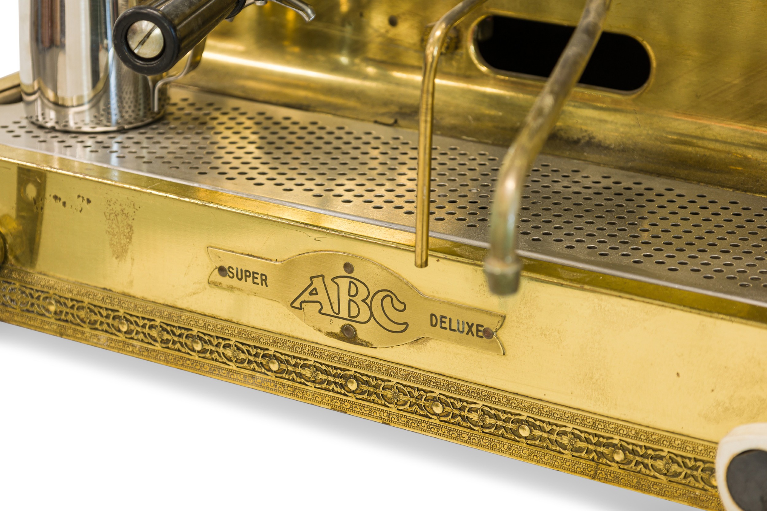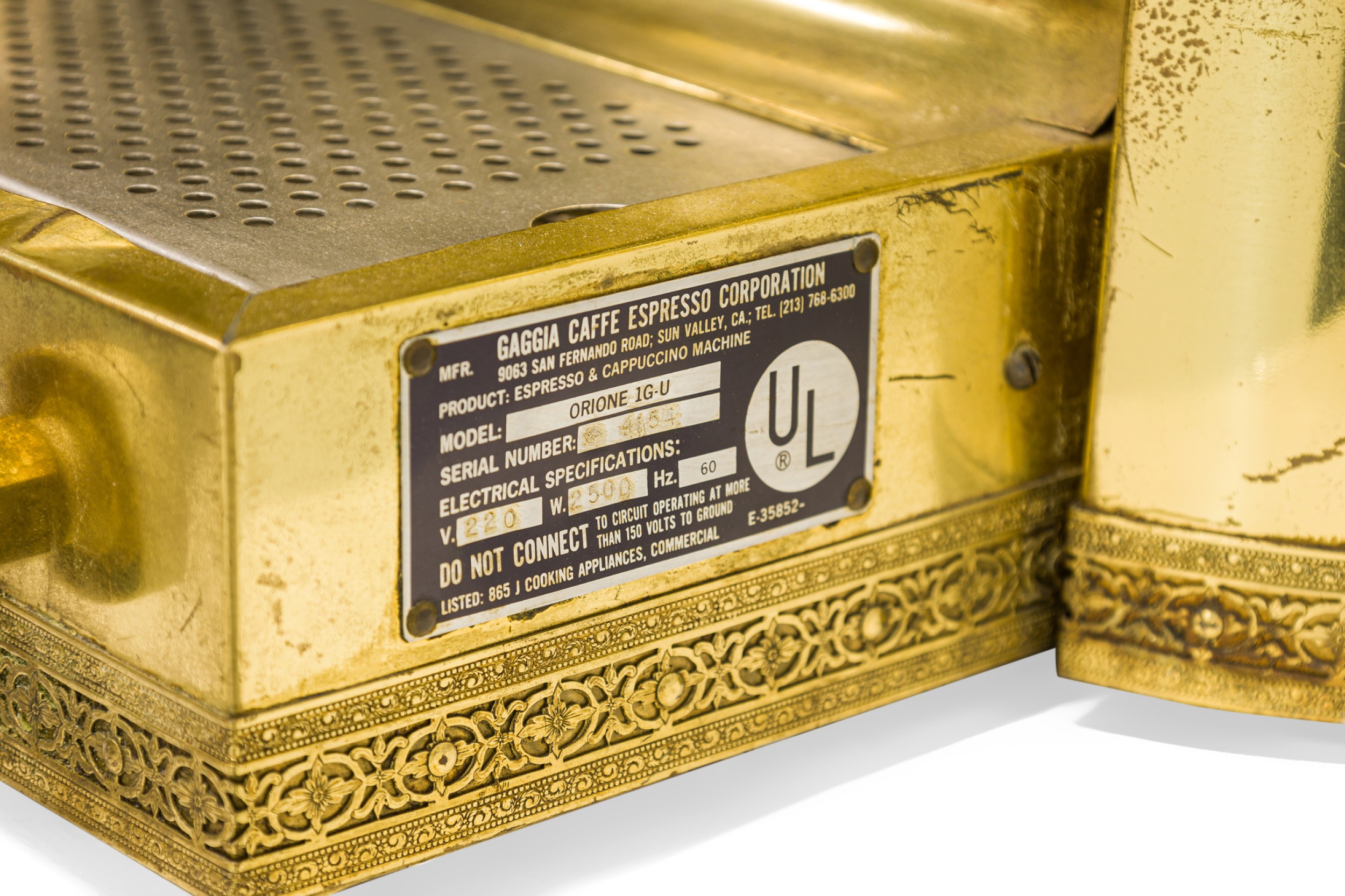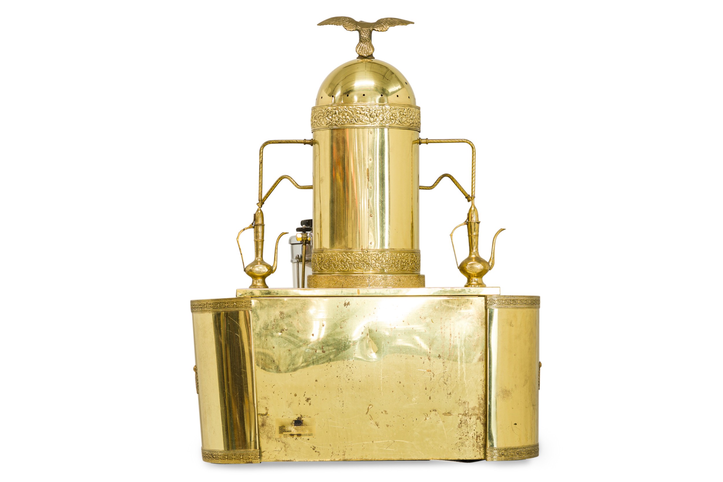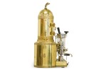 Italian Mid-Century brass professional cappuccino machine with a variety of gauges, dials and operatic devices and topped with a decorative eagle finial (GAGGIA Orione 1G-U) (ABC DELUXE).