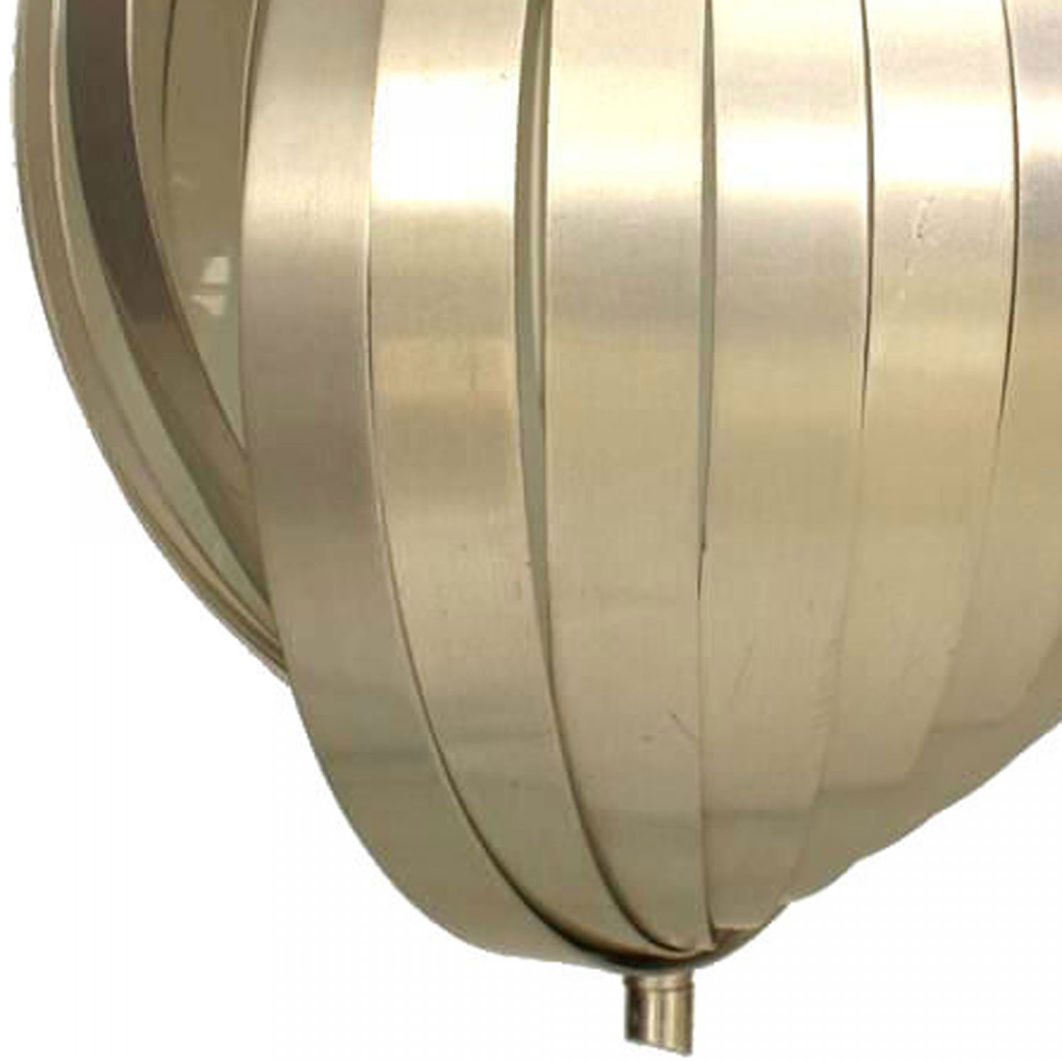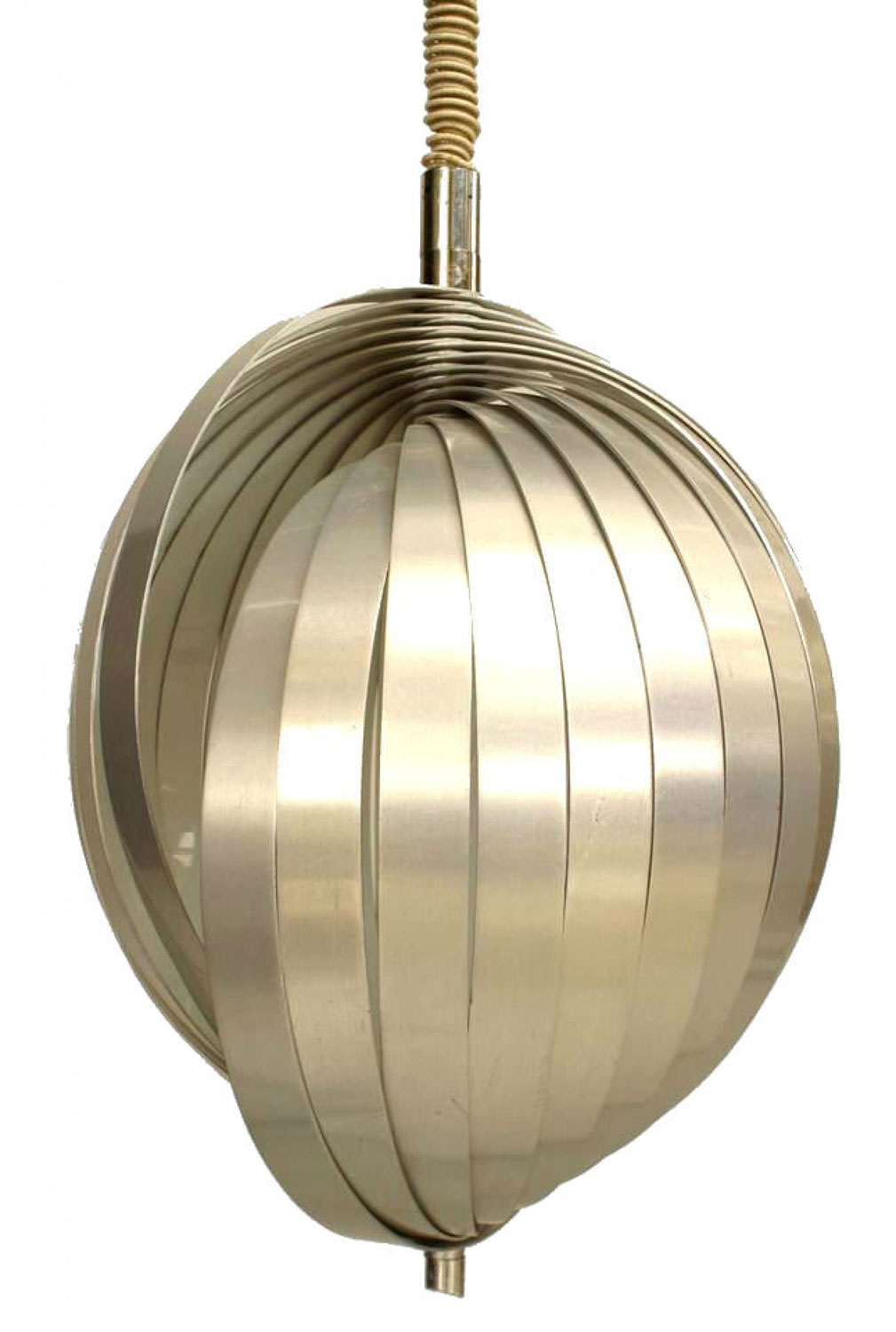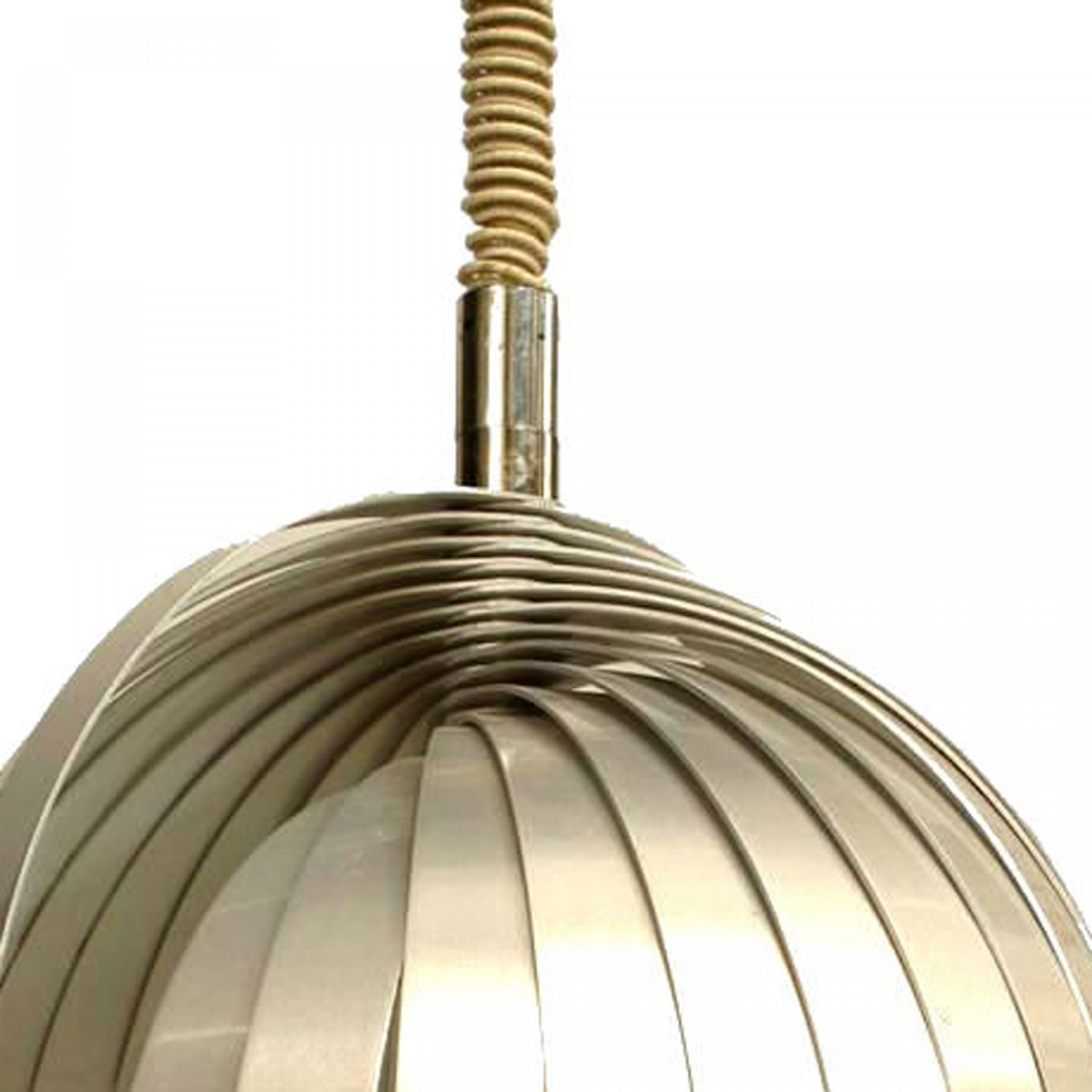 Italian 1950s lantern with metal circular slat design suspended from a fabric stem with a cylindrical metal canopy (attributed to REGGIANI)..