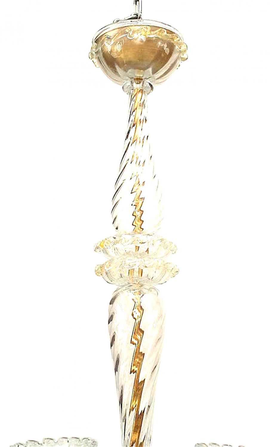 Italian (1940's) Murano chandelier with 6 swirl design gold dusted glass arms holding a large fluted clear bubble glass shade with scalloped top. (att: BAROVIER ET TOSO)